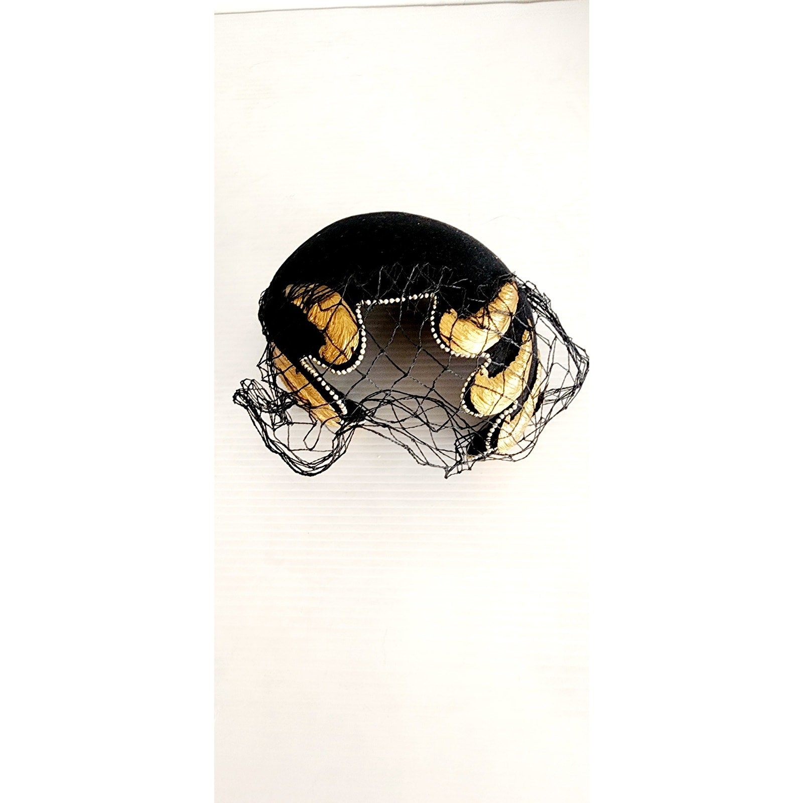 Black wool, head hugging hat shaped to conform to your head, the perimeter at the front sides is delineated in gold hammered, feather shaped panels - large in the front and then smaller ones sewn horizontally at the rear. A black veil covers the front.