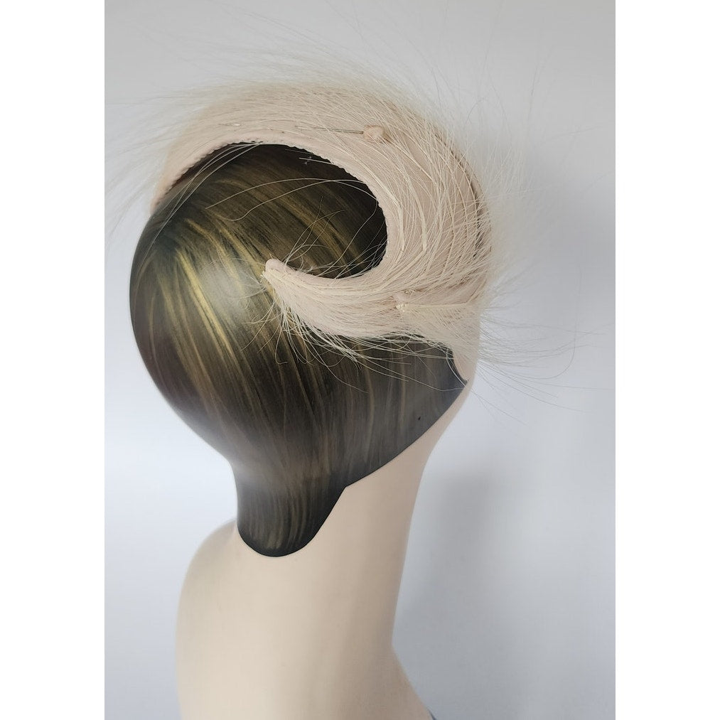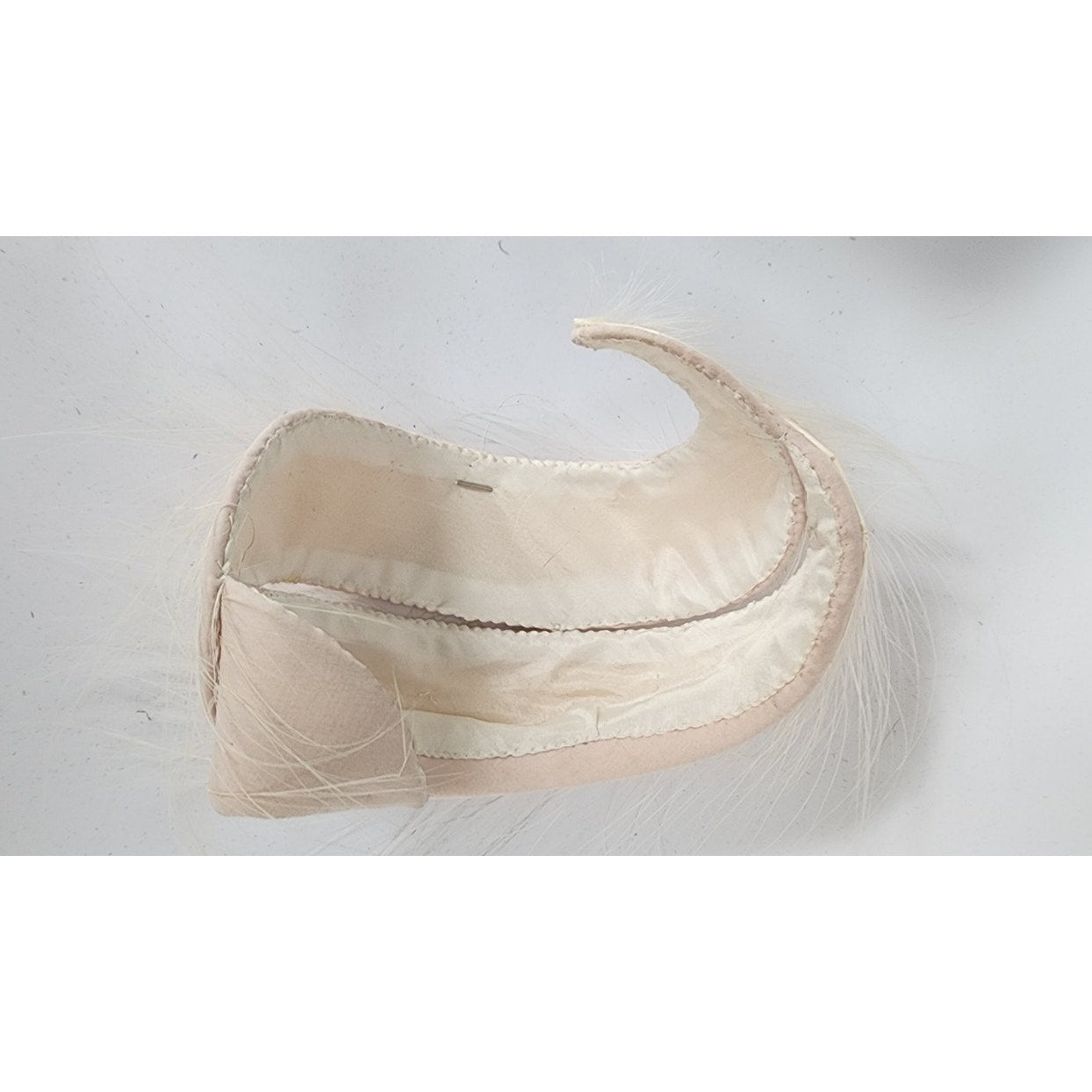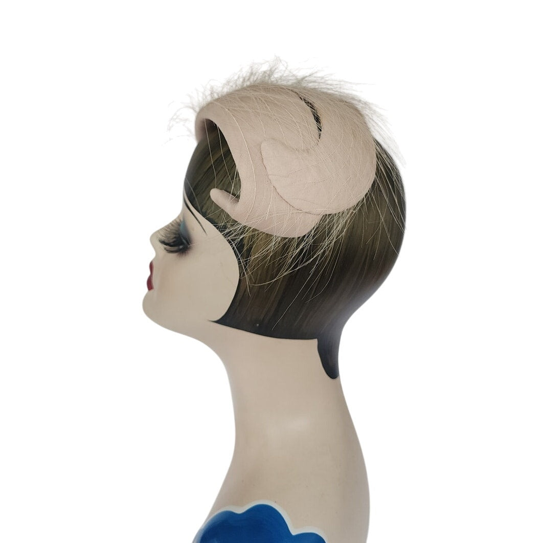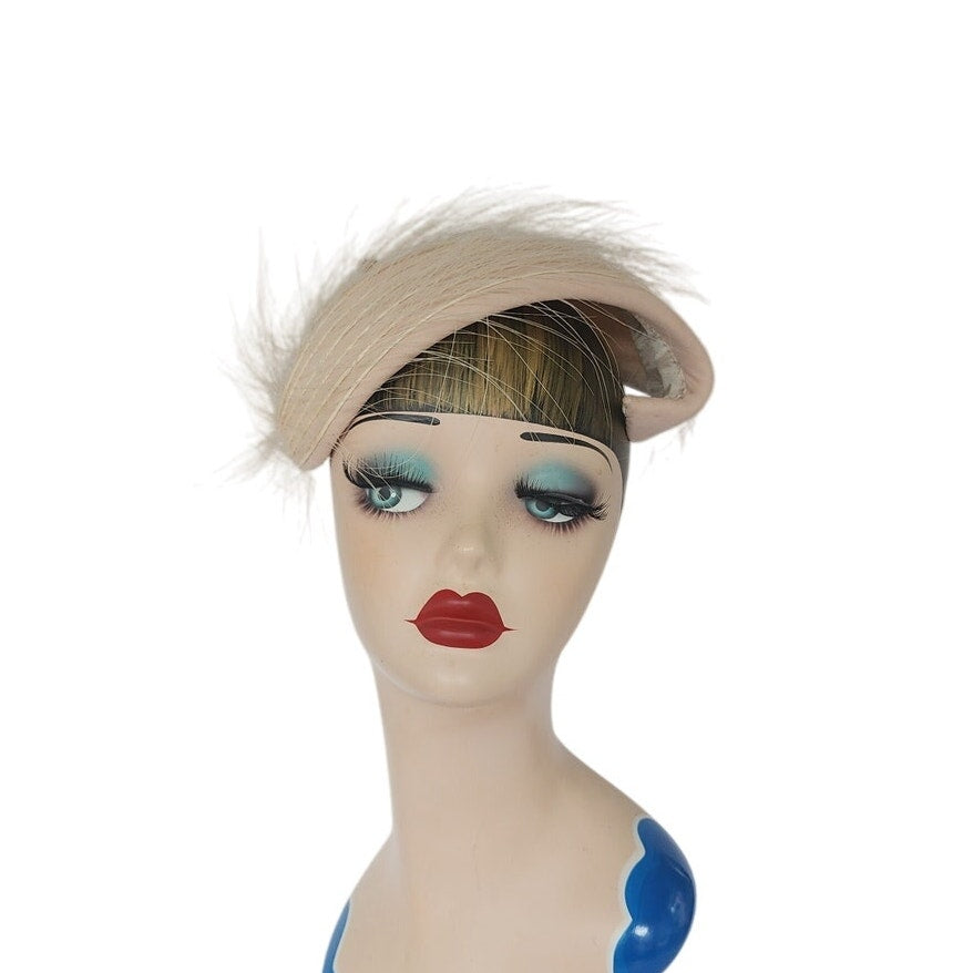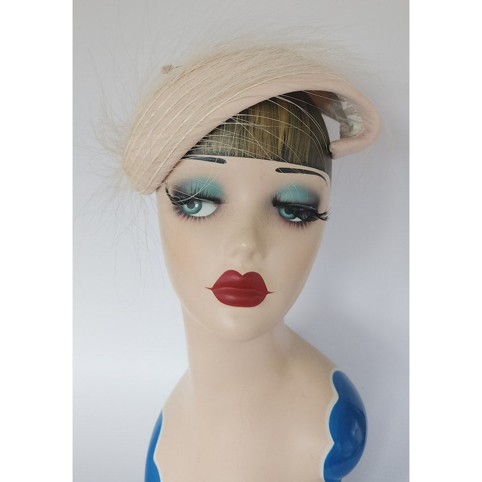 Striking 50s fascinator that conforms to the shape of your head, the shape is an large, wide S swirl with a body of pale pink satin offset by long, white feathers. Comes with a hat pin. No labels or markings on the interior which is lined in white satin. A great choice for the vintage bride!