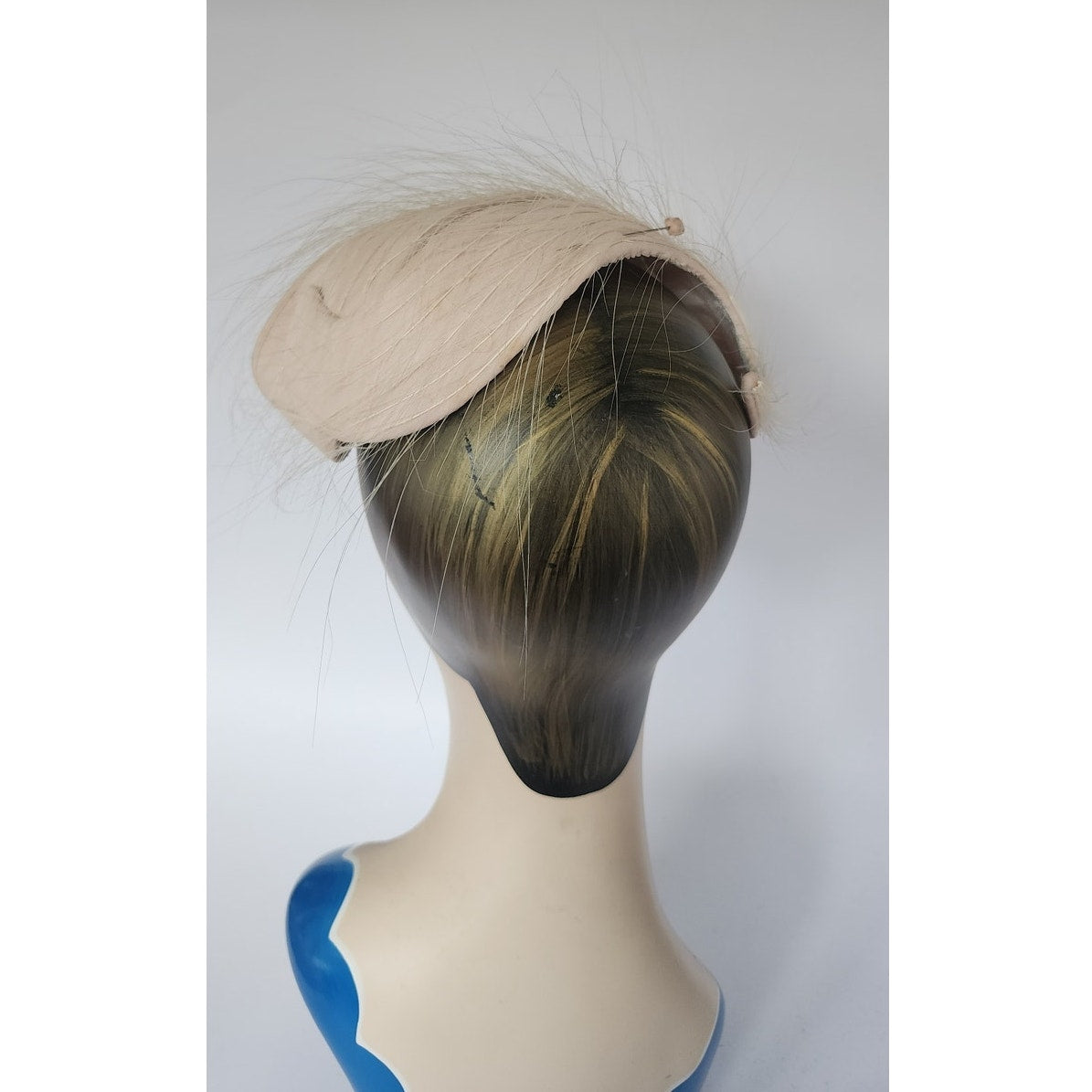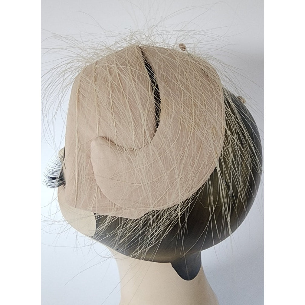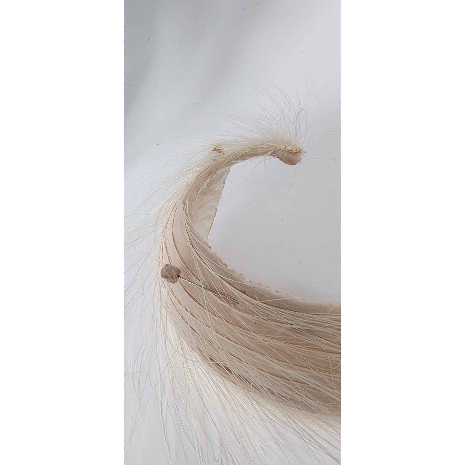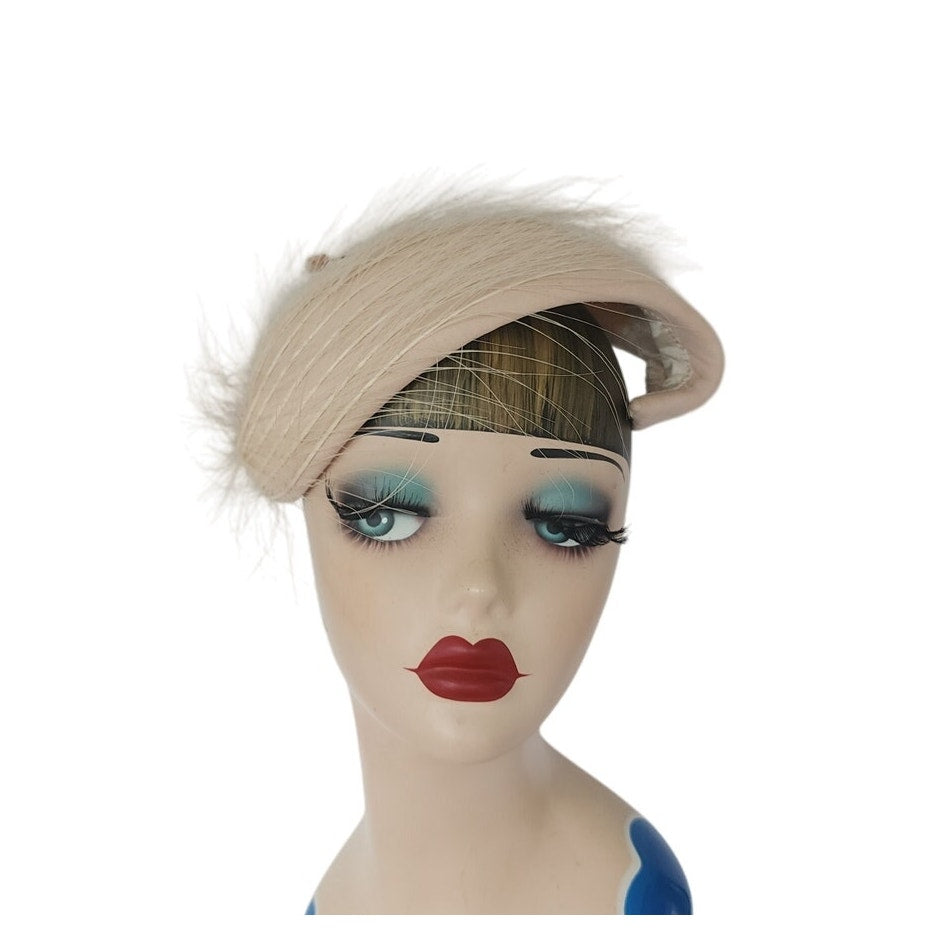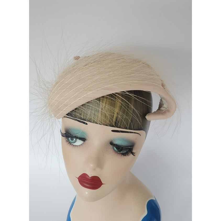 Striking 50s fascinator that conforms to the shape of your head, the shape is an large, wide S swirl with a body of pale pink satin offset by long, white feathers. Comes with a hat pin. No labels or markings on the interior which is lined in white satin. A great choice for the vintage bride!