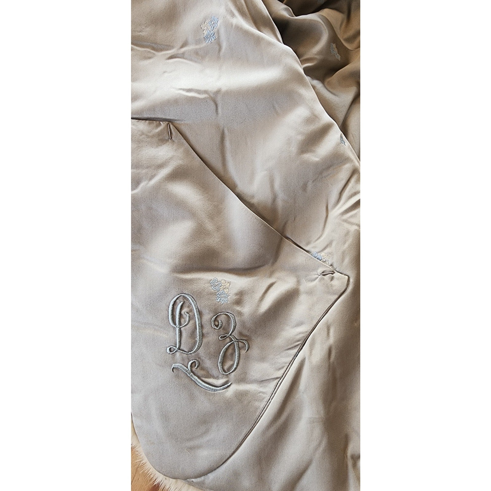 Luxurious and glamorous, silver mink fur wrap with a large, collar that has a satin lining and can be turned up. Front panels are longer than rear and have slit pockets for your hands towards the bottom. Sides have folded/pleated panels with satin lining as well. Interior is beautifully embroidered in a platinum colored brocade satin as well as hidden pockets on each side. Former owner's initials "D Z" are at right pocket.