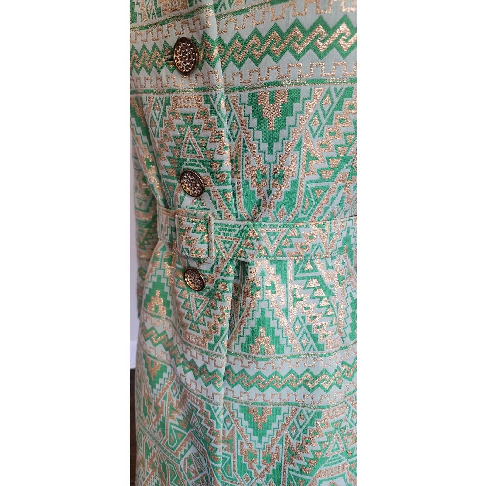 Green and metallic gold print geometric print coat with a matching adjustable belt, it has a large, fold down collar and closure at the front sparkling with dramatic rhinestone beaded buttons. Fully lined with slit pockets at the hip fronts.