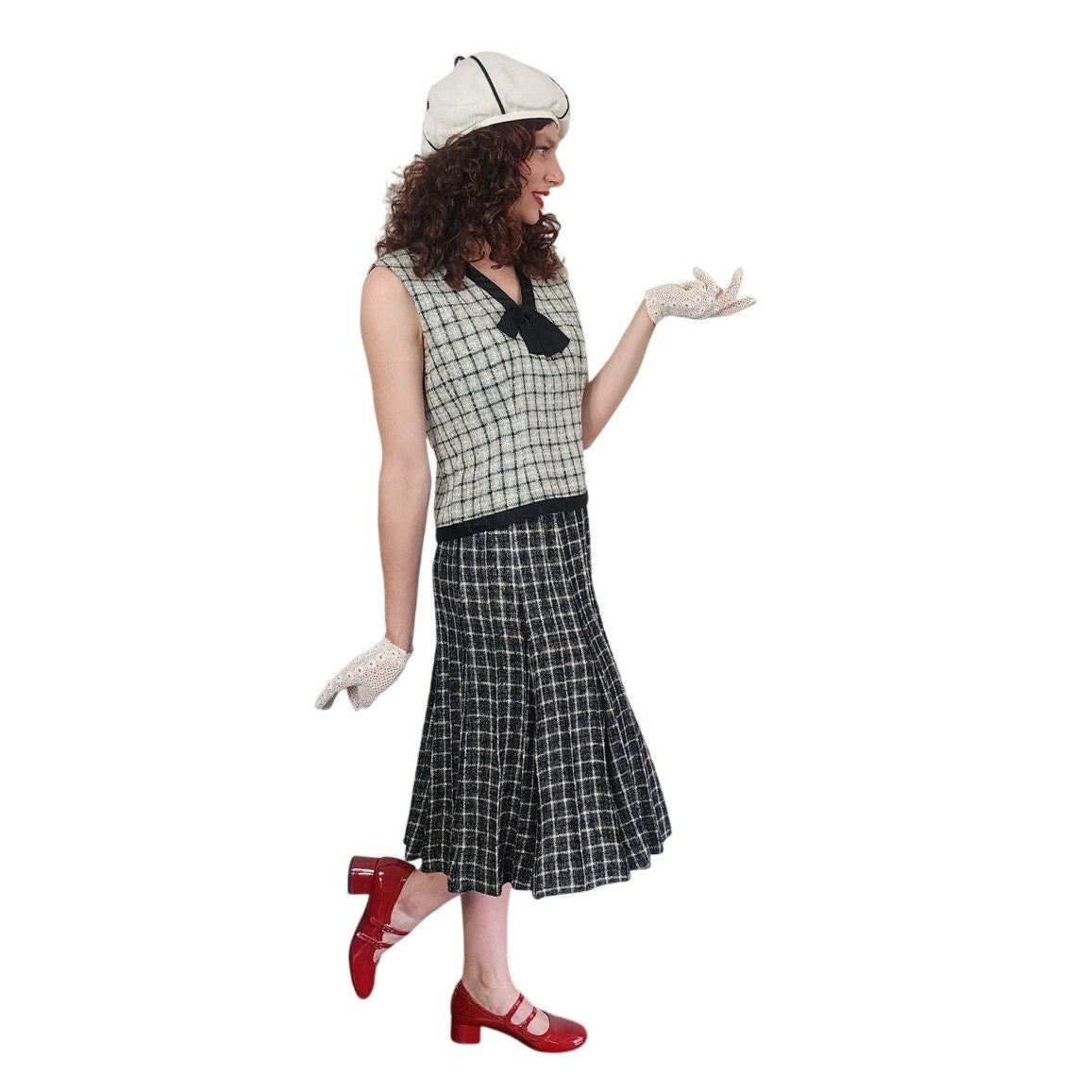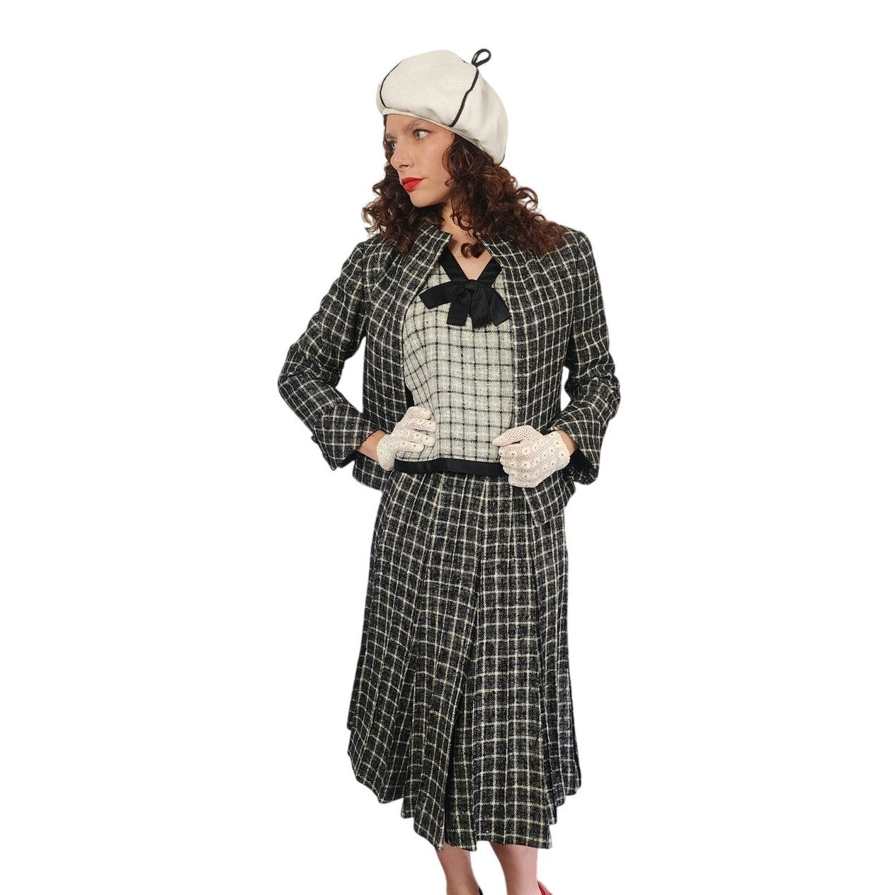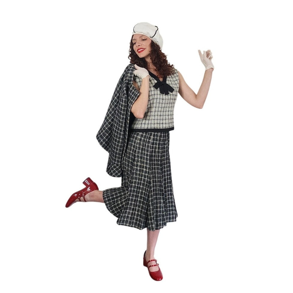 Jacket and skirt are cut out of a white on black grid patterned wool, while the shell is in the reverse with the bow and hem trim in solid black.