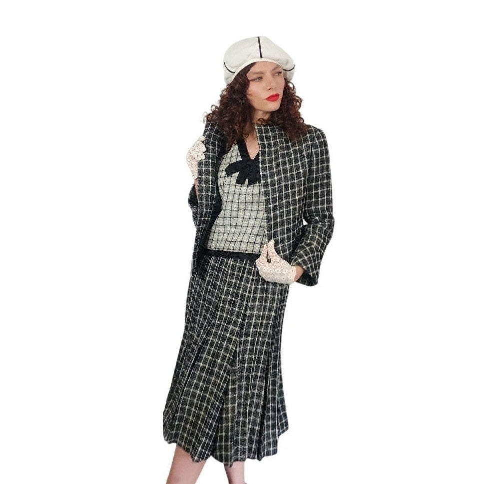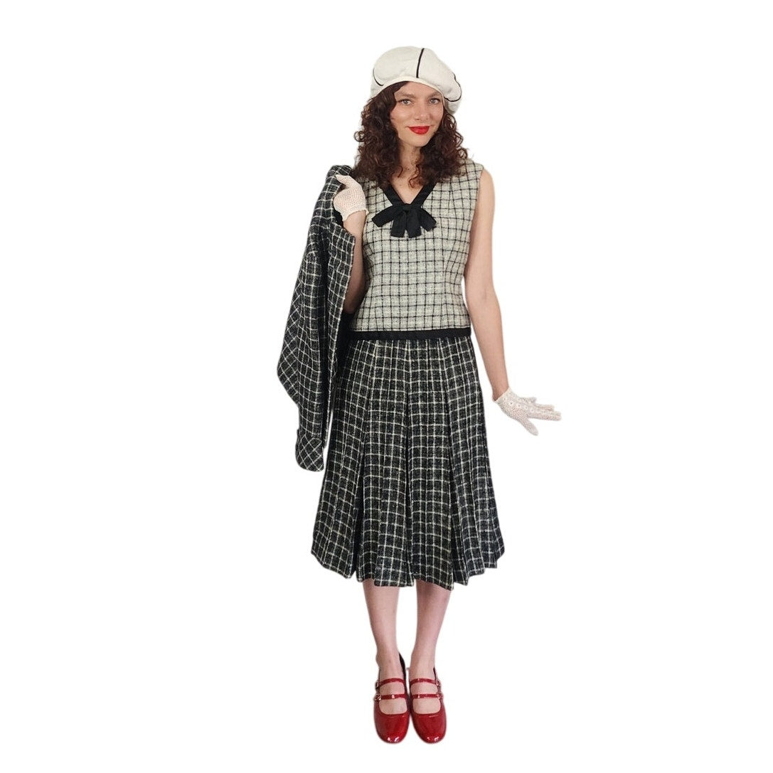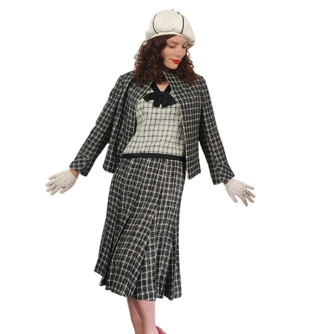 Vintage 1960s Christin Dior New York Suit Mod Three Piece Black White Check Wool