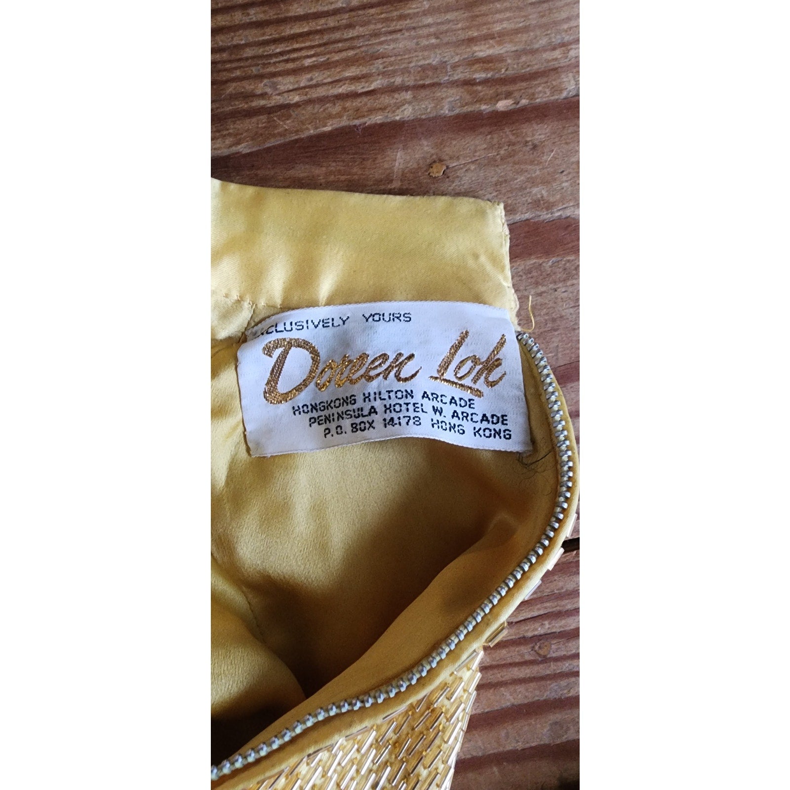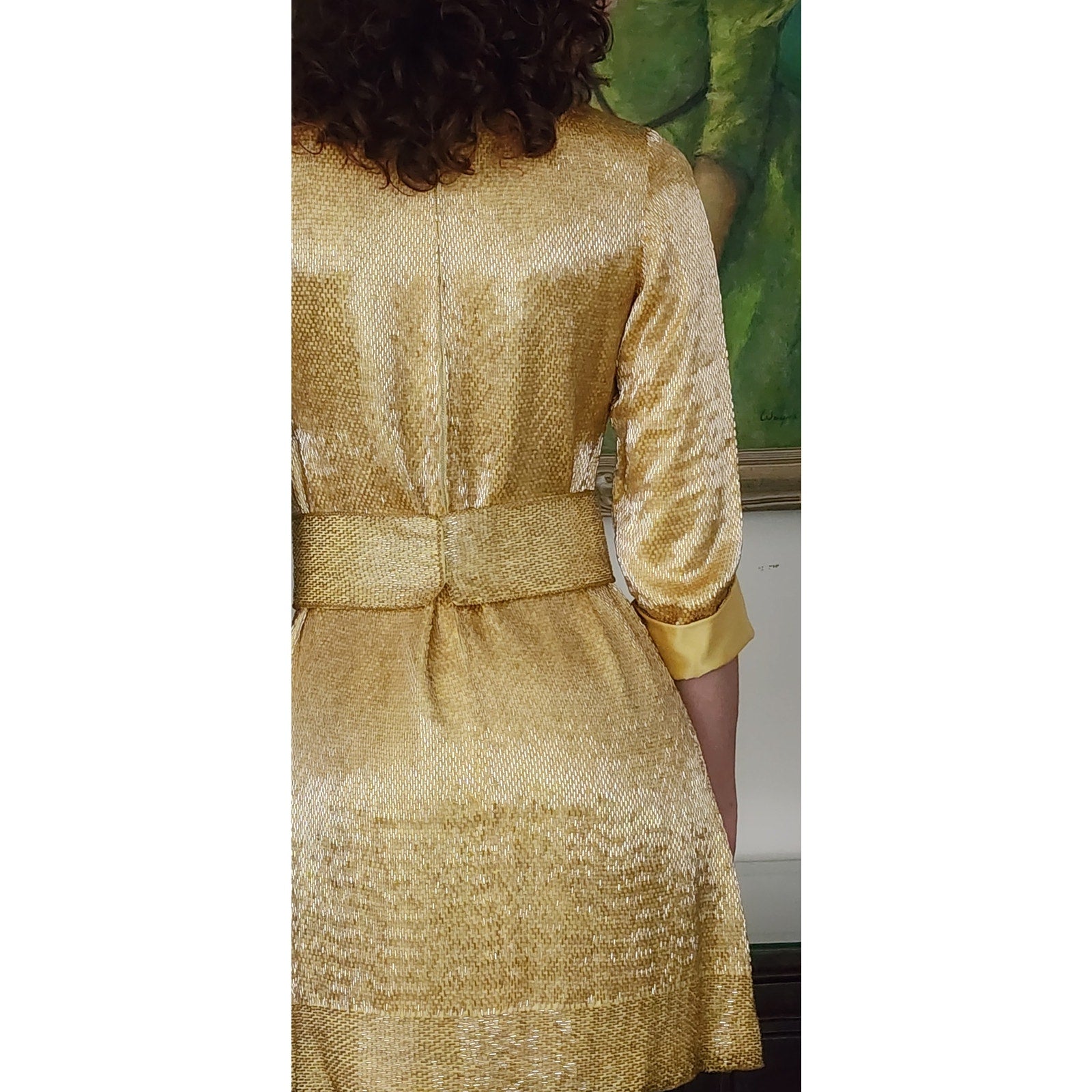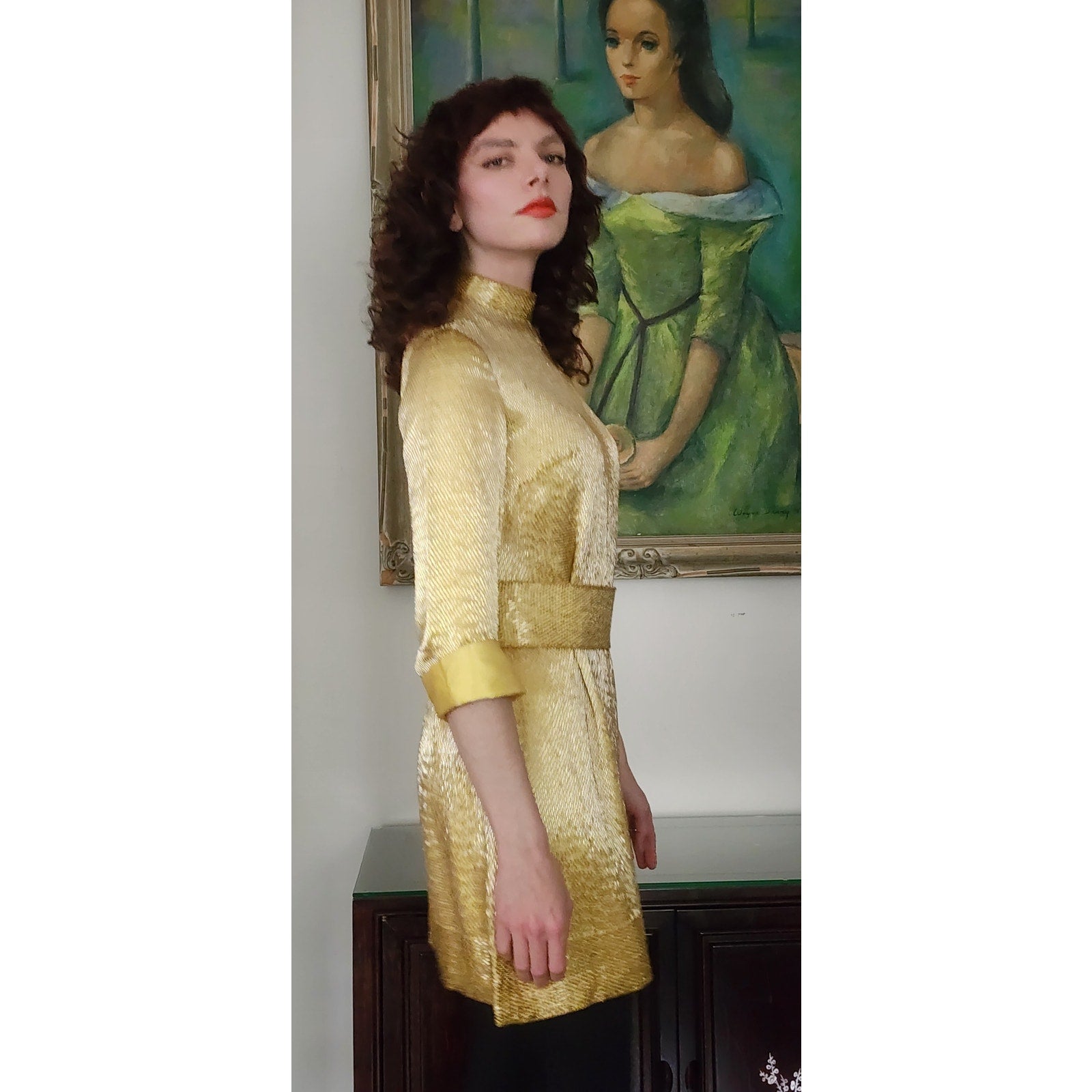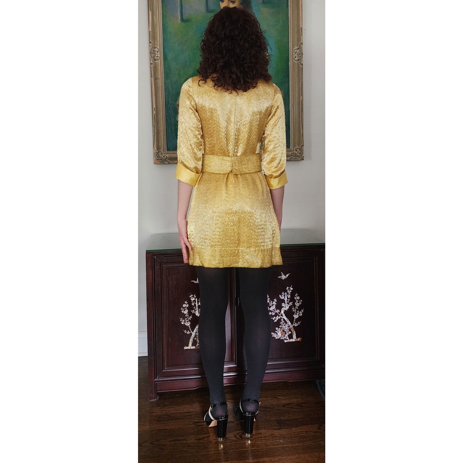 Slinky mini dress with three-quarters fitted sleeves with cuffs that snap closed, and a silhouette that can be worn either loose or with the matching belt (that hooks closed). High neckline. Zips up the back. Fully lined. Shimmering, heavy, metallic beadwork on yellow silk give this a real dazzle.