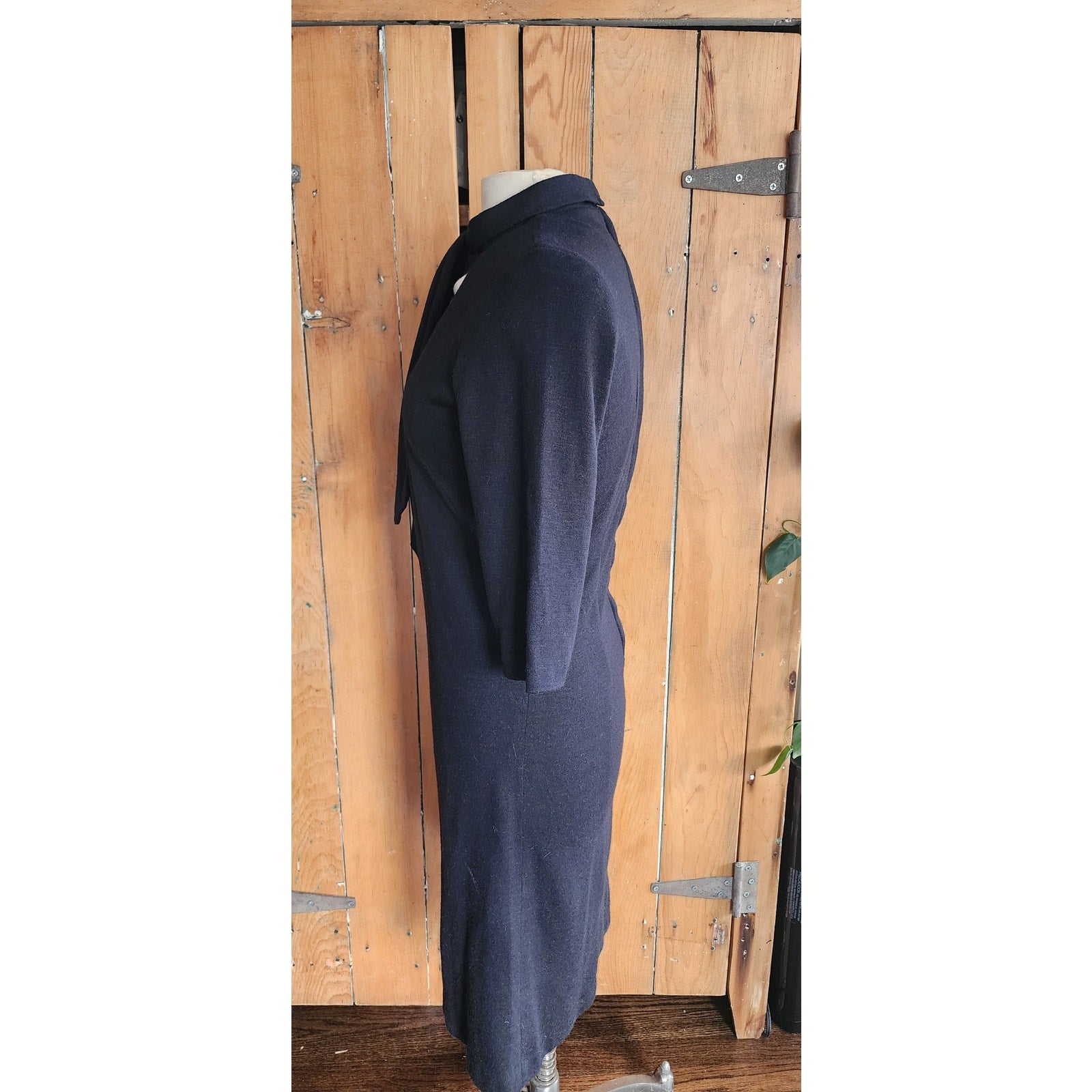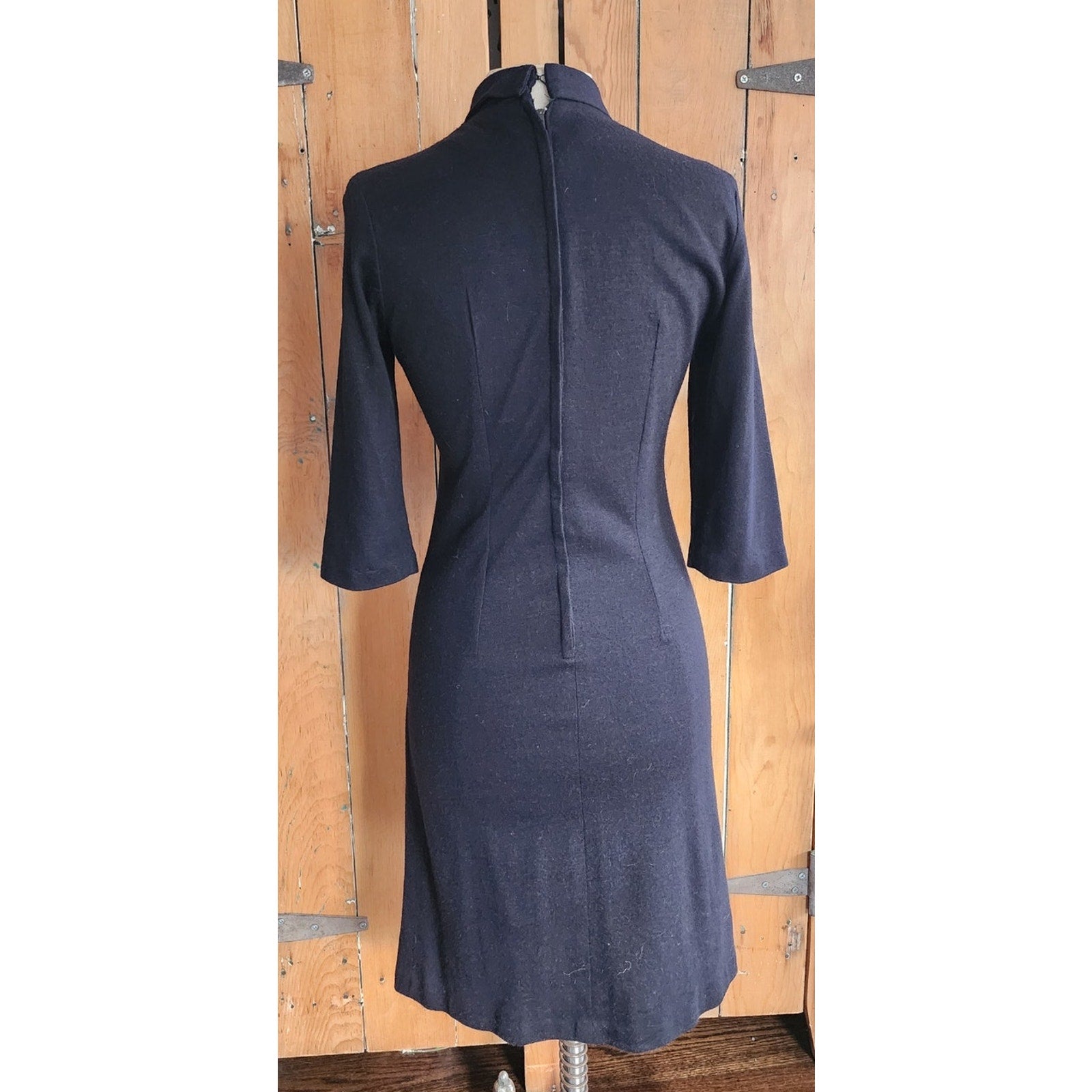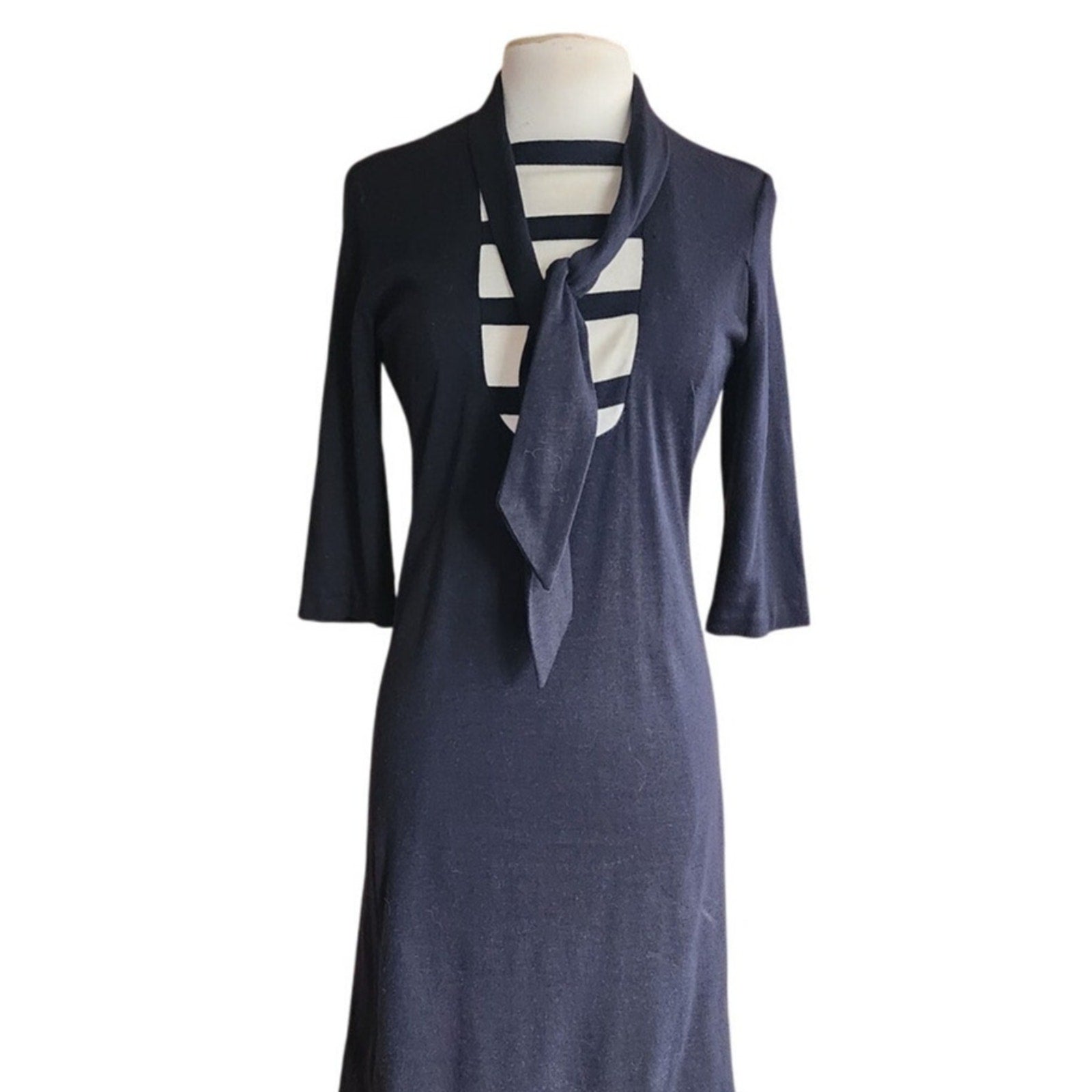 Cutie day dress in a black-poly knit fabric with stretch, it features fitted, three-quarters length sleeves and an attached, long, black sash ties at the neck that can be worn in various ways as shown. Center of chest is black and white stripe. Silhouette is fitted. Closes with a zipper down the back. Unlined. No tags.