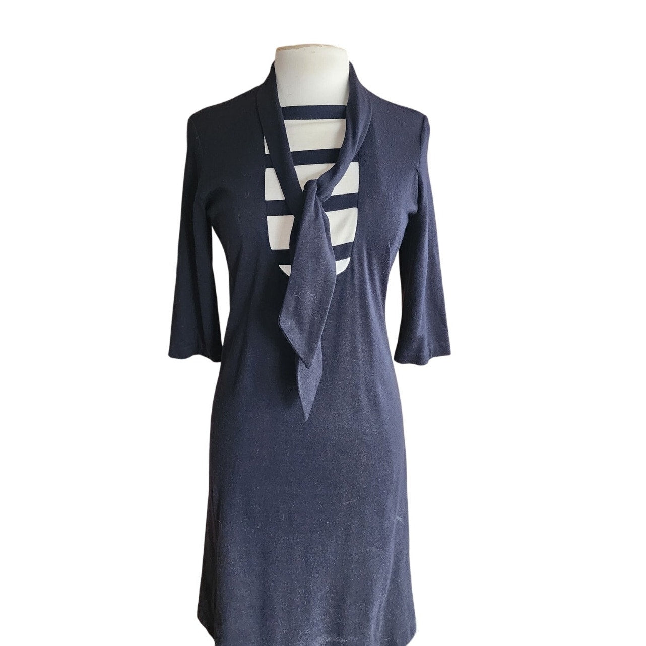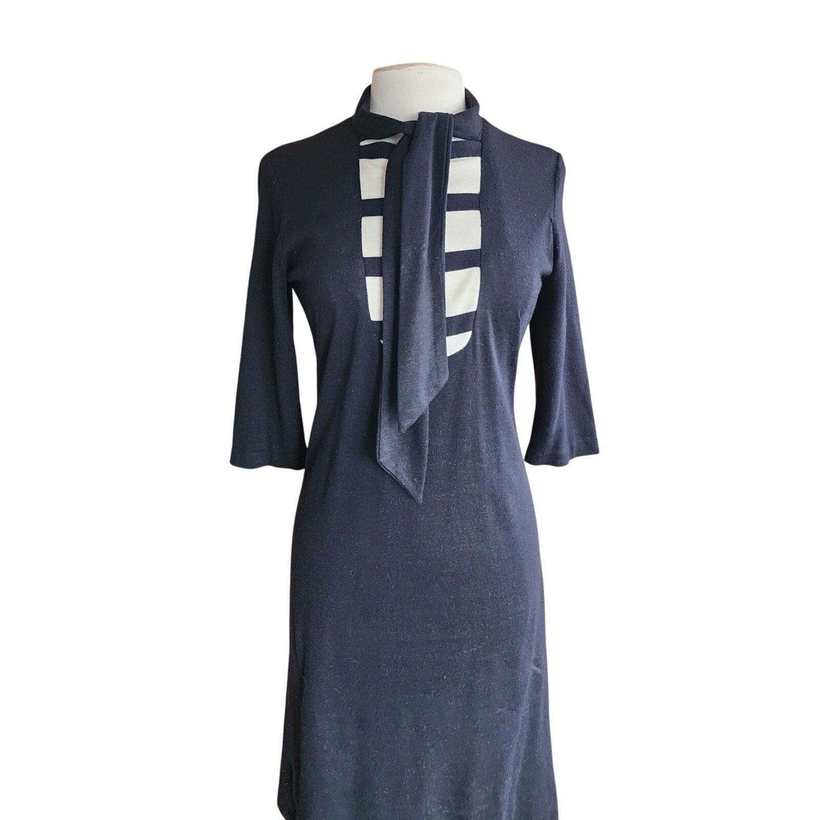 Vintage 1960s Mod Dress Black White Stripe Ascot Tie Stretchy / Medium