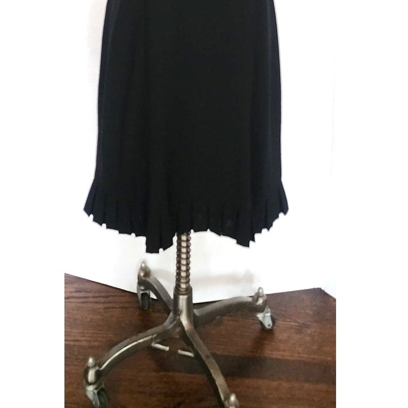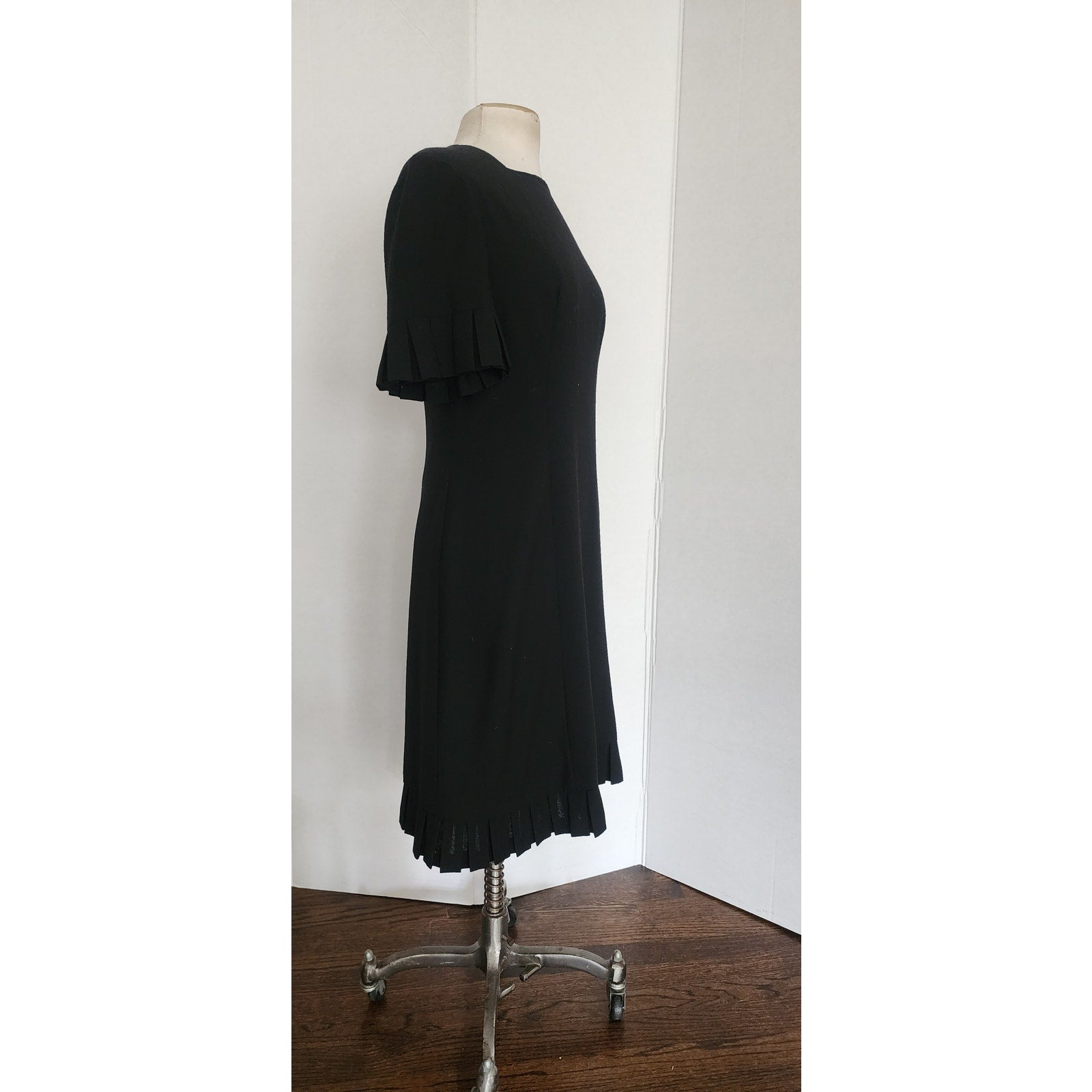 Classic little black dress from the chicest of midcentury Italian fashion houses! Collarless, with a high, square neckline, it has half sleeves with pleated fringe cuffs. The pleated panel is repeated around the mid-calf hemline. Silhouette is cut down across the torso, and princess seams create a flattering fit. Closes with a zipper at center rear. Fully lined.