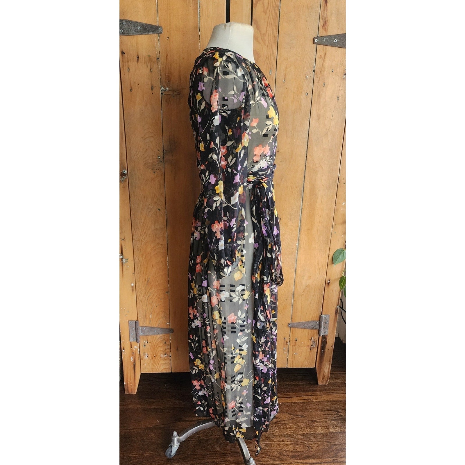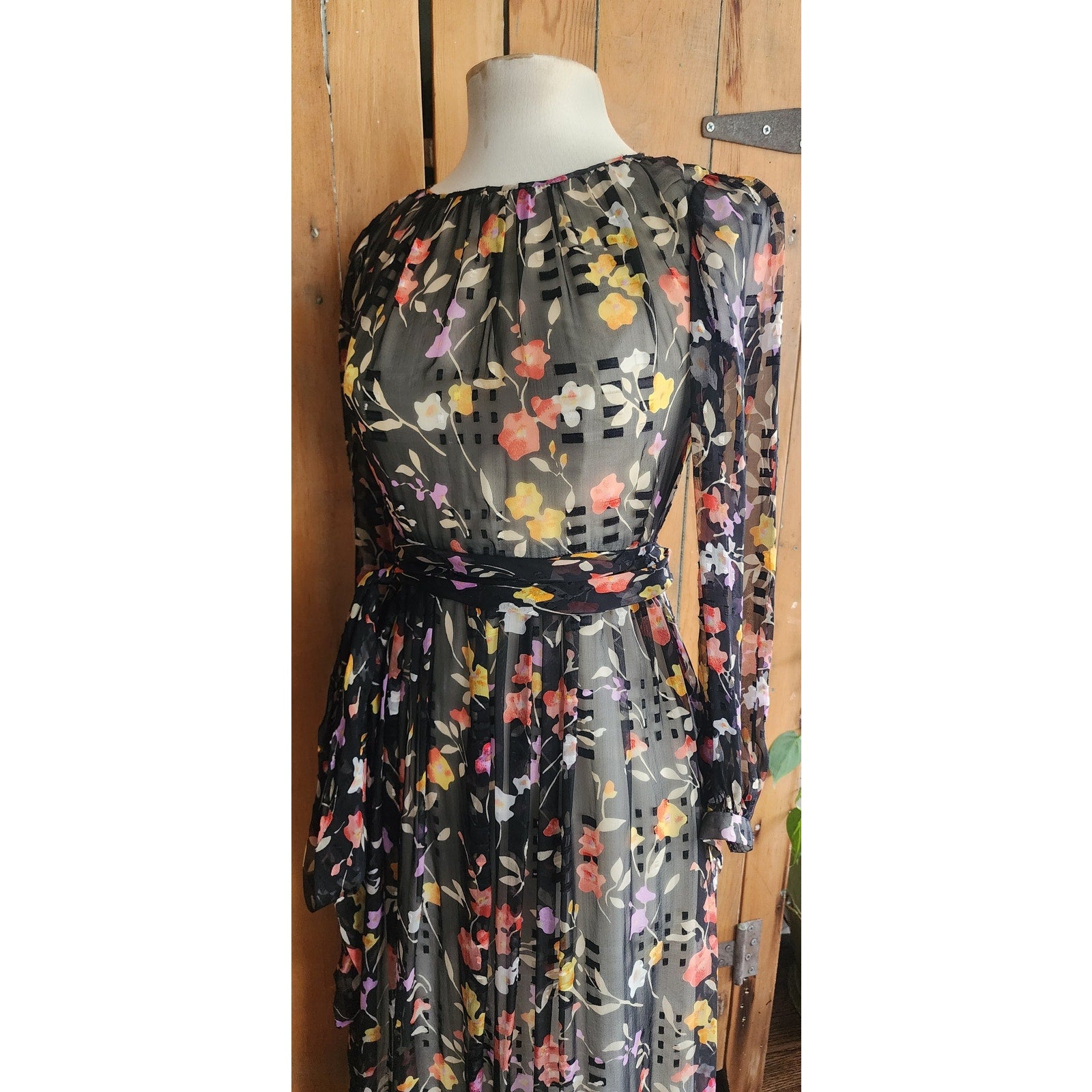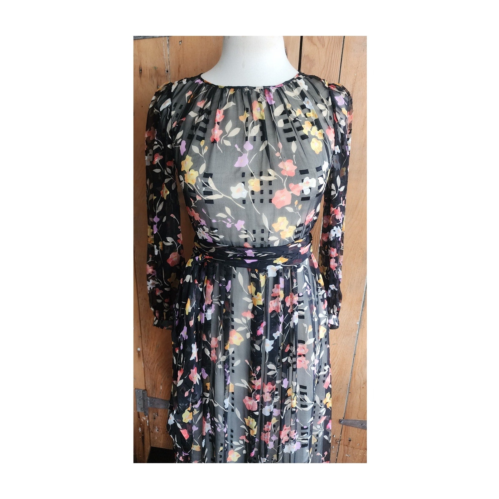 Vintage 1970s Dark Floral Print Dress Gauzy Maxi Sash Tie Belt