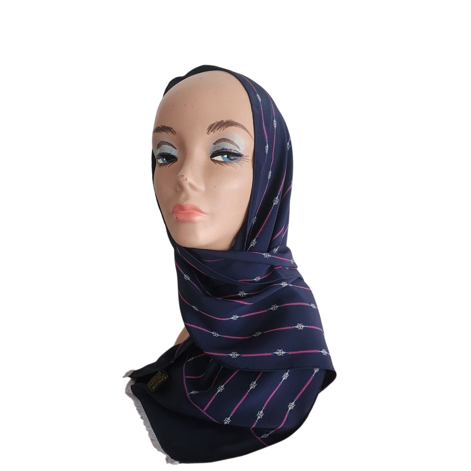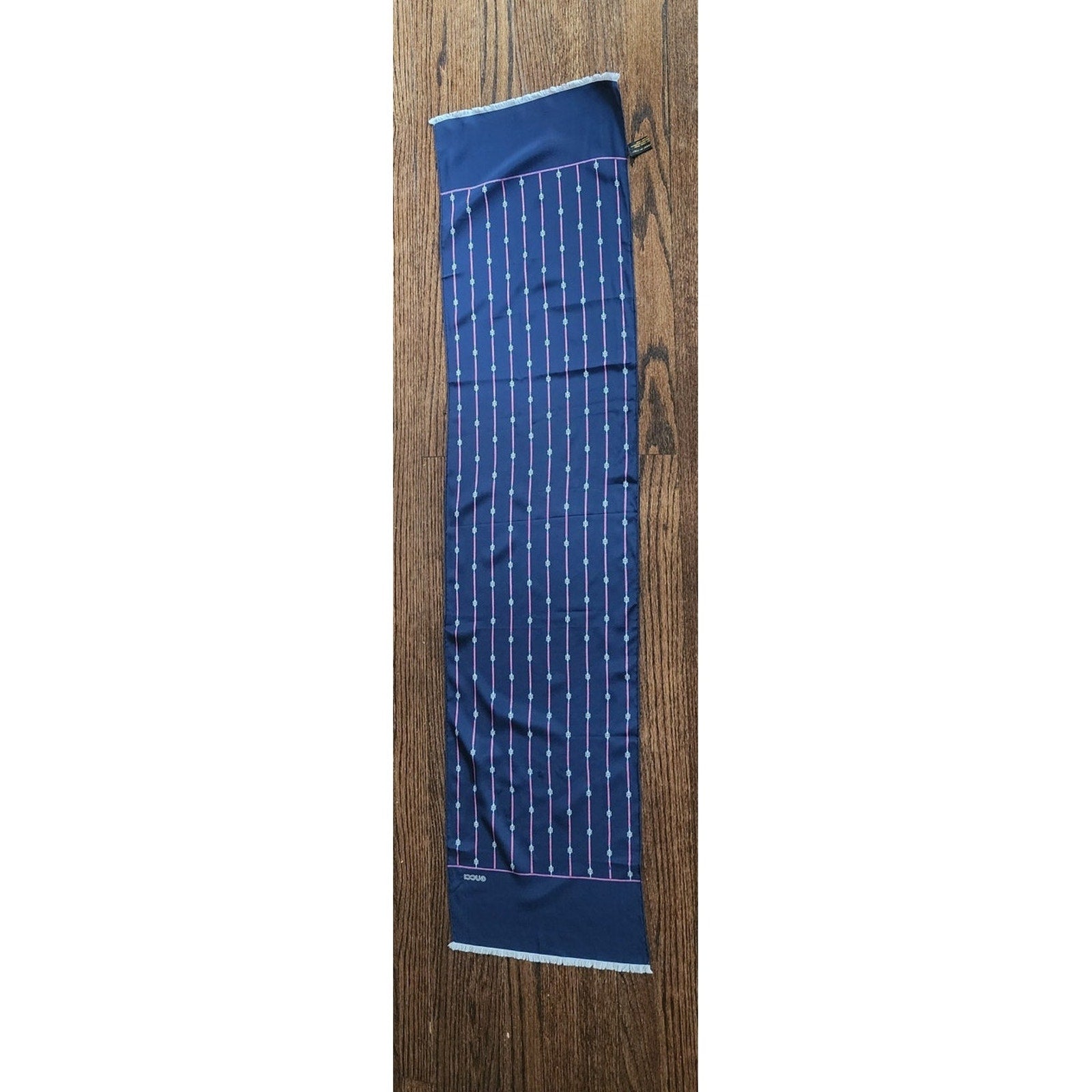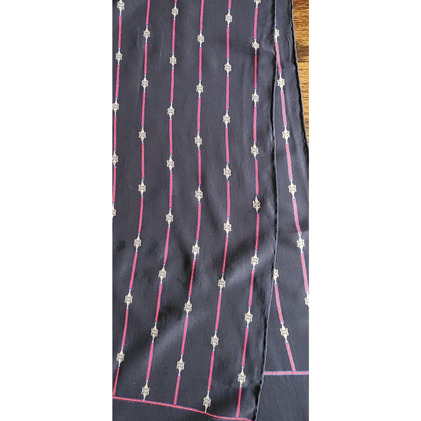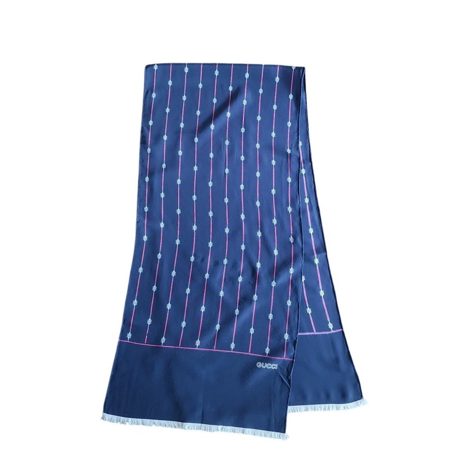 Vintage 1970s Gucci Silk Scarf Navy Blue Horsebit Print Rectangular Fringed