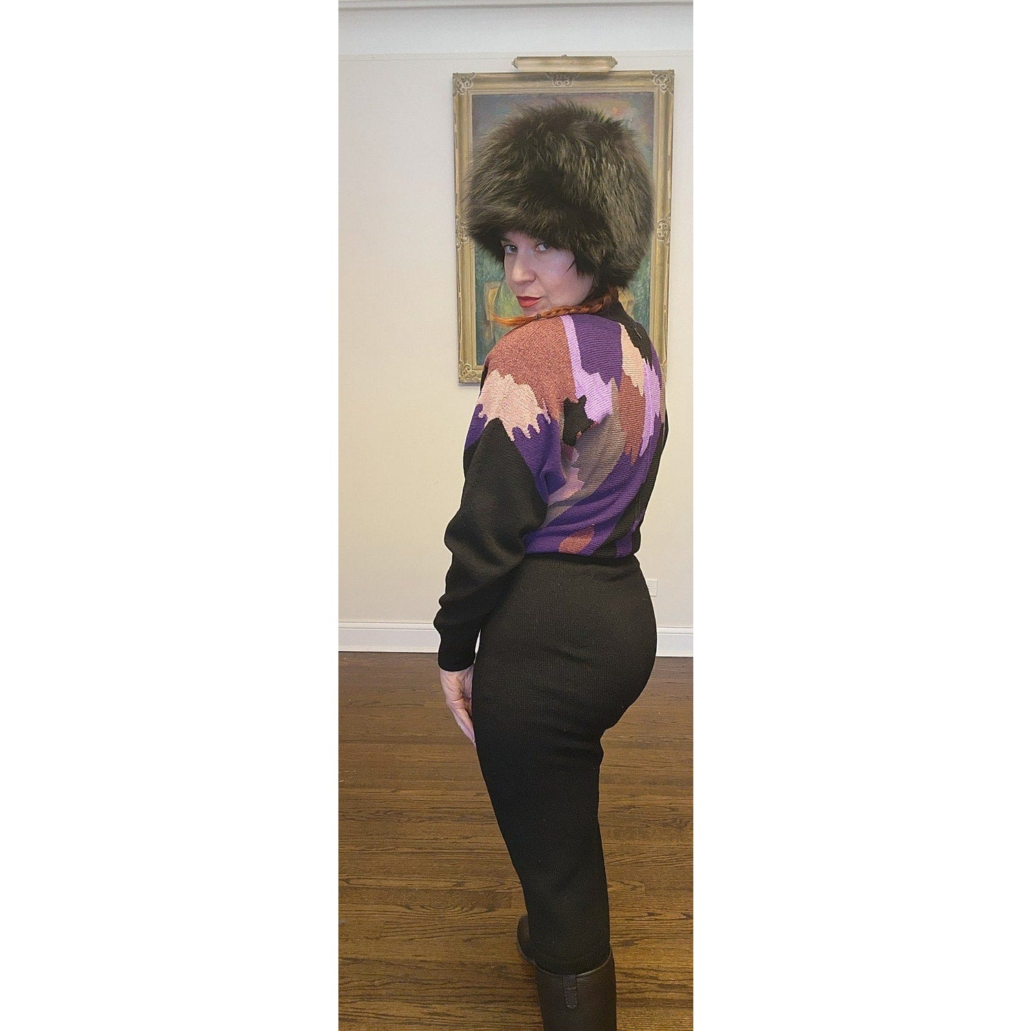 Gorgeously striking long sleeved sweater dress, this is collarless and features an abstract patchwork like knit pattern across the front and rear torso in shades of purple, pink, brown and beige. The rest of the dress is black solid knit and features an elastic waist and a fitted skirt ending just below the knee on my 5'3" frame. Unlined, it zips up the back.