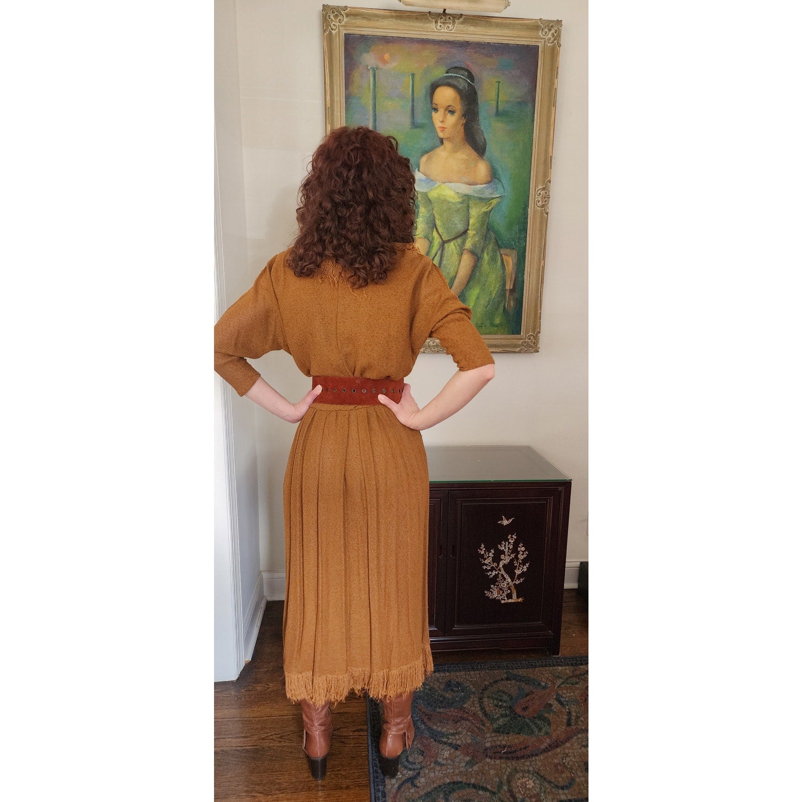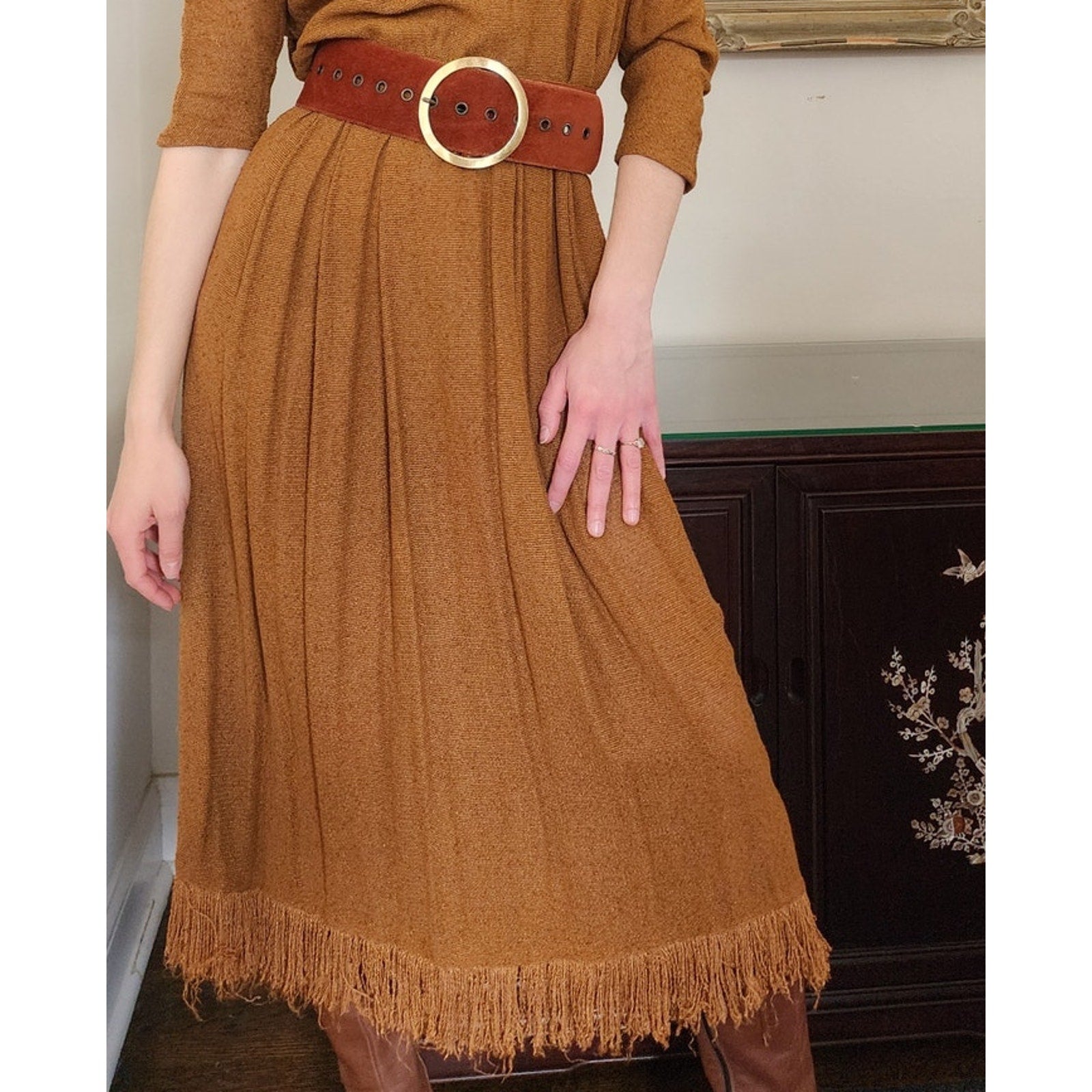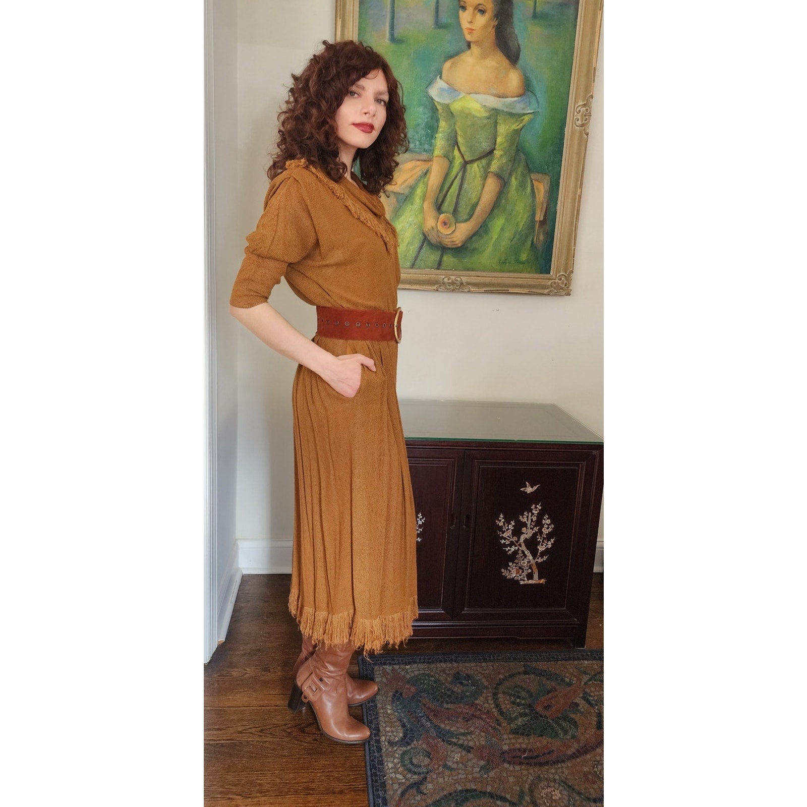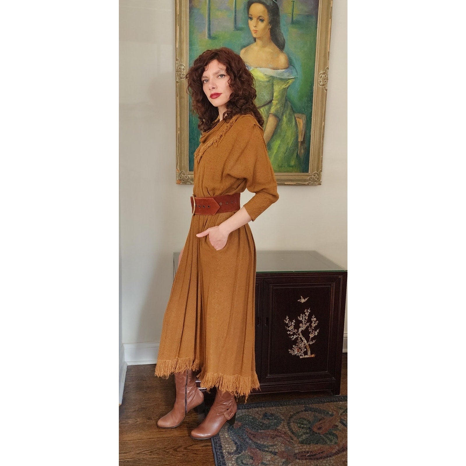 This funky frock pulls on overhead and features three-quarters length sleeves, a natural waist seam and a full skirt, ending at mid calf. Note the cowl neck collar with long fringe in matching brown - matching the fringe at the hem. There are slit pockets at each hip front. Unlined. *Belt is not for sale and used for styling purposes only (but can be if you inquire!).