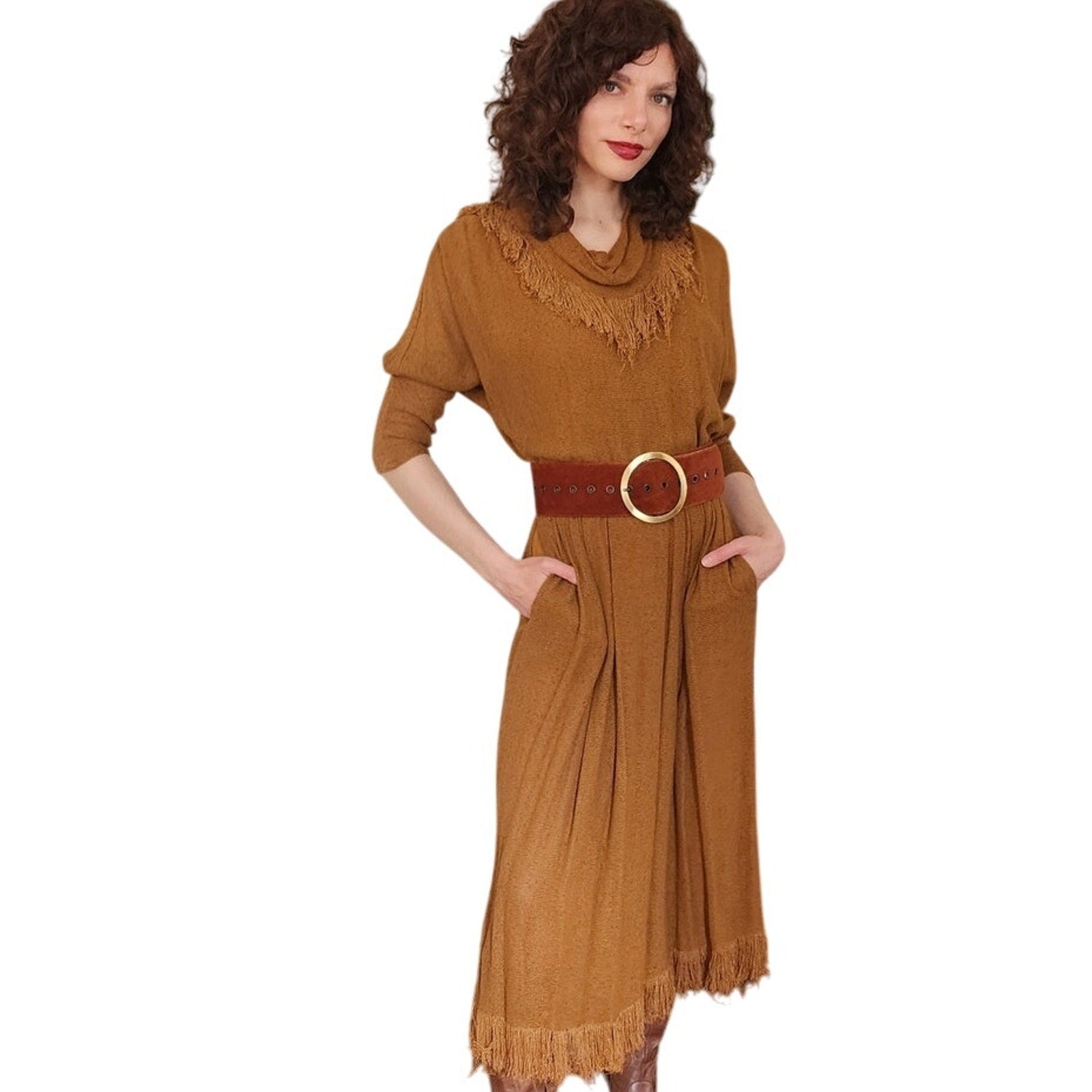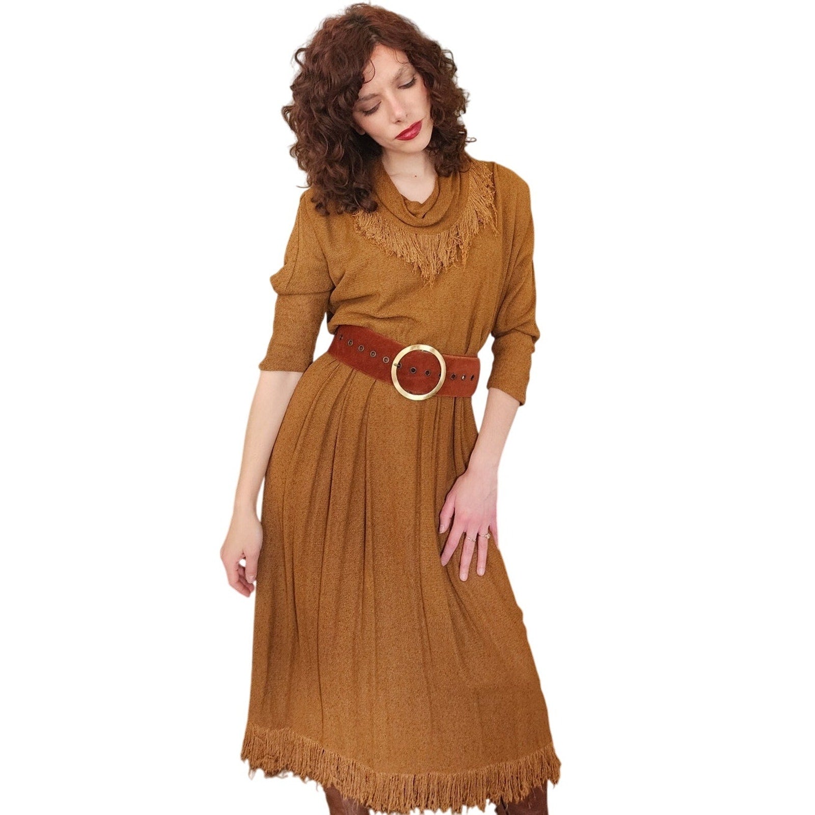 Vintage 1980s Brown Dress Fringed Cowl Collar Mad Max Distopia Positive Attitude