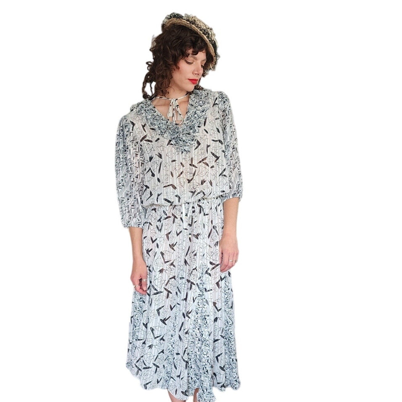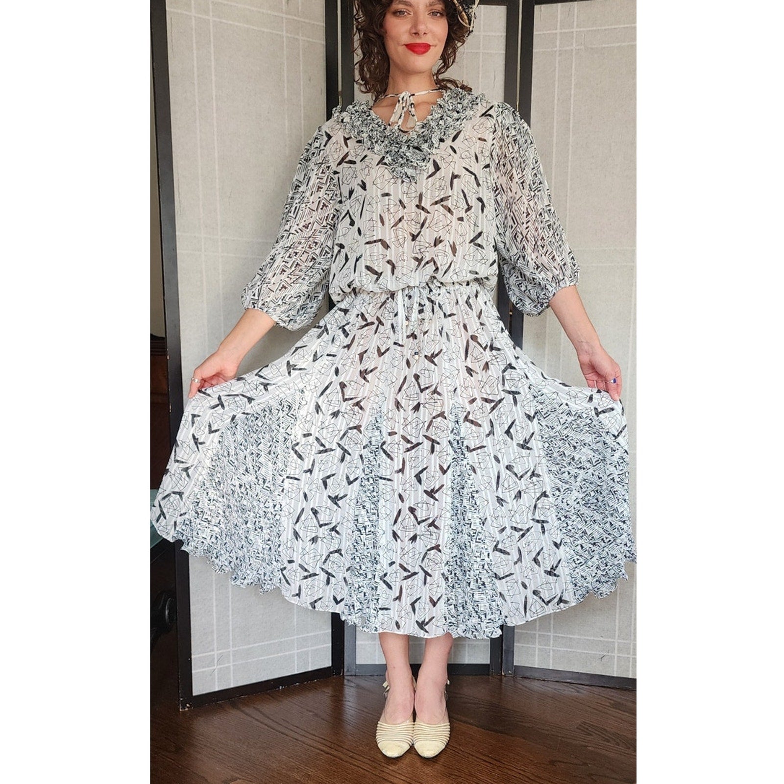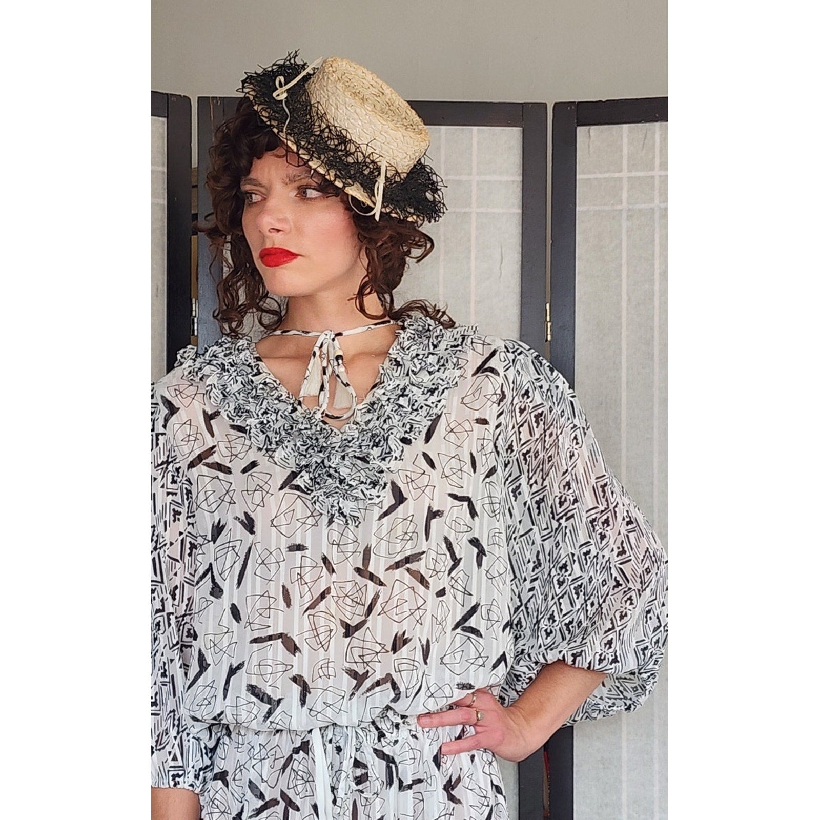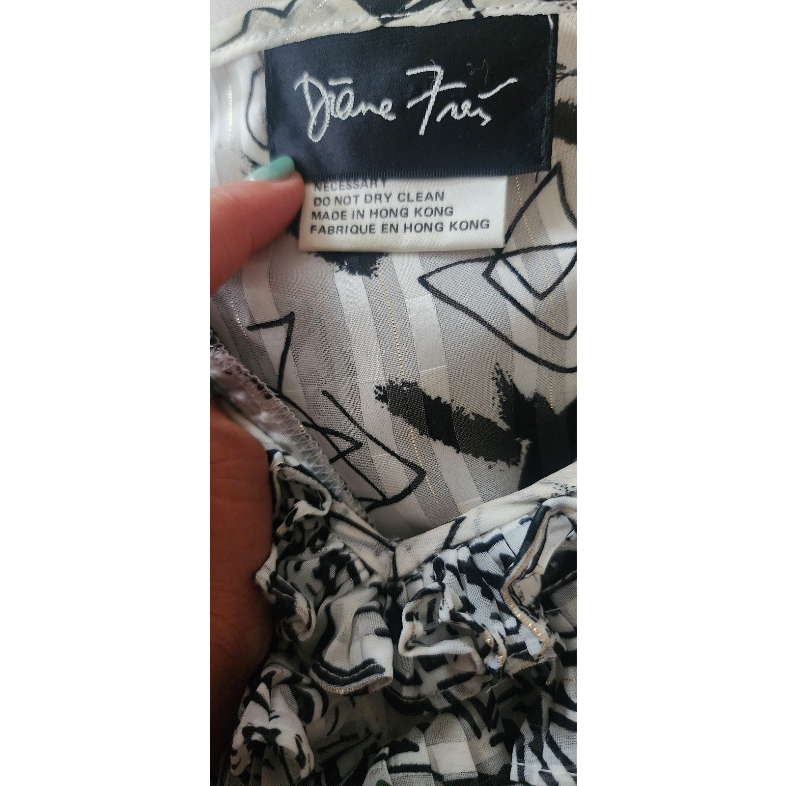 Vintage 1980s Diane Freis Fishtail Skirt Blouse Set Black White Georgette Graphic Print