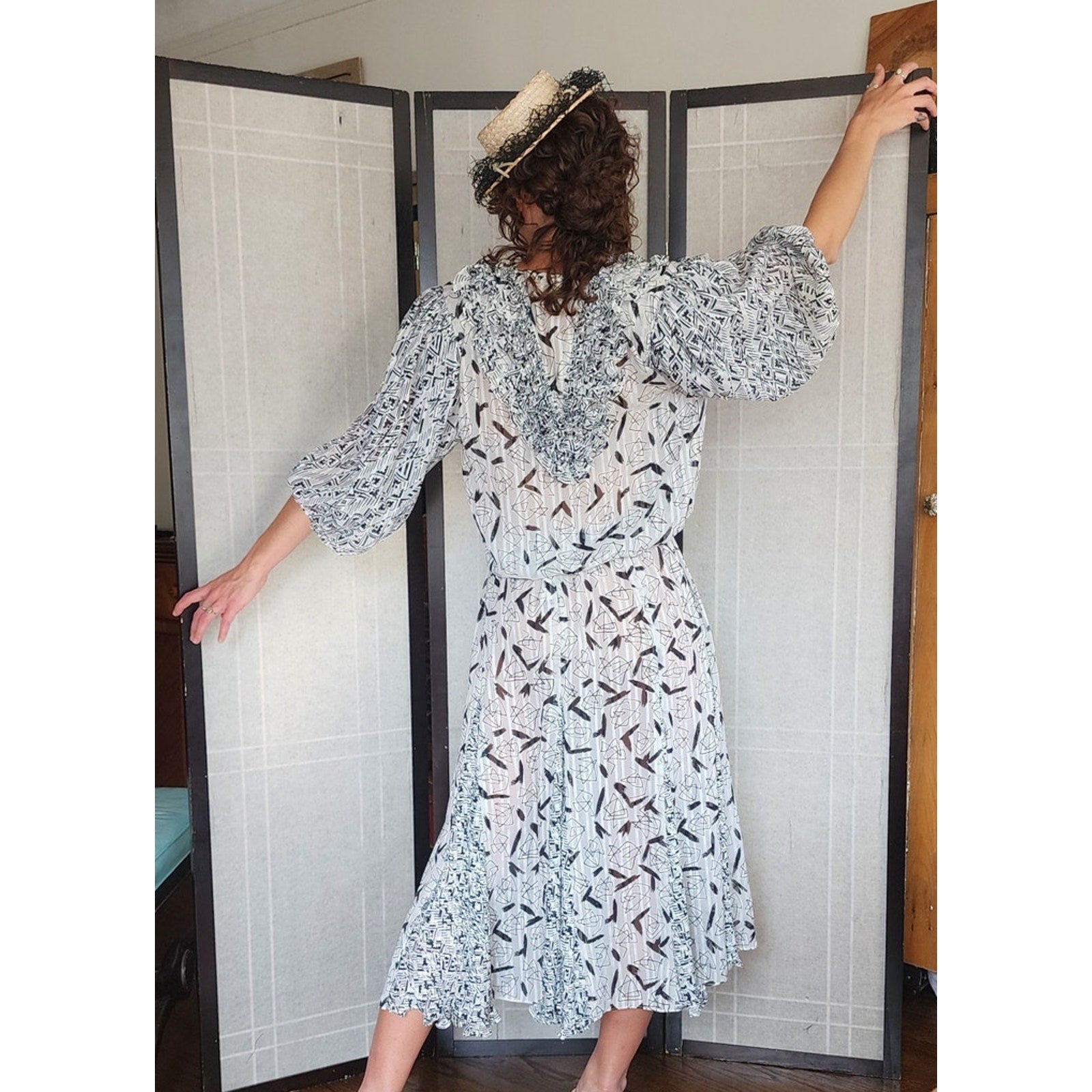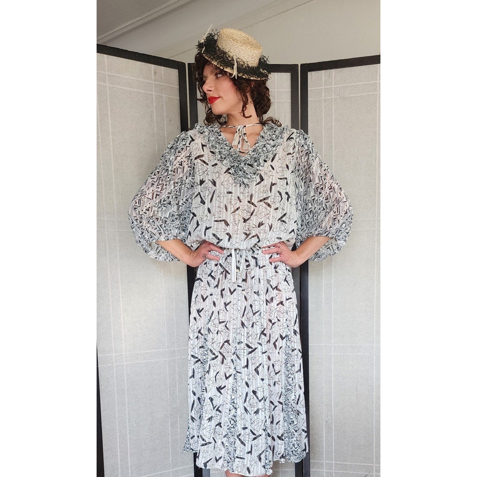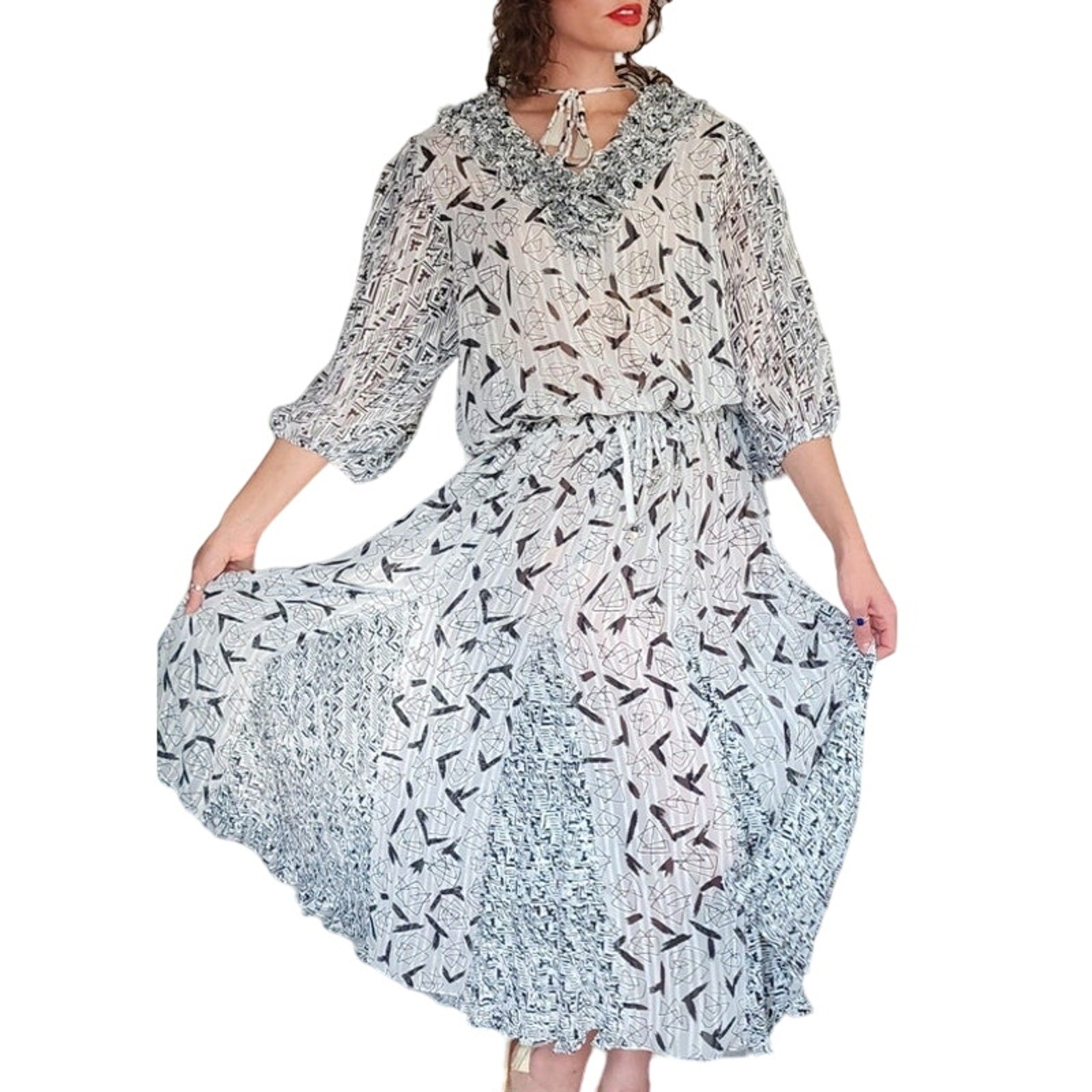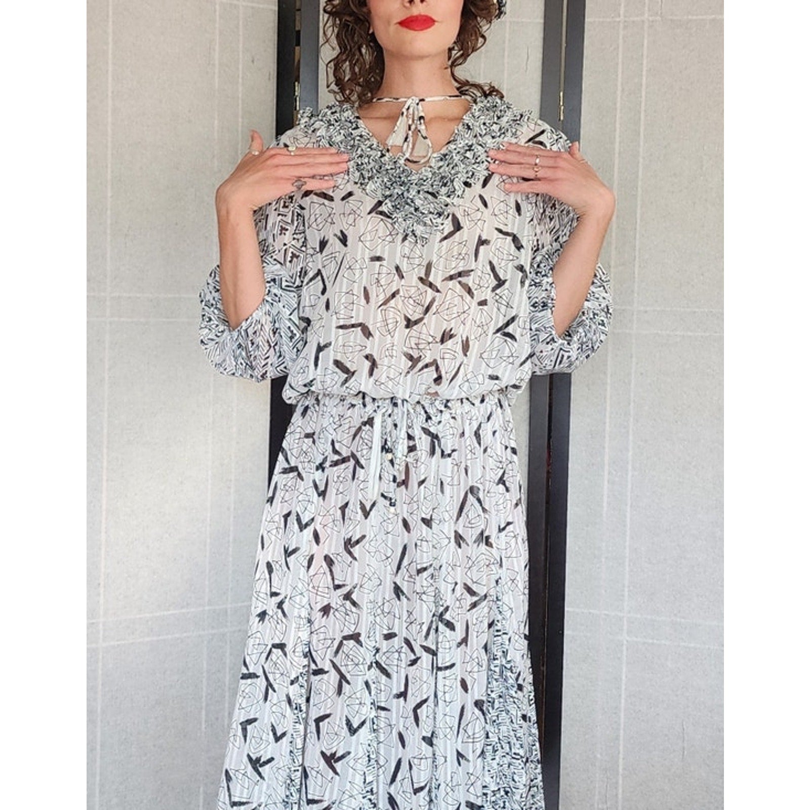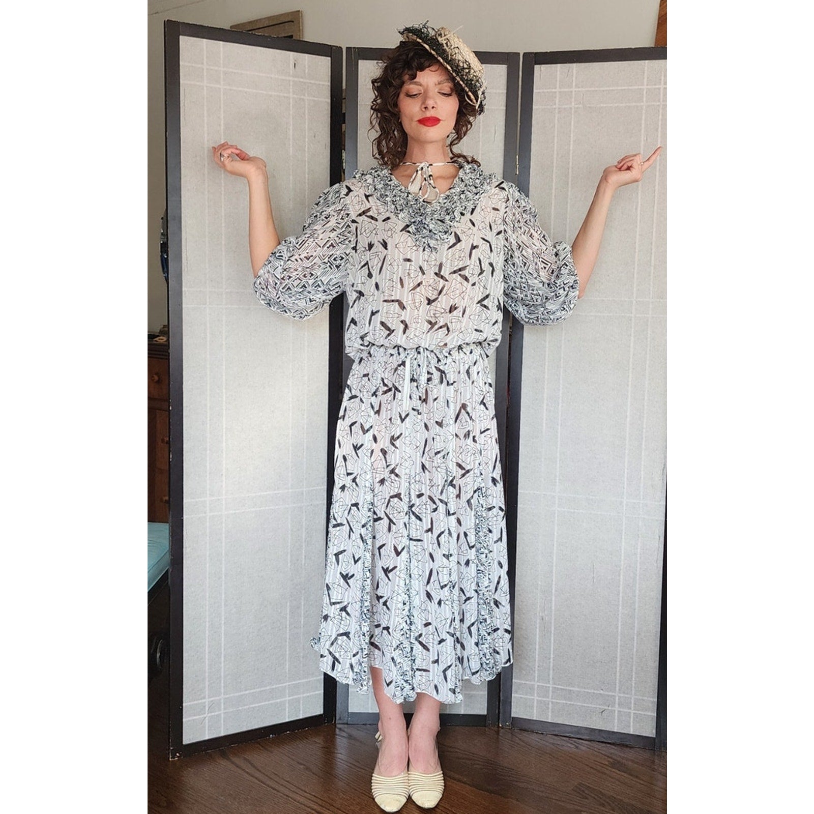 Vintage 1980s Diane Freis Fishtail Skirt Blouse Set Black White Georgette Graphic Print