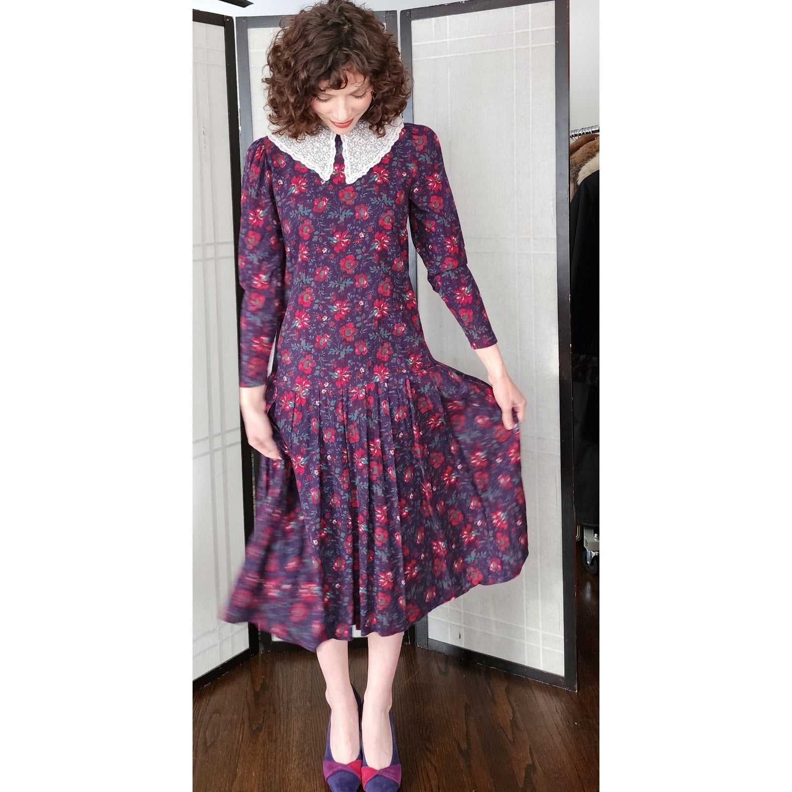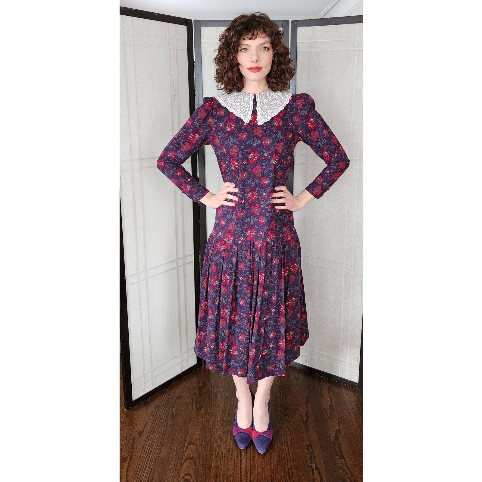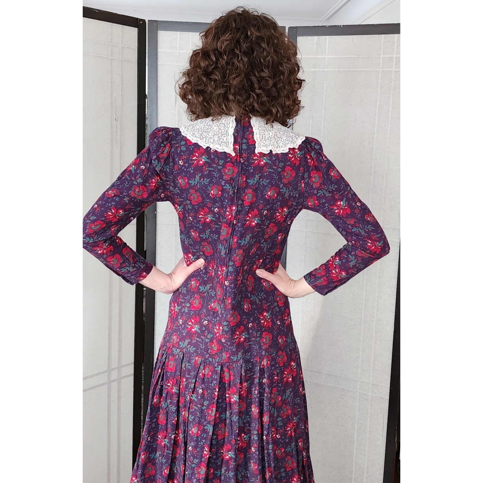 Vintage 80s Laura Ashley Dress Dark Floral Print Lace Collar Long Sleeve