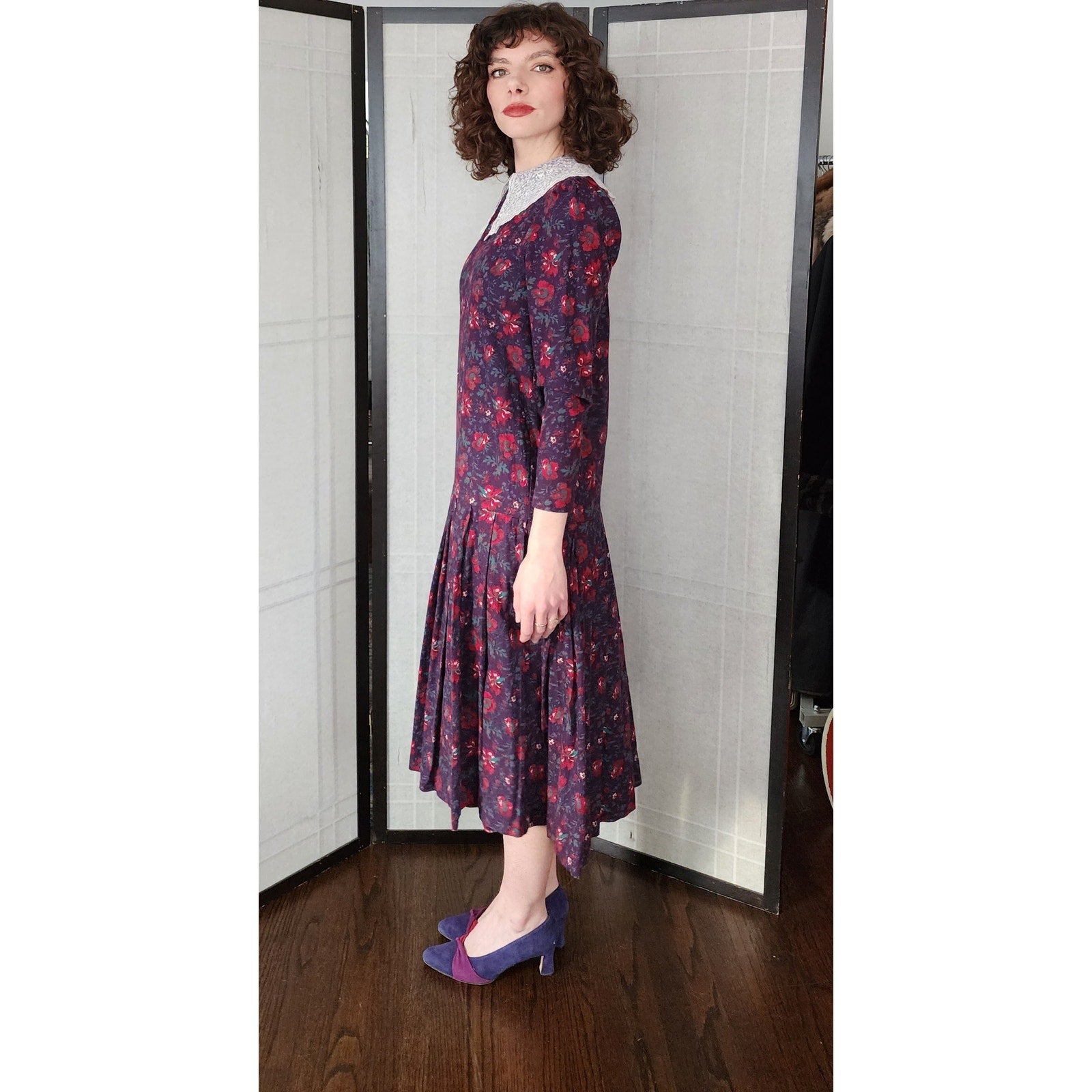 Vintage 1980s Laura Ashley Dress Dark Floral Print Lace Collar Long Sleeve