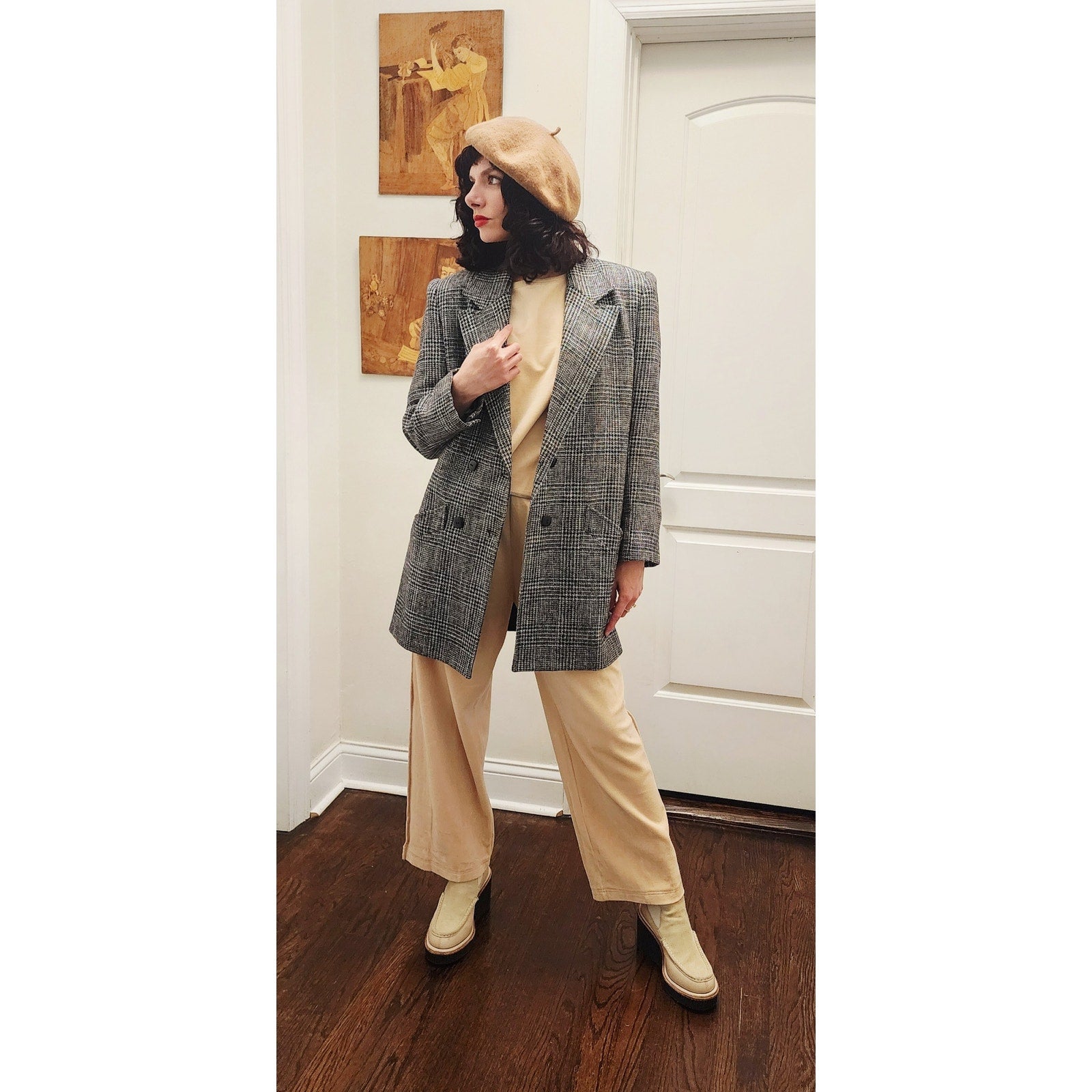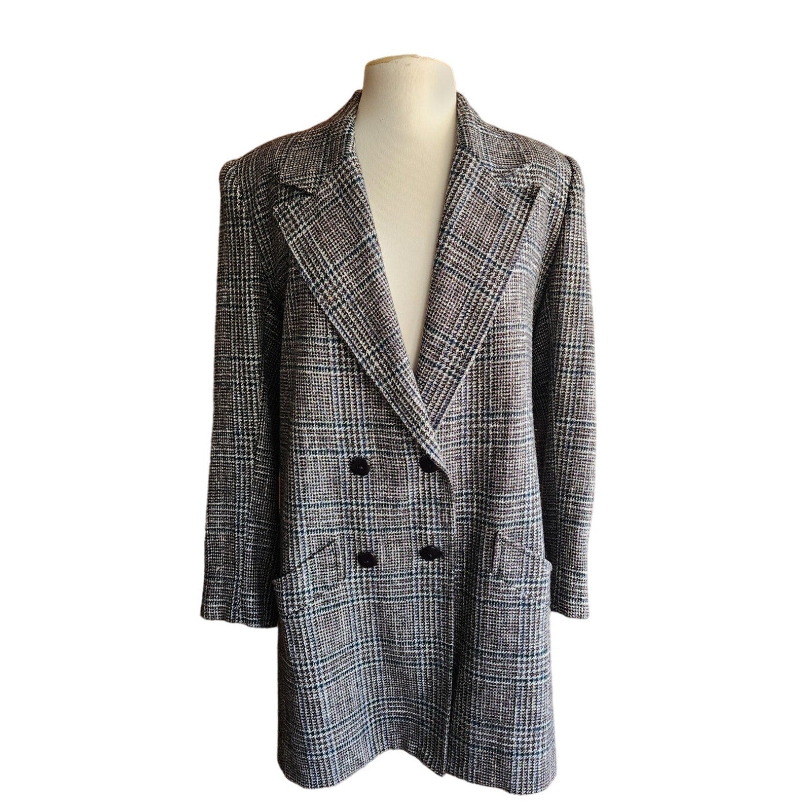 Features large, notched collar and double breasted closure, it has shoulder pads and pockets at the front hips. Fully lined. The wool feels extra luxurious and fine.