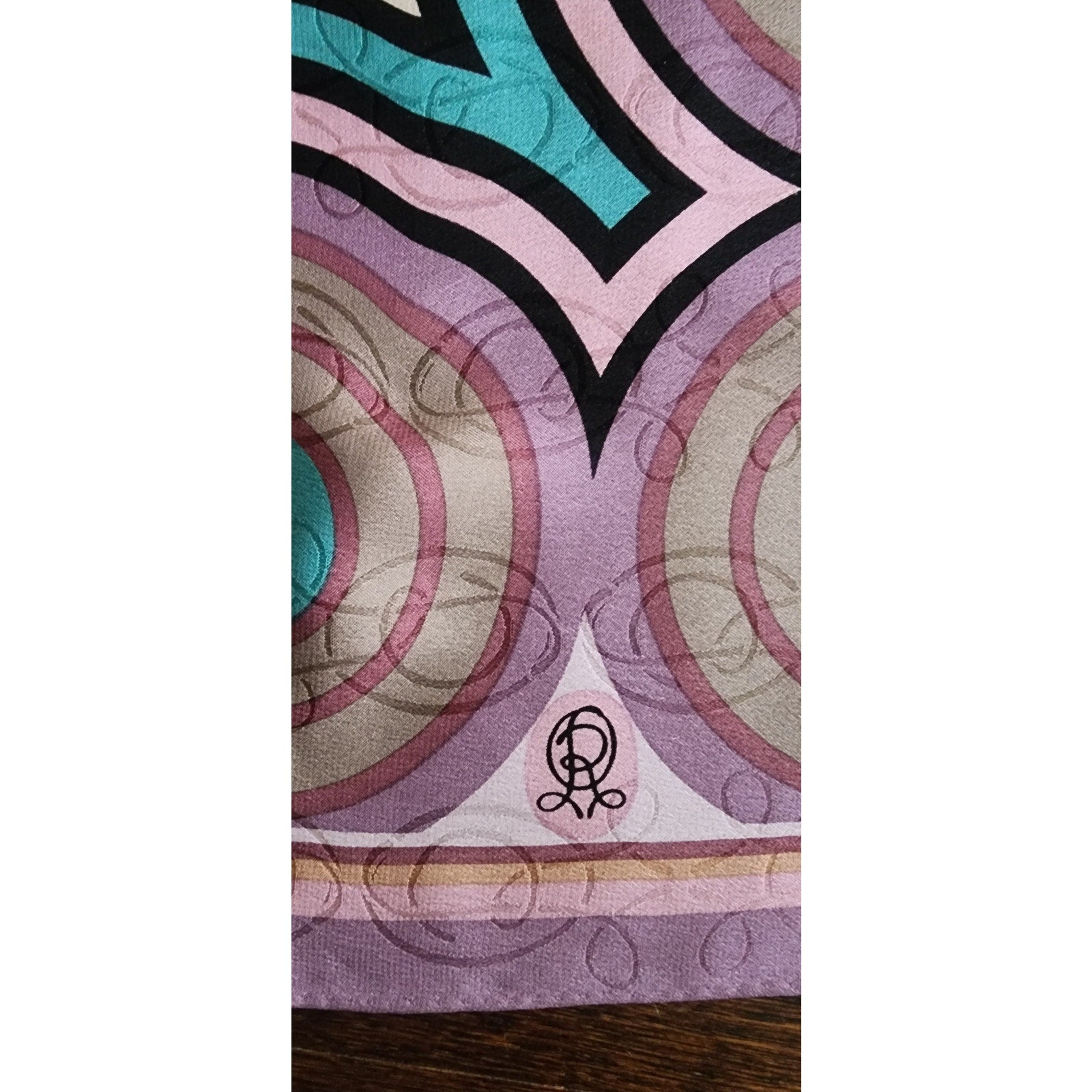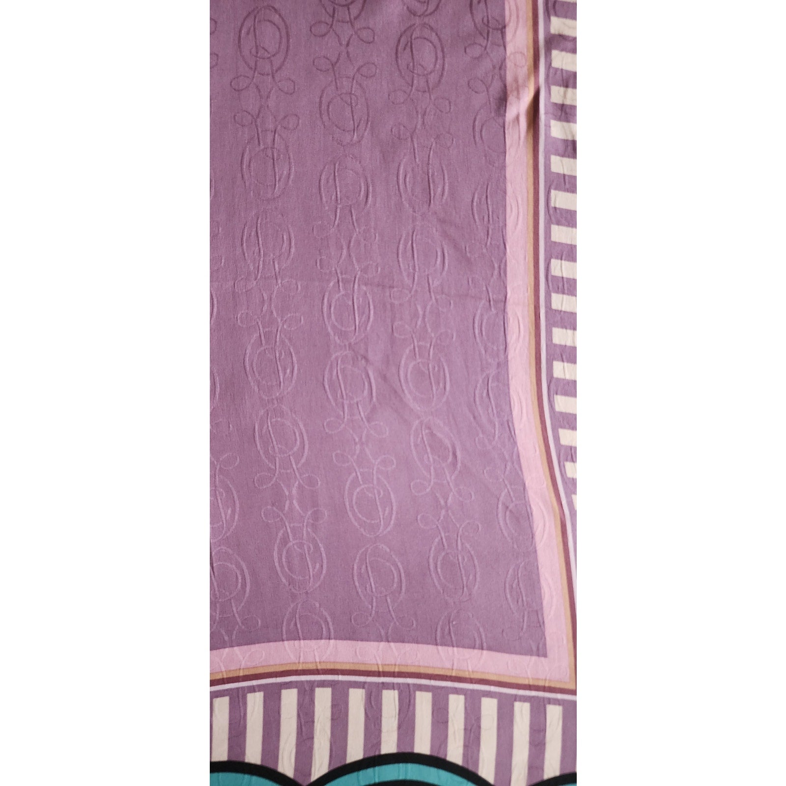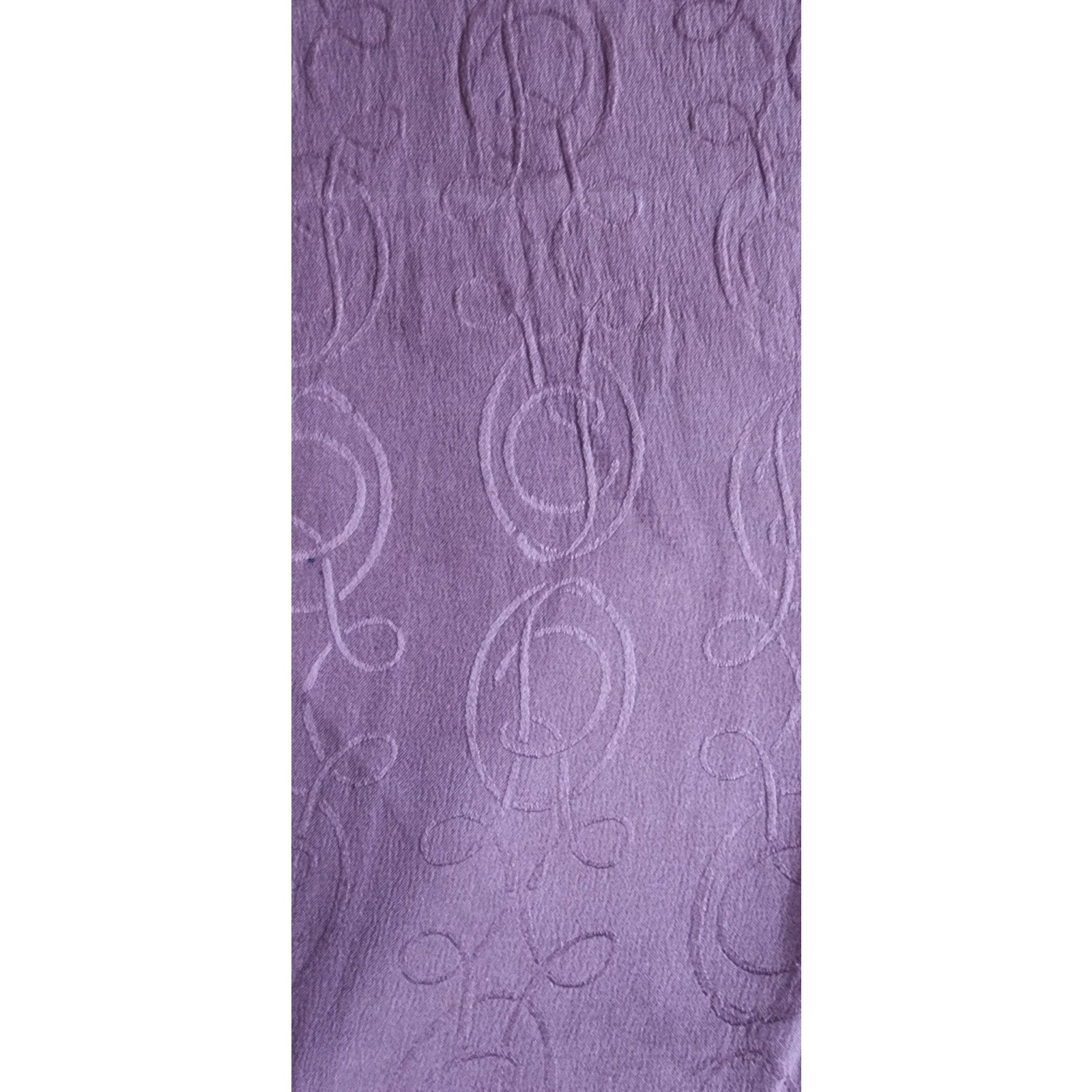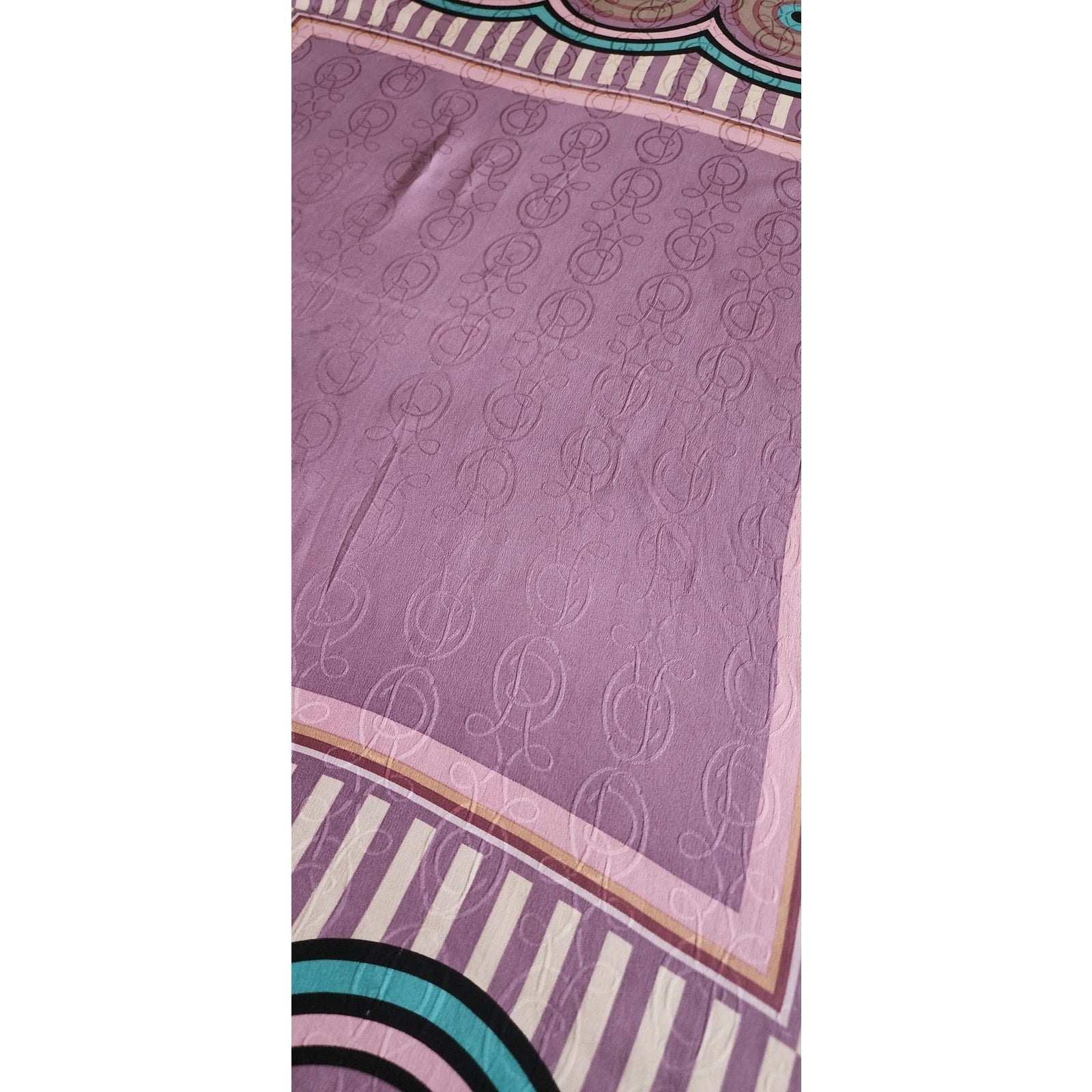 Square shaped, this lovely mauve colored scarf features a subtle ODLR print of the iconic logo all over. The central area is a simple purple-on-purple section of this. The wide border is a striking spiral motif, surrounding this middle. Note the interwoven ODLR logo at right bottom corner n black (pic 9).