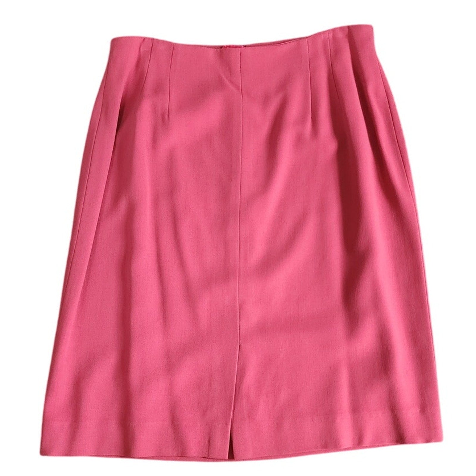 Exquisitely tailored skirt suit in a rust red (or maybe tomato?) wool, the collarless blazer carries most of the style with its sash ties at the neckline, and fitted, hip length silhouette. Shoulders are padded. Closure is buttons down the front. The knee length matching skirt has a flat front style with darts and closes with a button fly. Note the little slit at center front for ease of mobility.