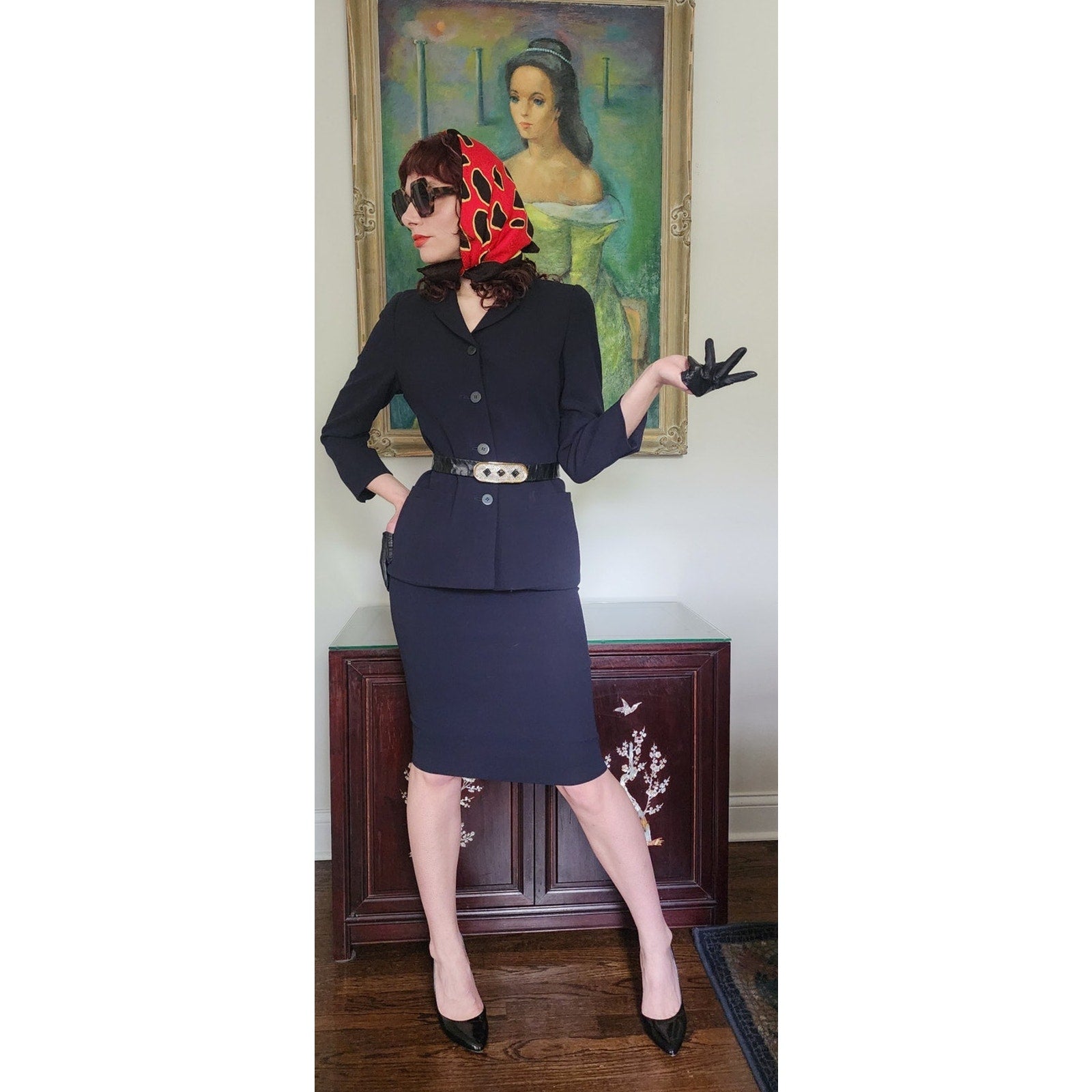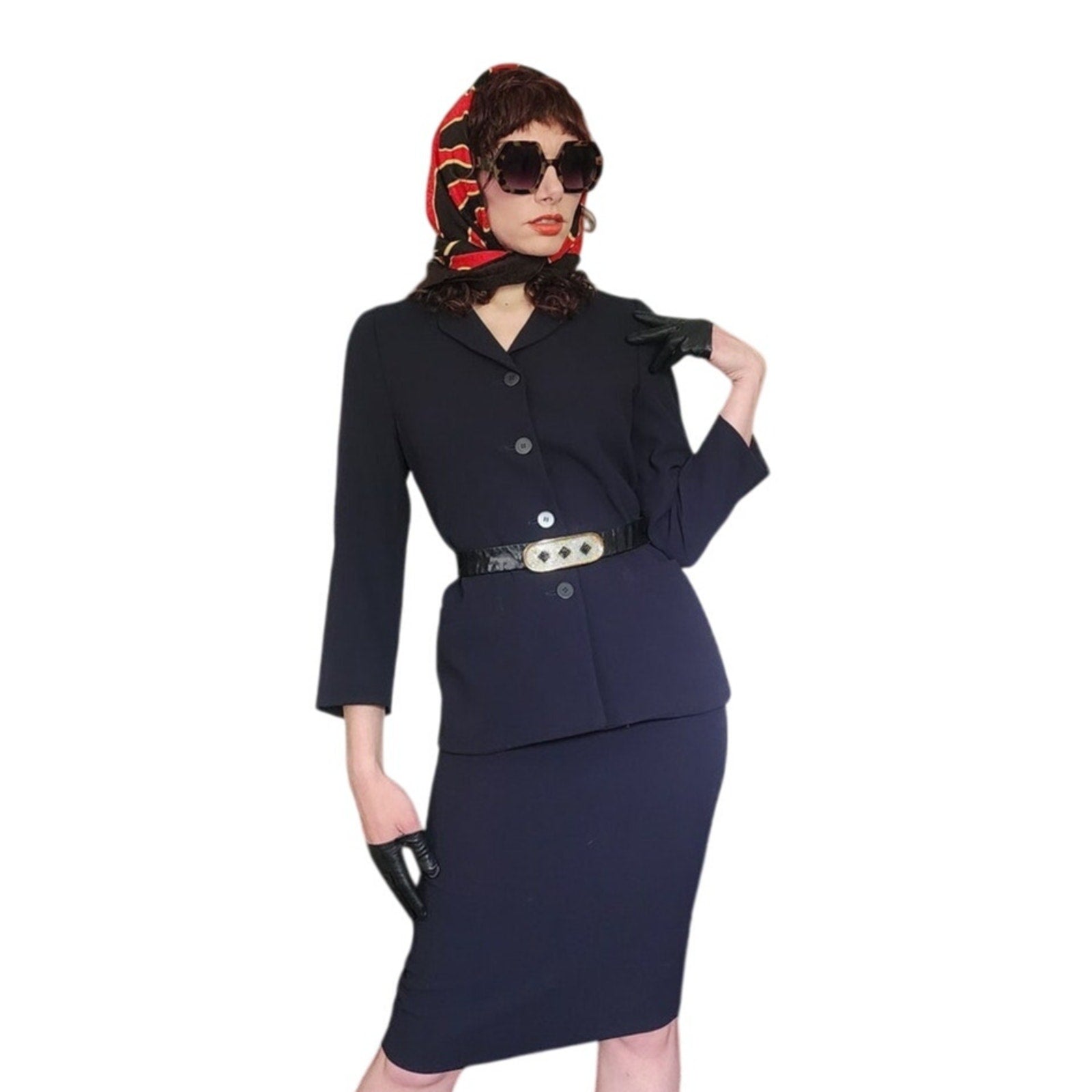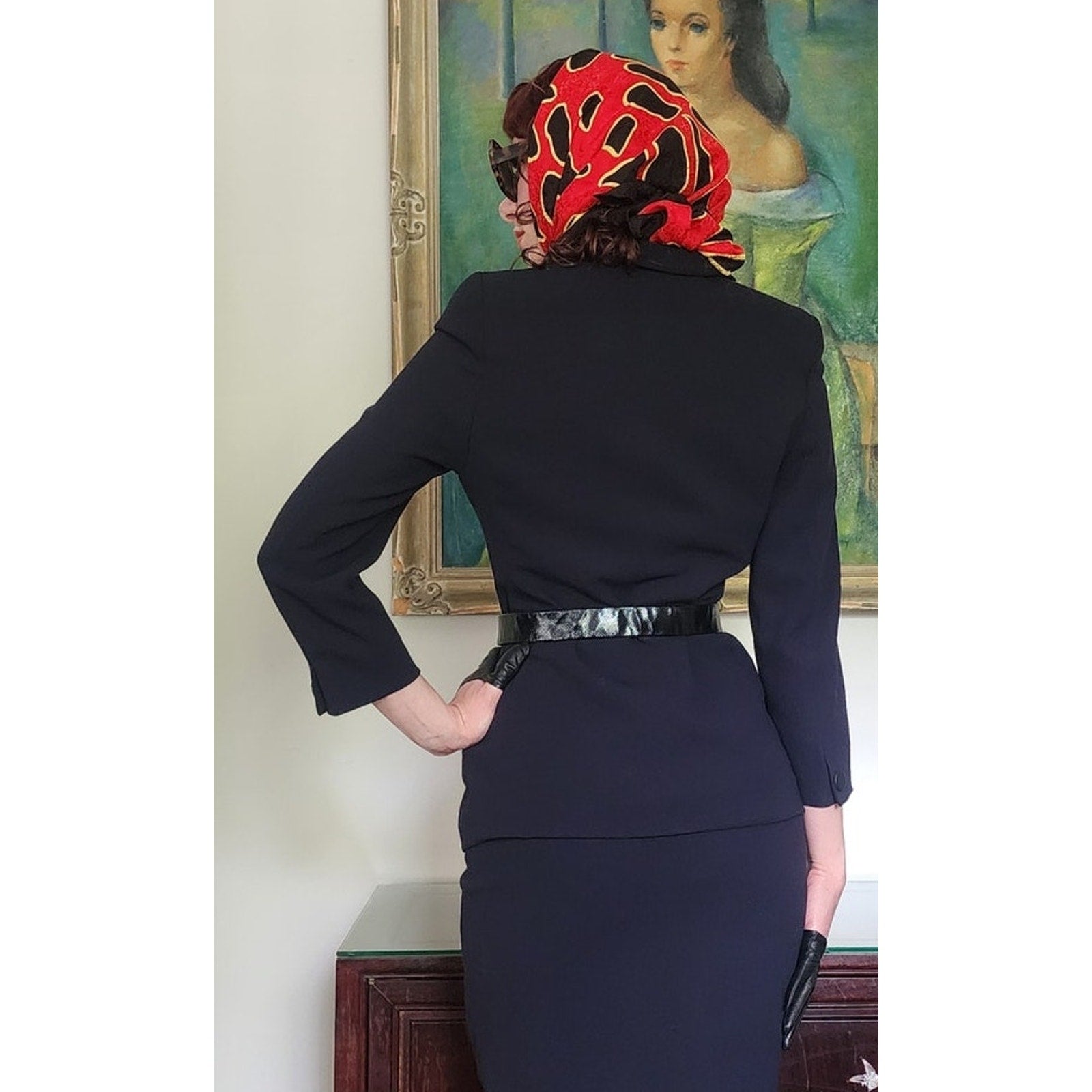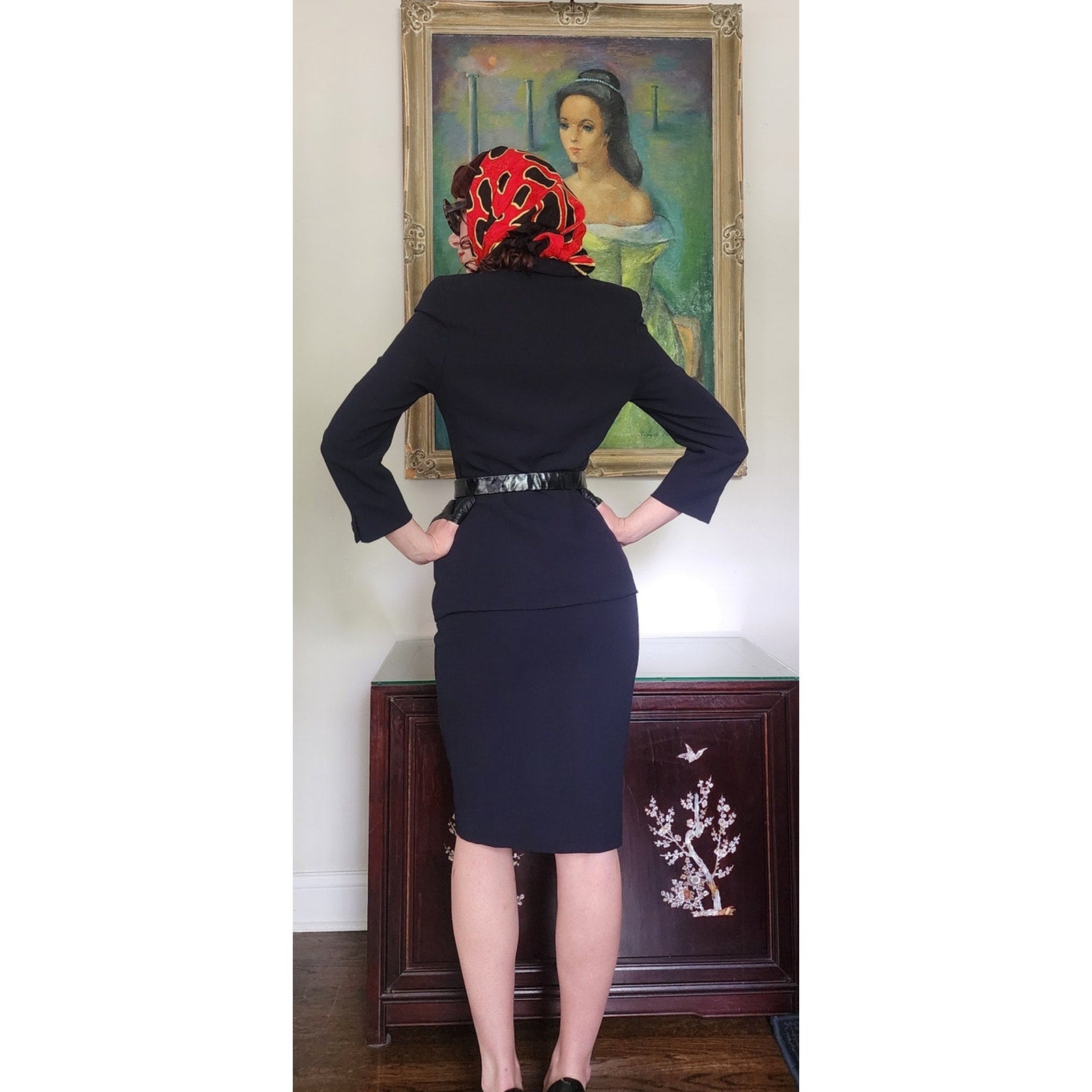 Classic, fitted skirt suit that looks light a light black or a dark navy depending on the light.