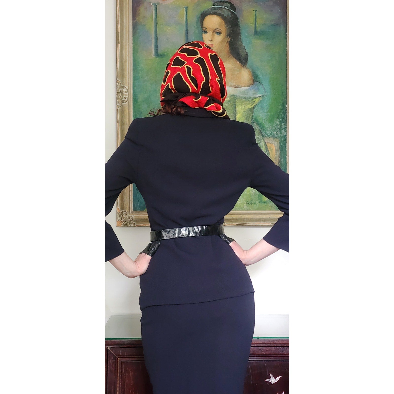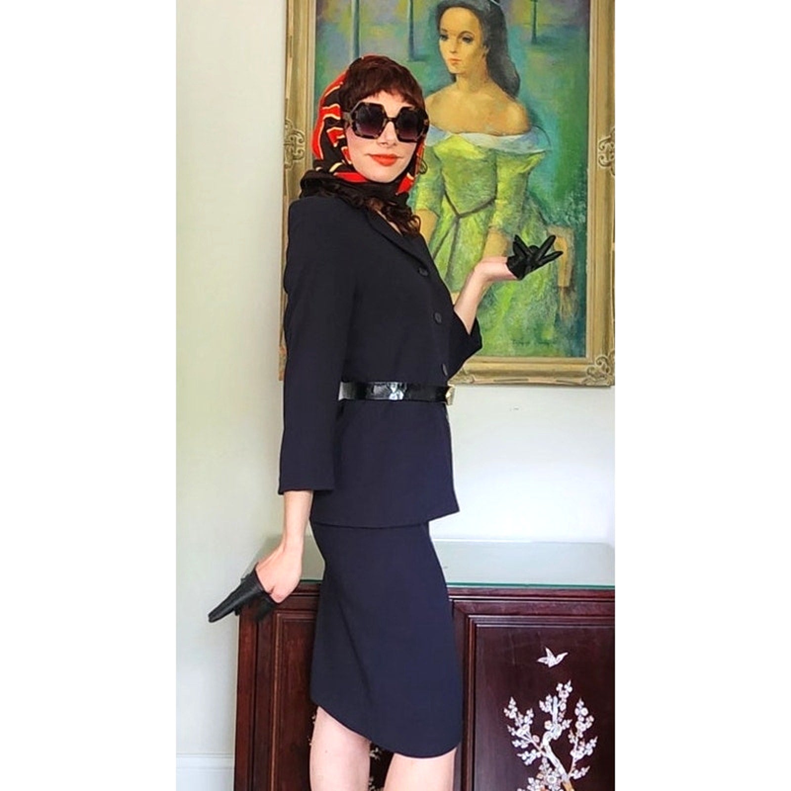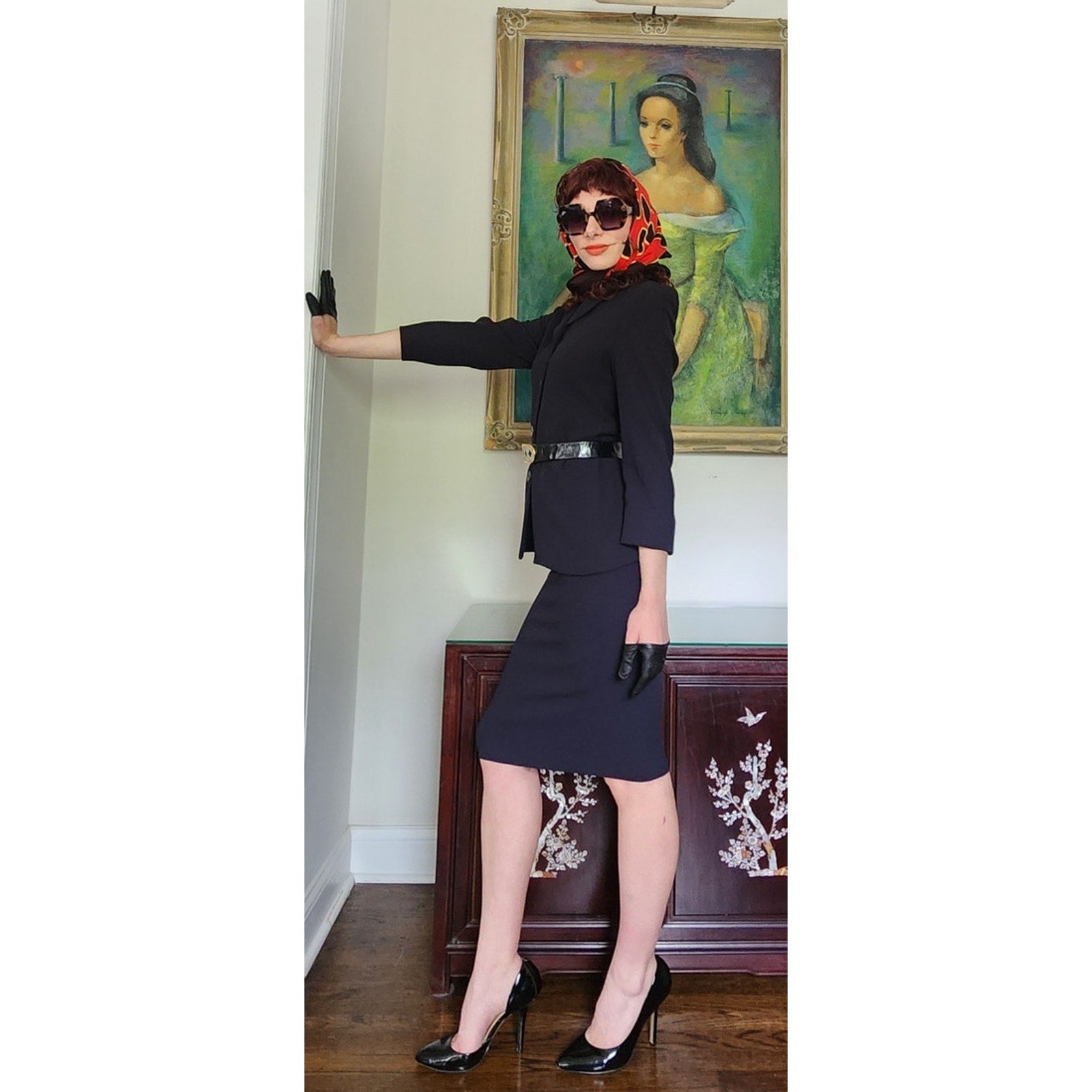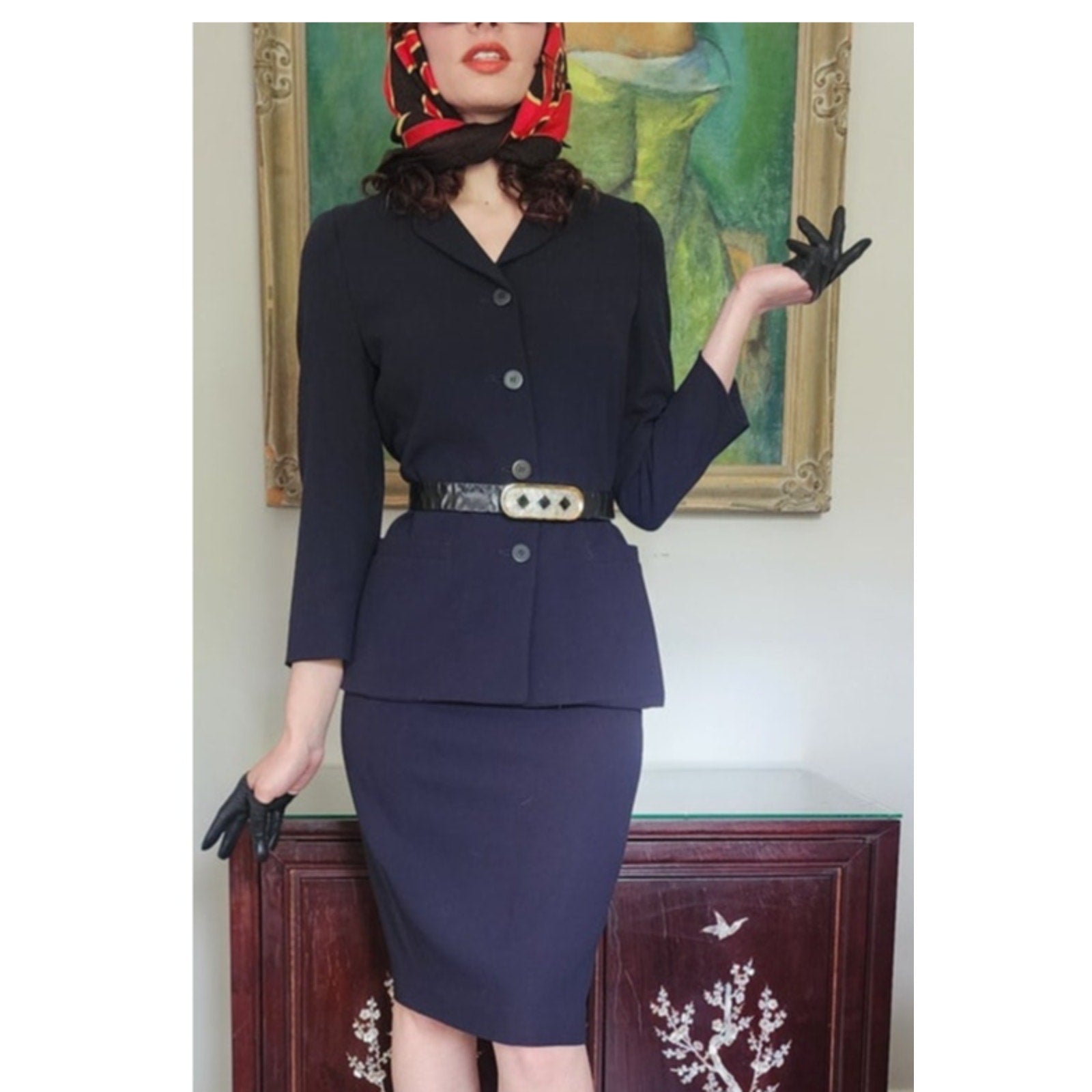 Classic, fitted skirt suit that looks light a light black or a dark navy depending on the light.
