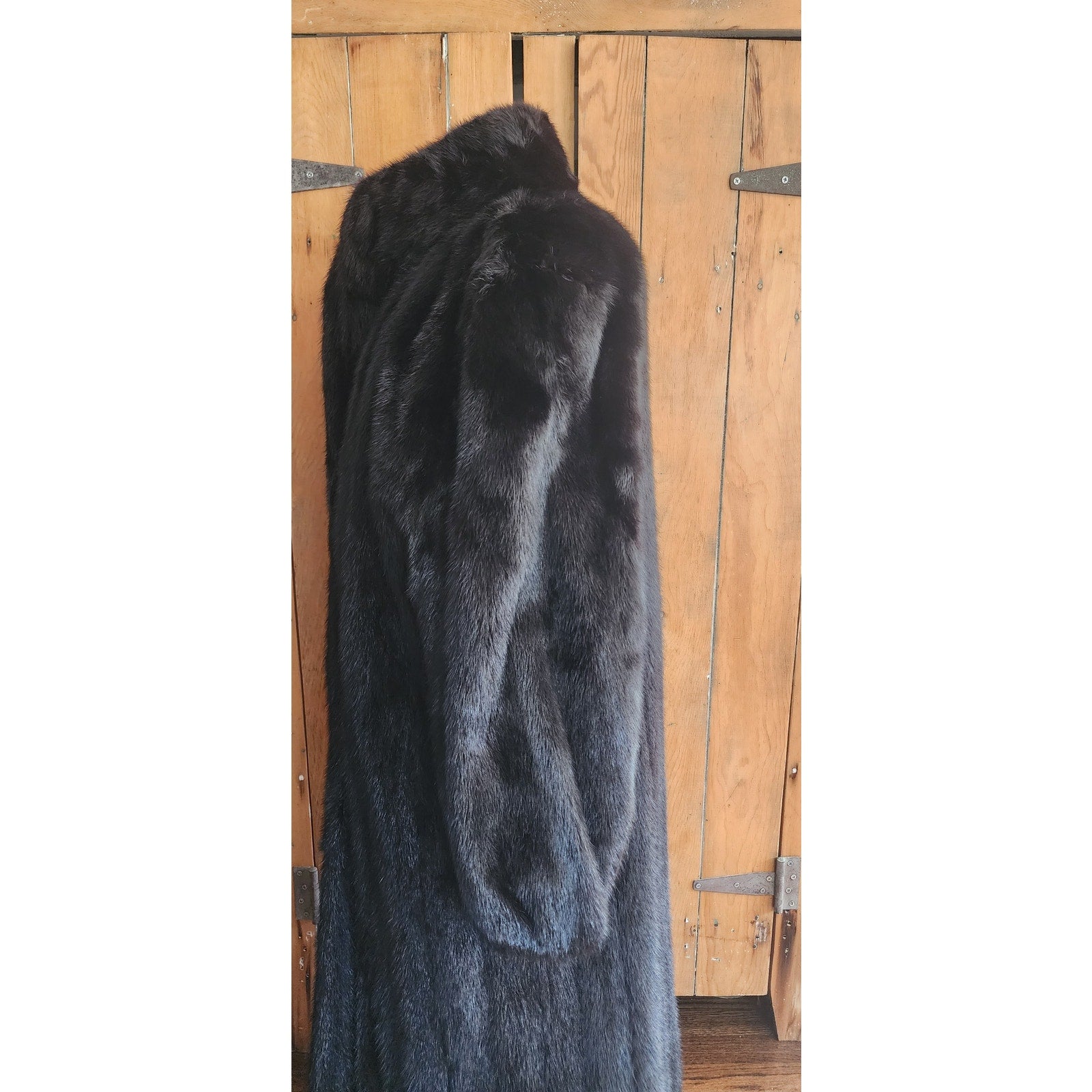 Luxuriously plush, ankle length ranch mink coat in glossy black with hidden hook closure at the front and slit pockets at the hips. Features a small, upturned collar and wind sleeves (elastic at the liner) to keep the wind out! Fully lined.