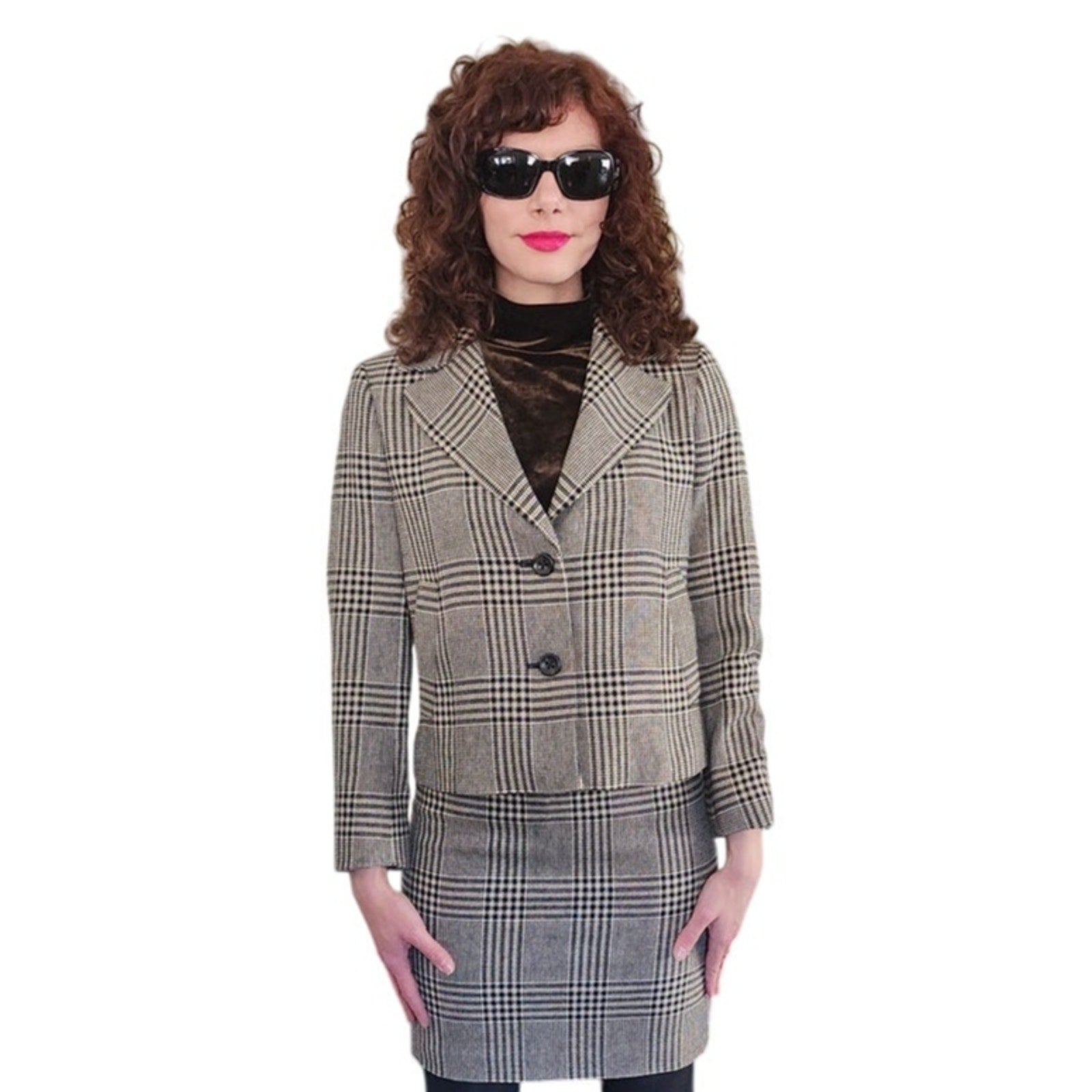 Classic fitted blazer that is cropped, has a fold down collar, and closes at center chest with two buttons and has slit pockets at the hips. Fully lined. The matching high waisted skirt is above the knee and zips at the back. Fully lined, it has a slit at center rear.