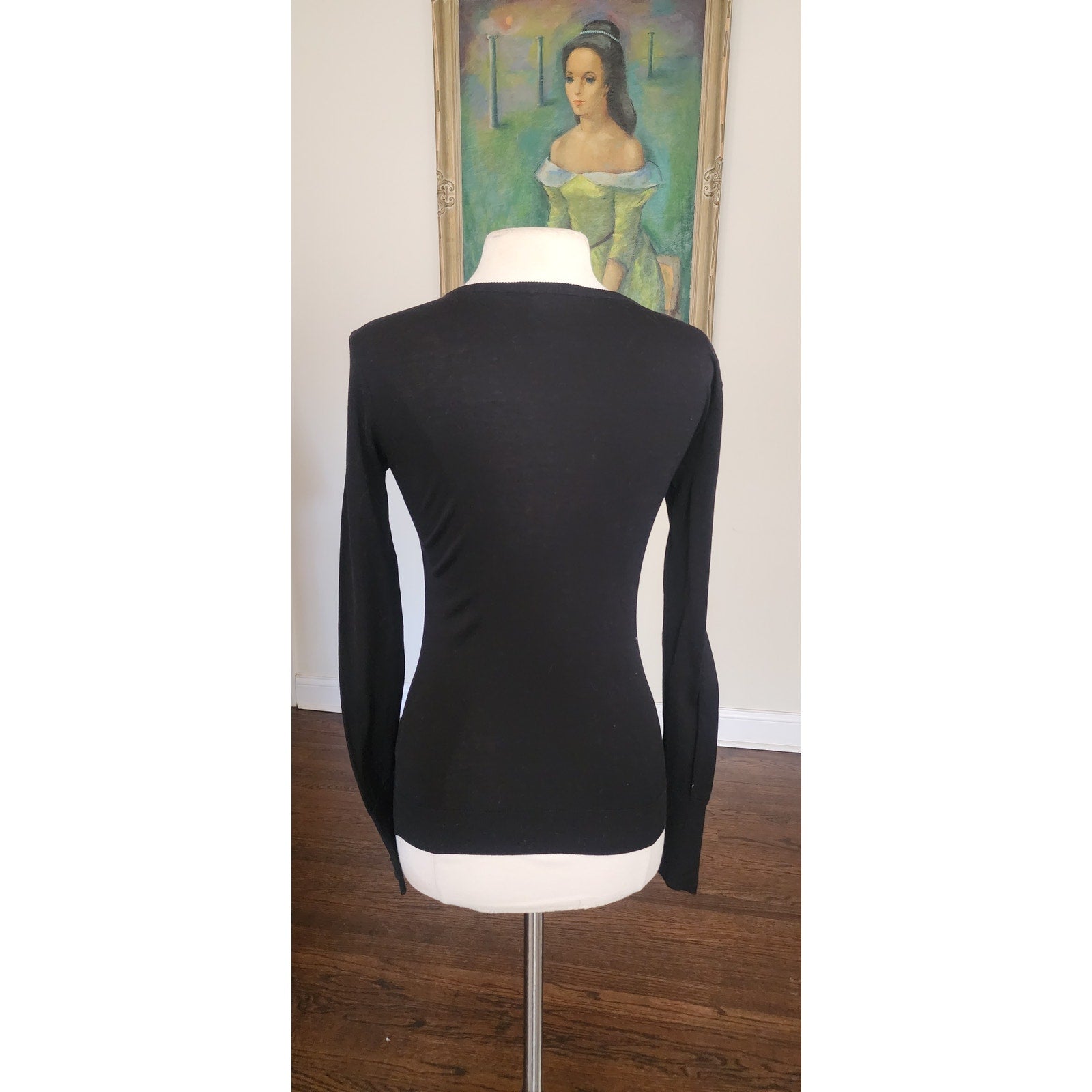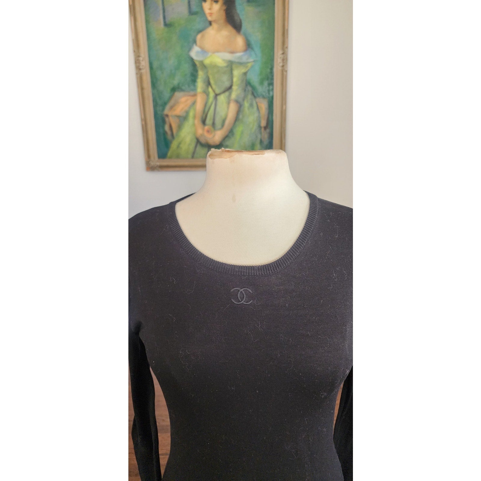 Classic pullover from the Spring 1995 collection (time of Karl Lagerfeld) with crew neckline and long, fitted sleeves featuring ribbed cuffs that fold up as you look and a ribbed waistband. Note the embroidered CC logo at center neck. Simple and luxurious at the same time.