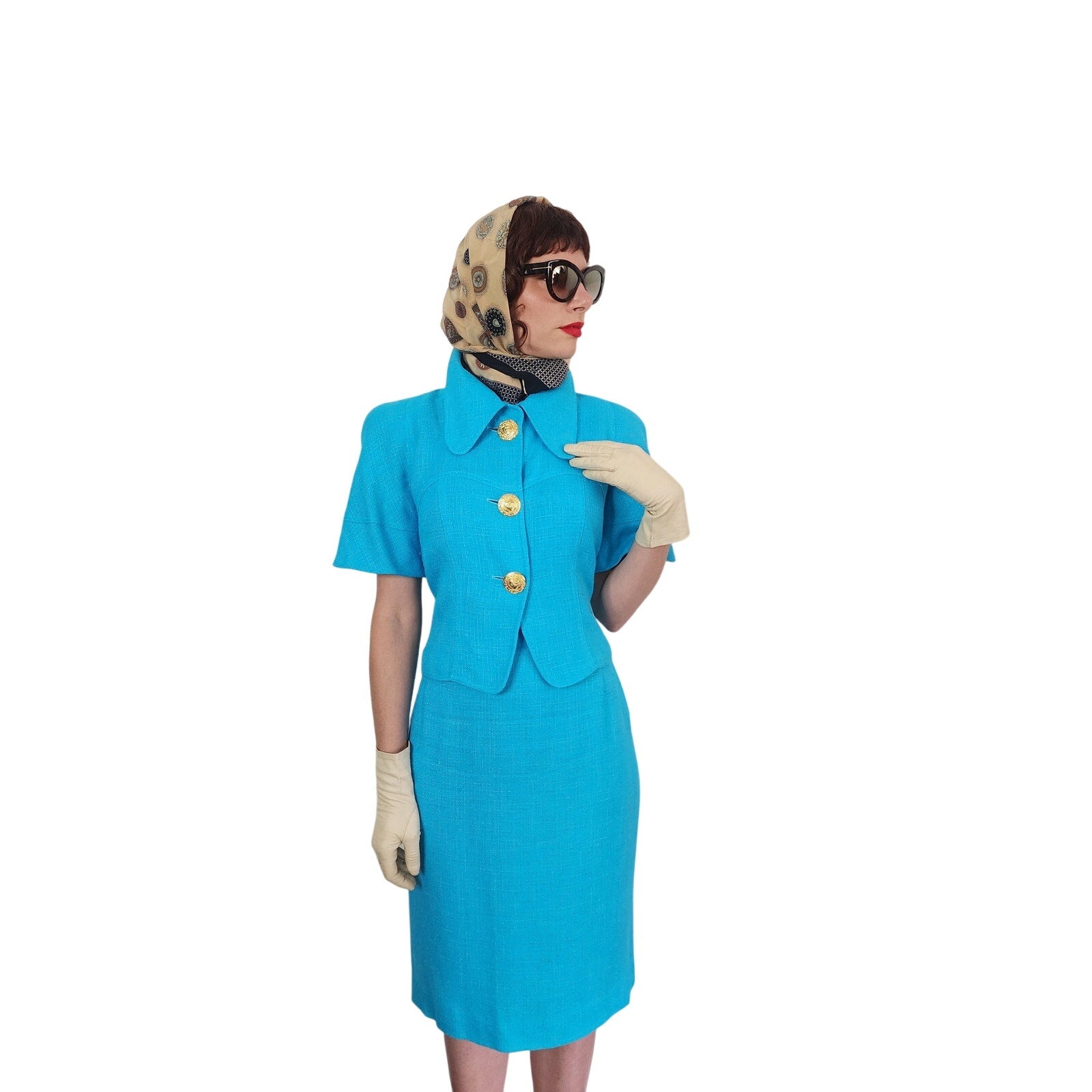 Exquisitely tailored summer skirt suit in matching turquoise blue. The short sleeved blazer is fitted with a fold down collar, padded shoulders and large, gold embossed buttons down the center for closure. Matching skirt is high waisted, knee length and closes with a button-fly. Both pieces fully lined.