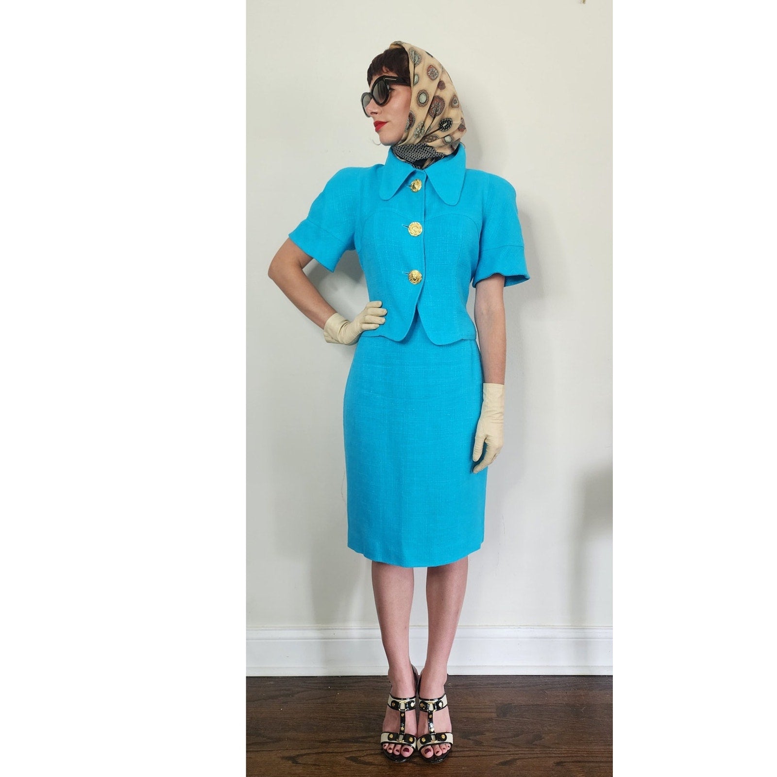 Vintage 1990s Christian Lacroix Skirt Suit Turquoise Blue + Gold Buttons / M
