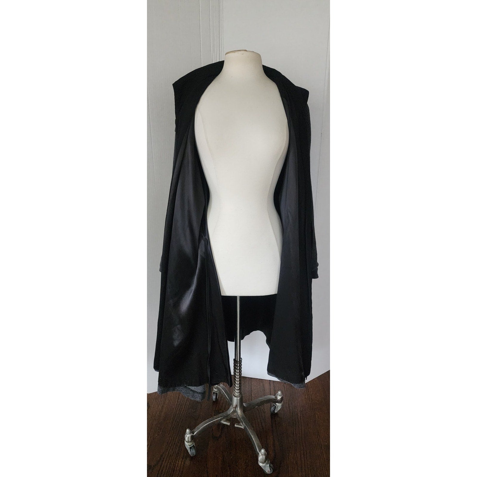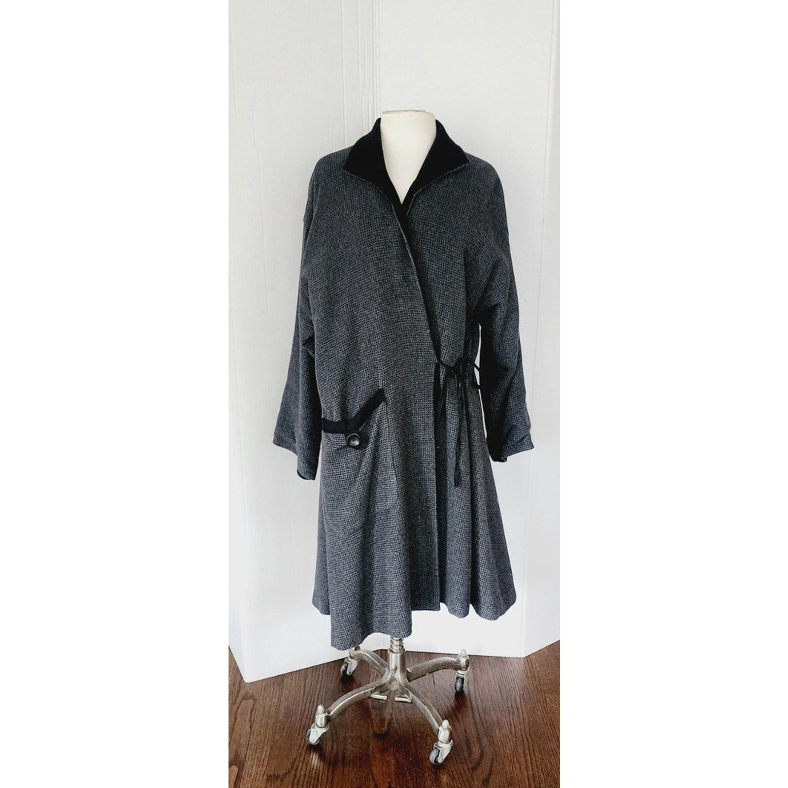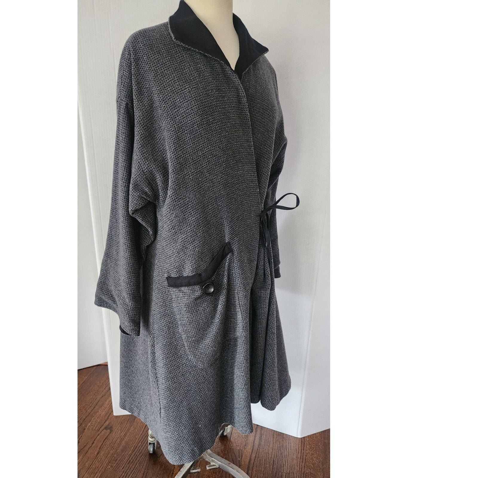 Soft bodied "art" coat in a gray grid pattern it is constructed in the robe or wrap style with an interior tie sash as well as an exterior one, echoing kimono or japanese traditions. It has a large, fold-down collar in contrasting black and long, wide sleeves that can be cuffed to reveal the black lining. The right hip displays a large, apron pocket, delineated with a decorative button. Fully lined in satin. Comfortable and surprisingly warm!
