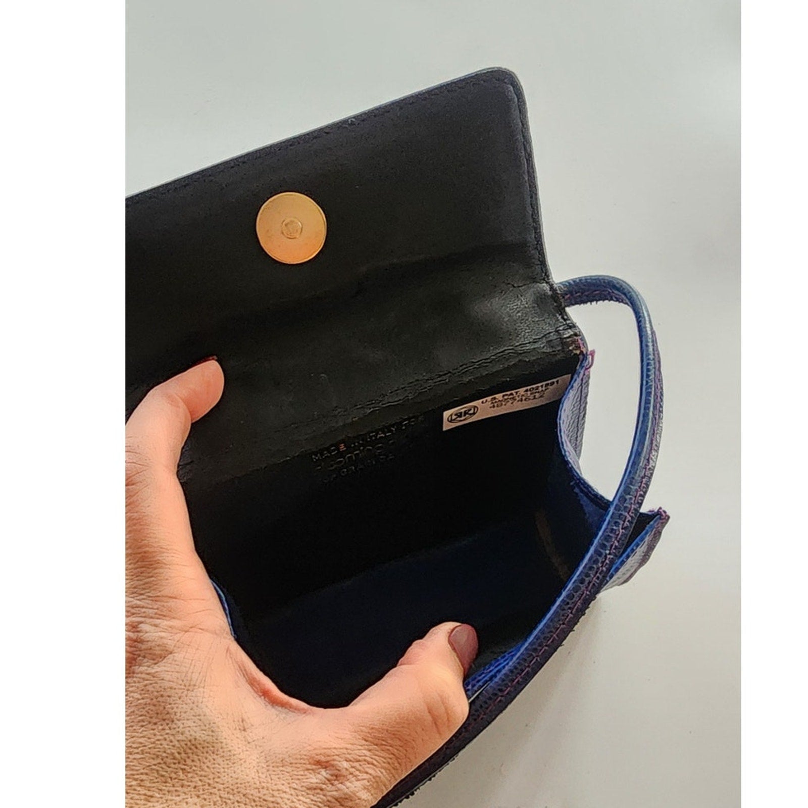 Trapezoid shaped little purse in blue leather stamped to look like lizard skin, it has a front flap closure at top and stands on a base. Top has a little curved handle in matching leather, as well as a long shoulder strap that takes this to a crossbody bag. Interior is black vinyl.