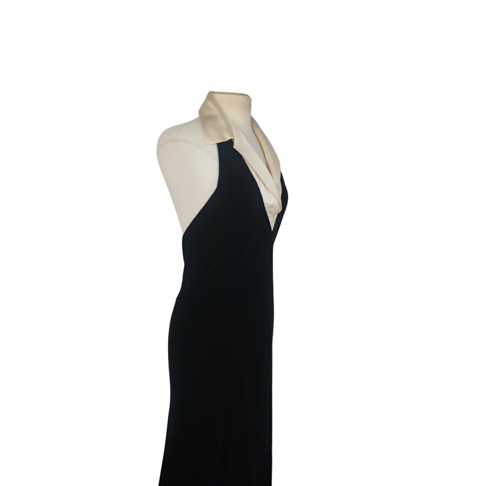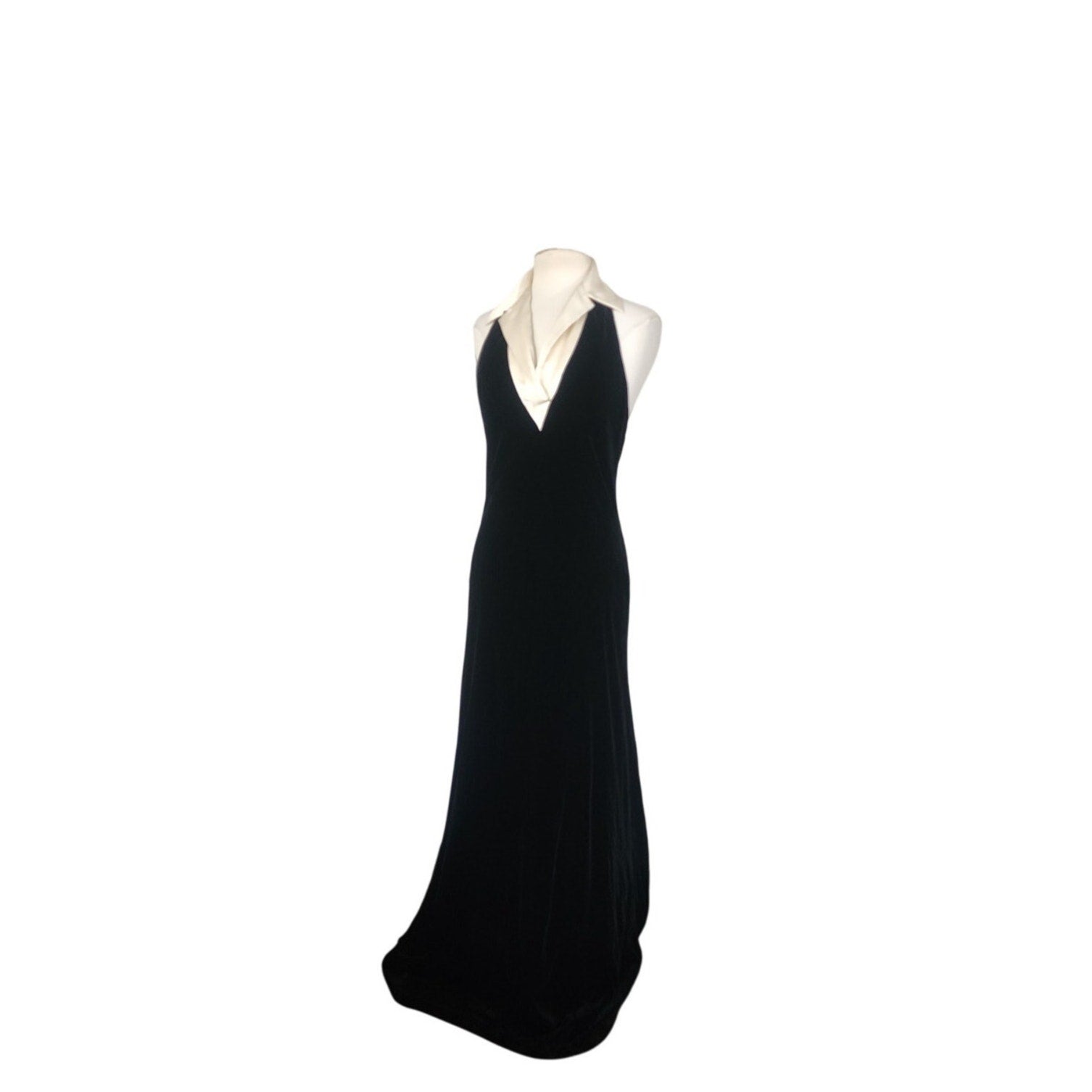 Vintage 1990s Ralph Lauren Evening Dress Black Velvet Halter Top Cream Silk Collar