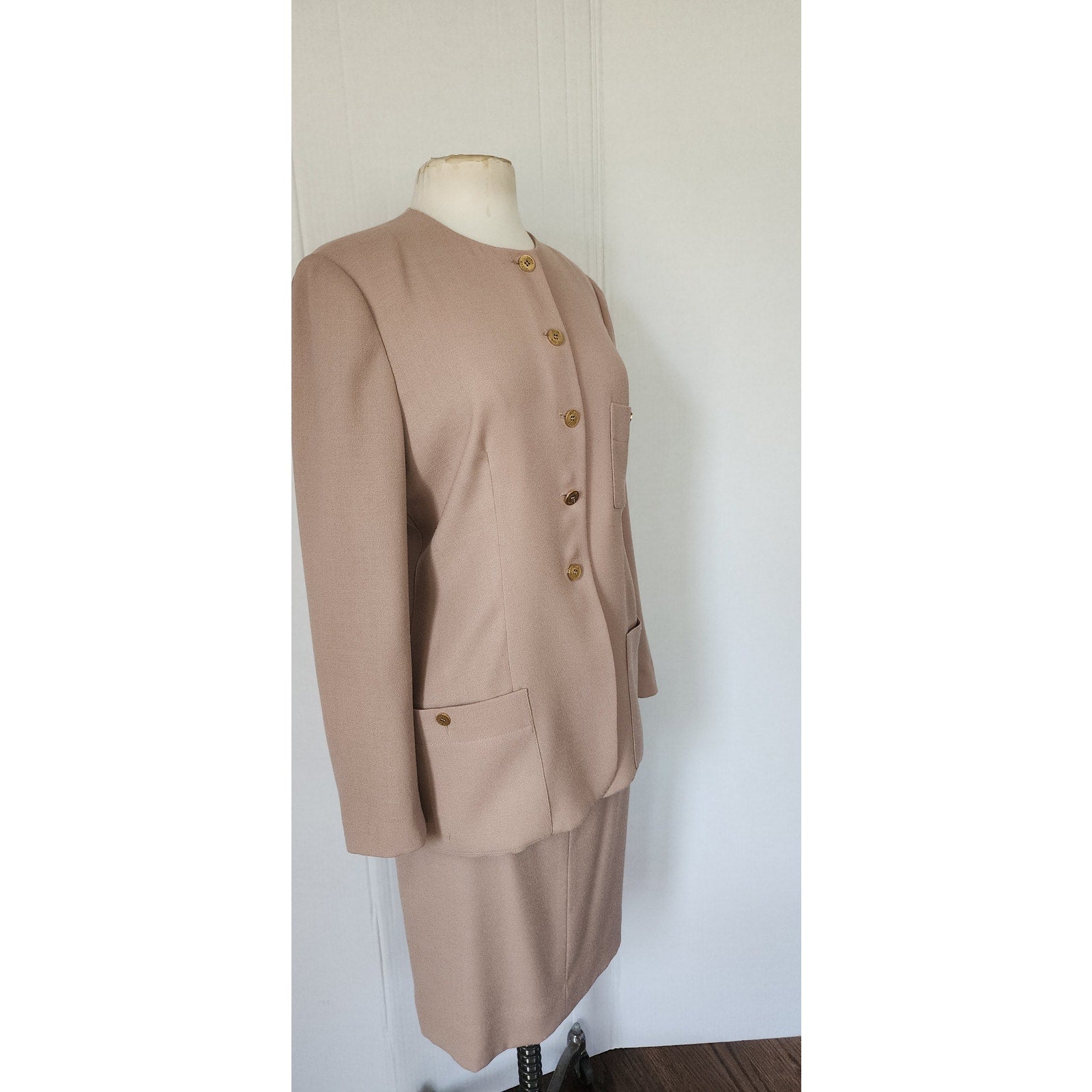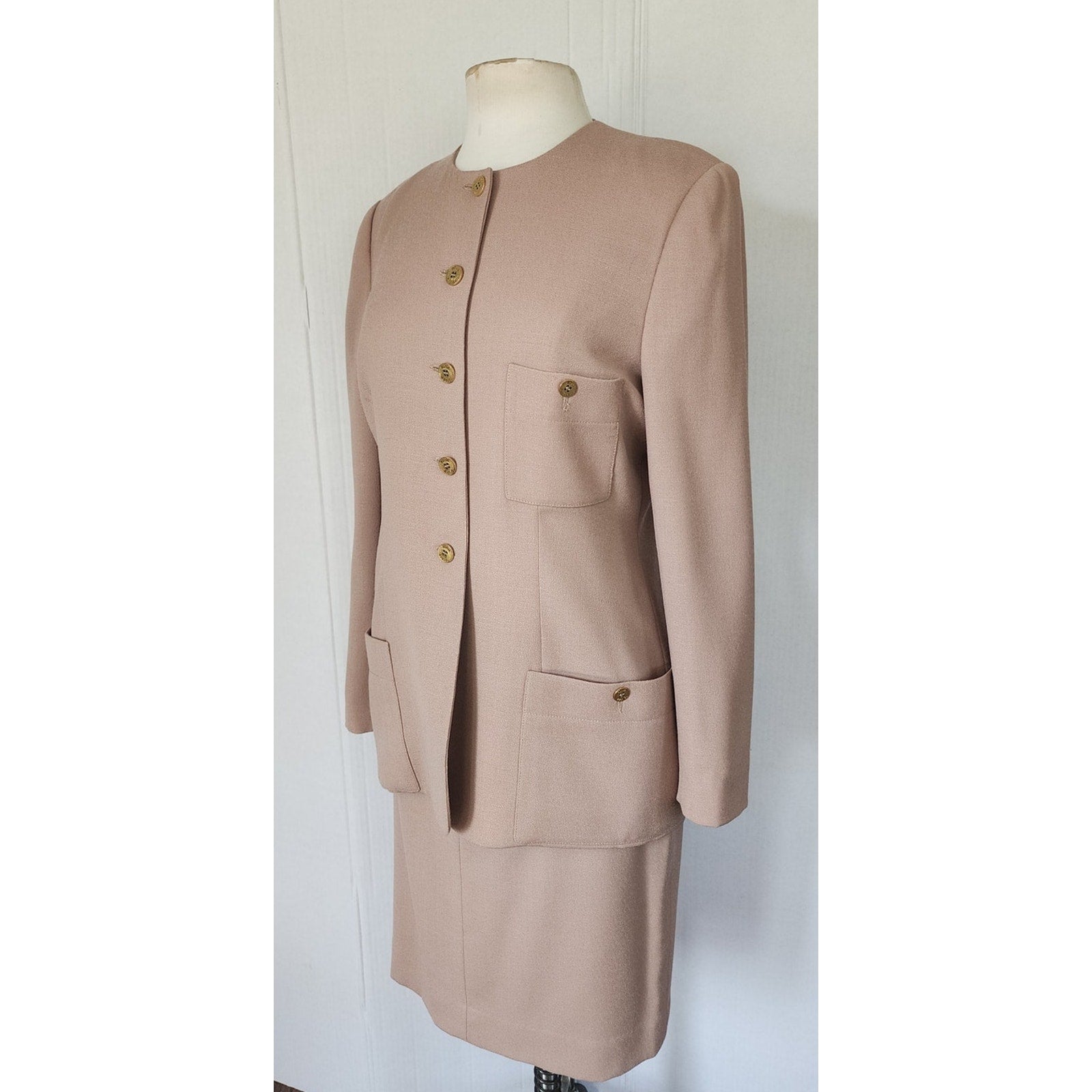 Classic ladyboss jacket and skirt set in a beige wool.