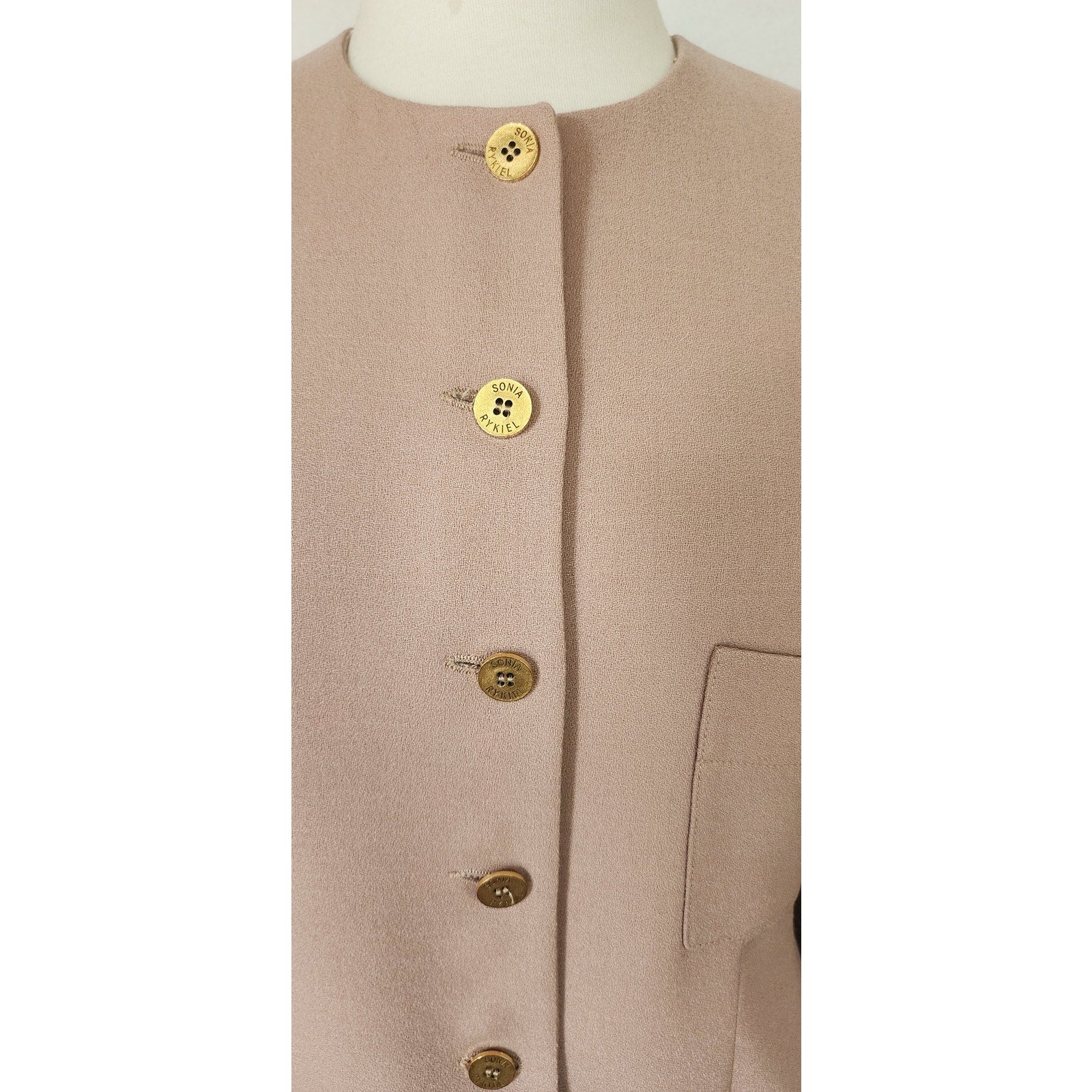 Blazer is collarless, with slightly padded shoulders, and button closure at the center, a chest pocket at left and apron pockets at the hips. Note the gold buttons that offset the look. Slightly nipped at the waist, it is hip length and fully lined.