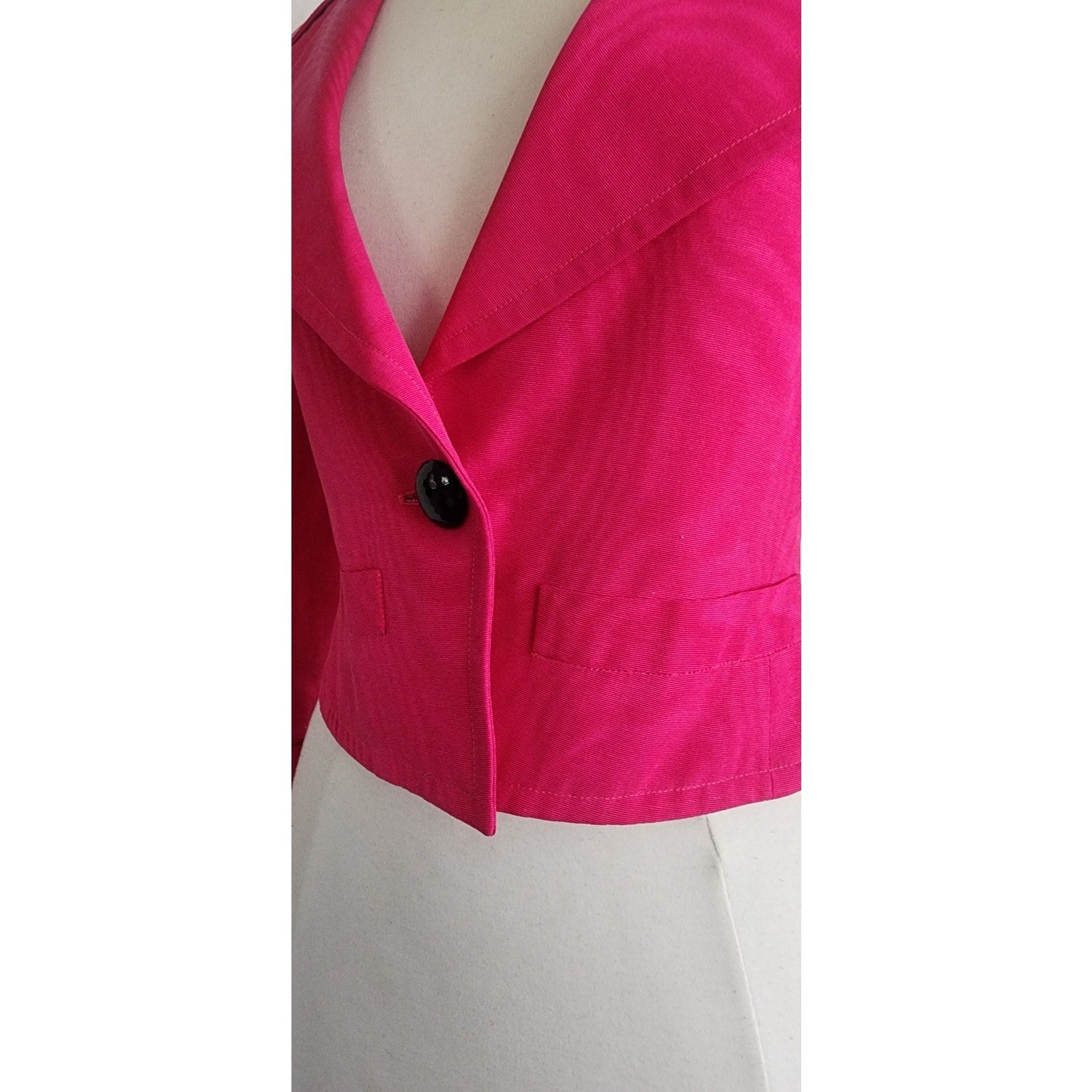 Fitted blazer with single button closure at center in a waterfall satin silk in hot pink or fuschia. Features a large, fold down collar and padded shoulders. Long sleeves have notched, upturned cuffs. Nipped waist with shallow pockets at the hip fronts. Fun, large button in shiny black. Fully lined.