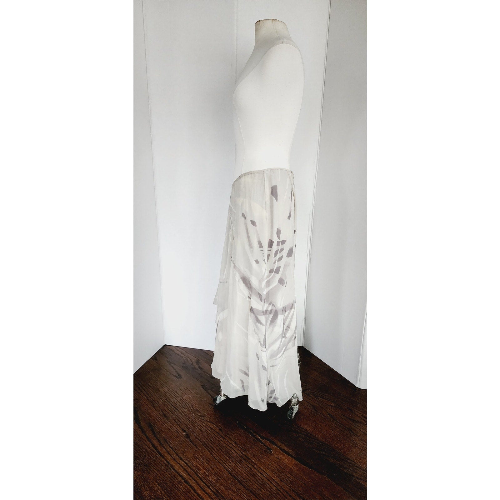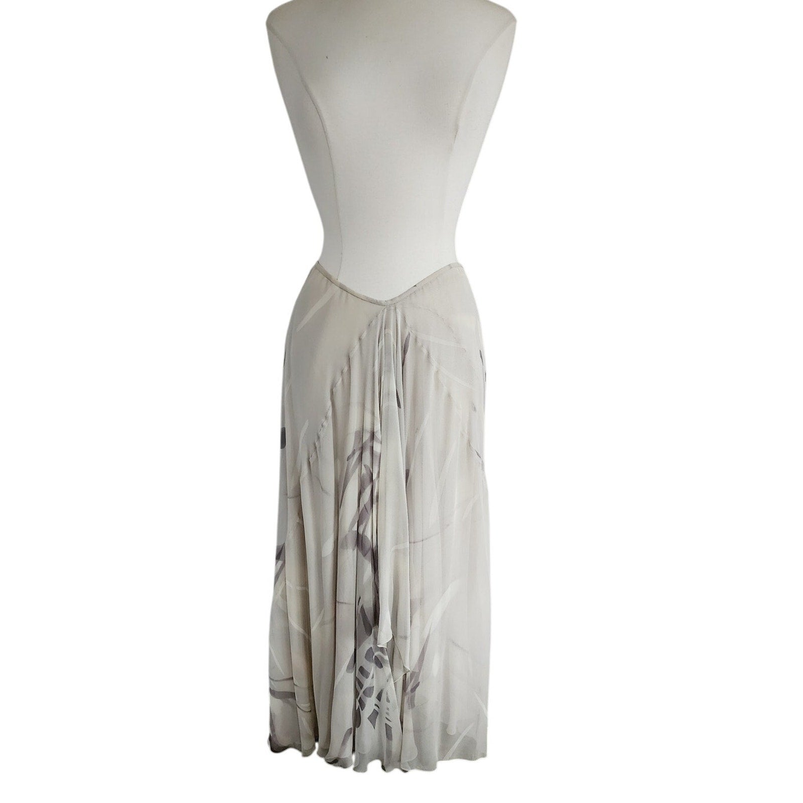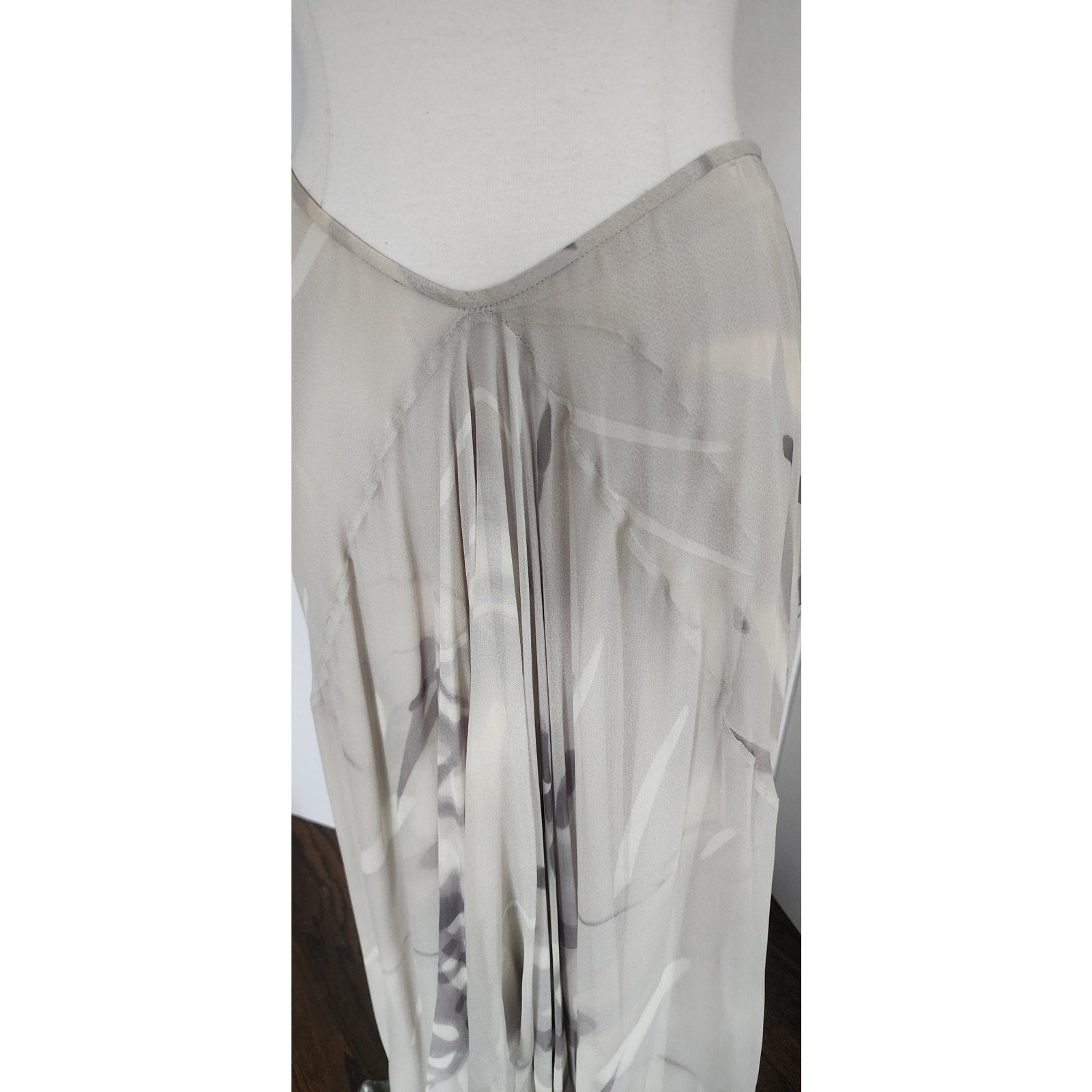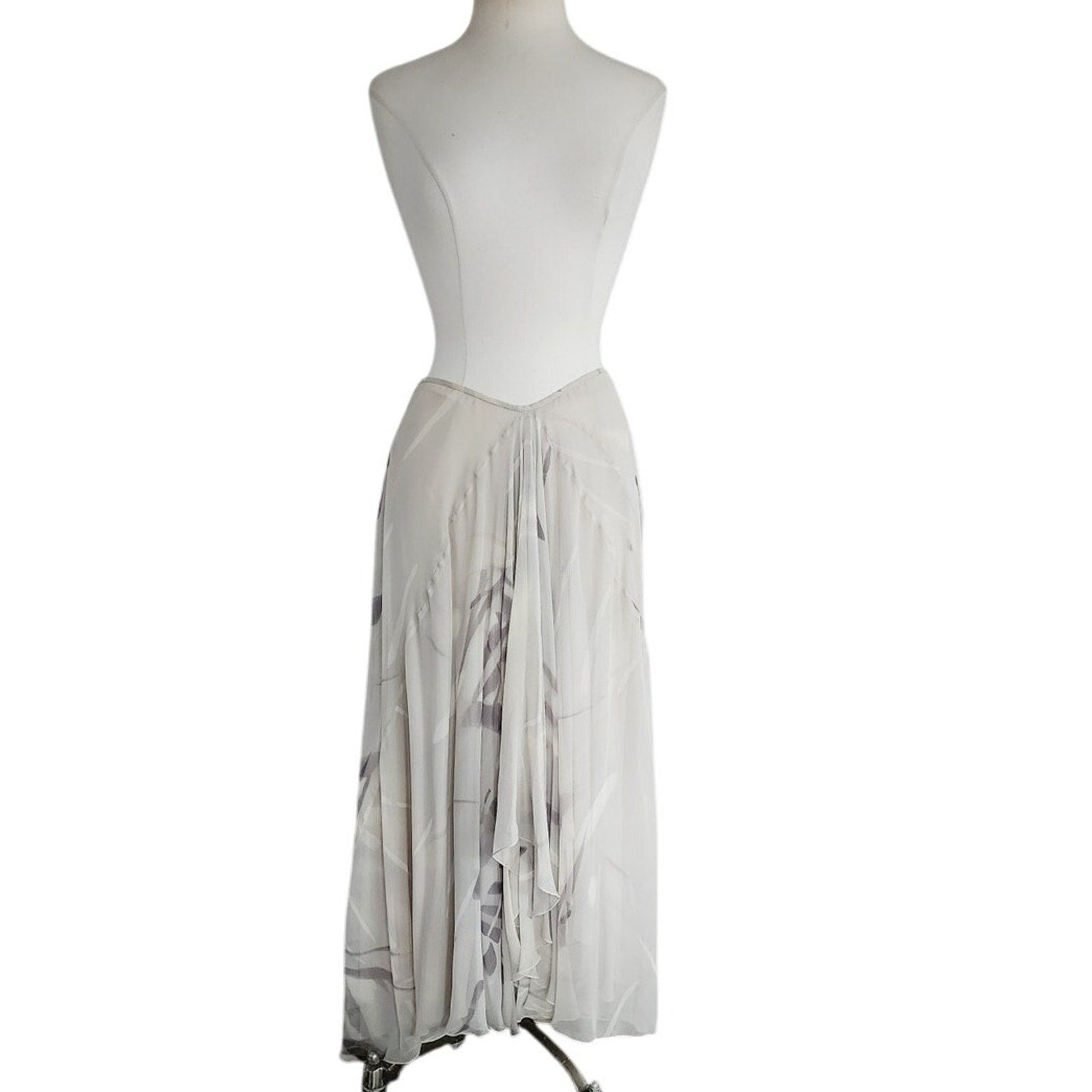 Long and flowy silk skirt with no waist band and zippered closure at the center rear, note the central front area that is gathered with a waterfall panel and shorter than the rest of the hem. The outer layer is silk chiffon and printed in abstract dark gray leafy pattern. A solid gray chiffon layer appears underneath.