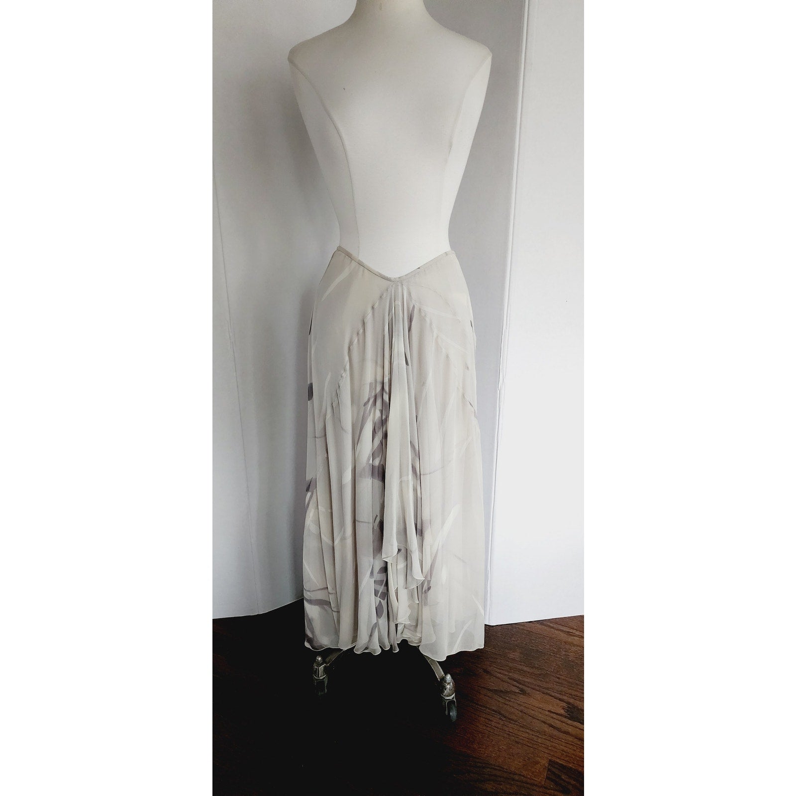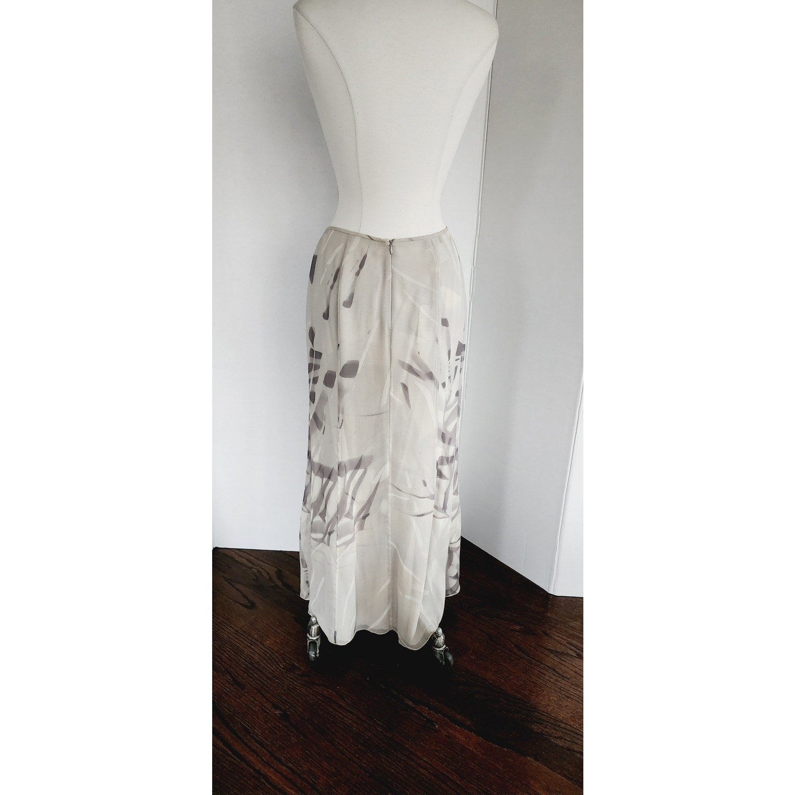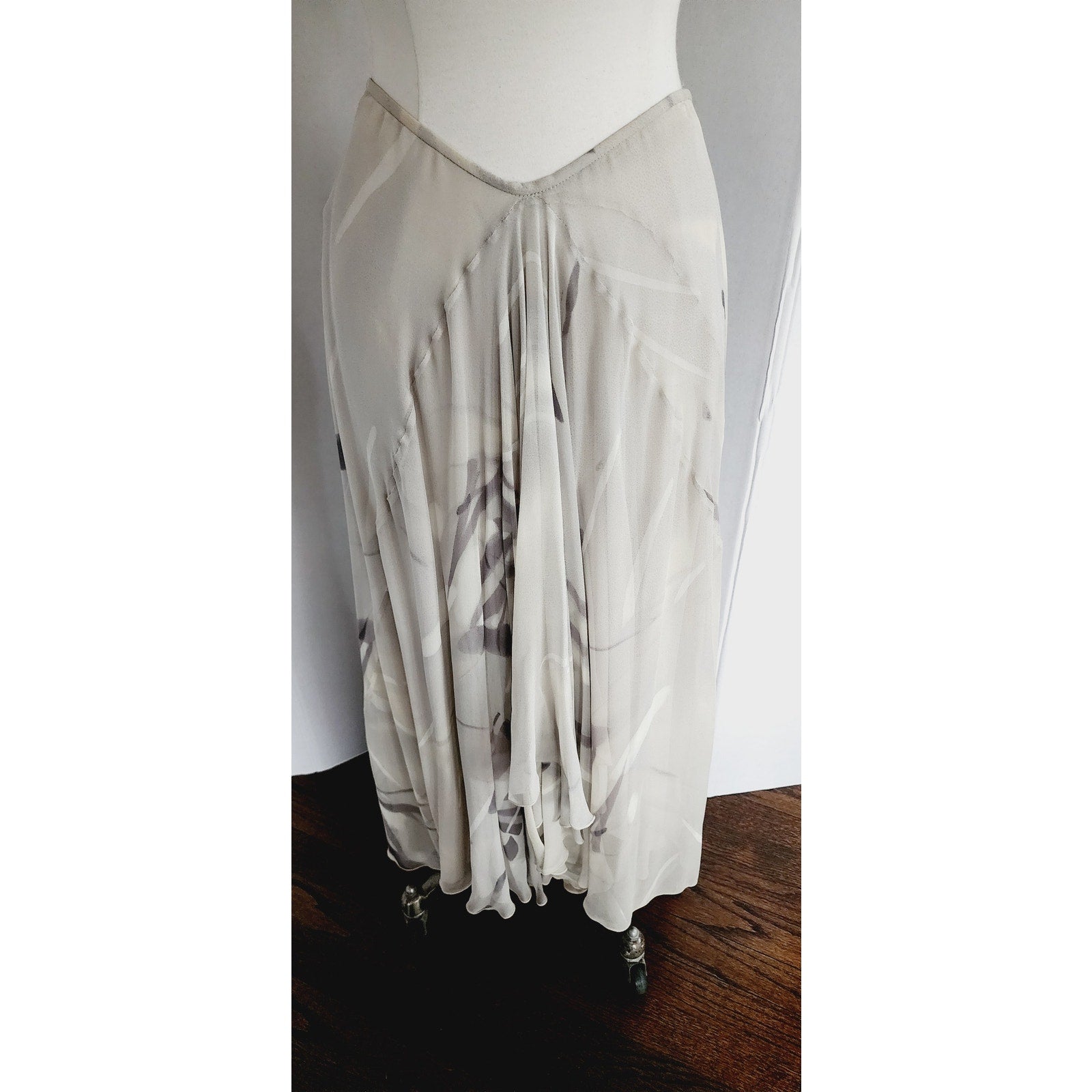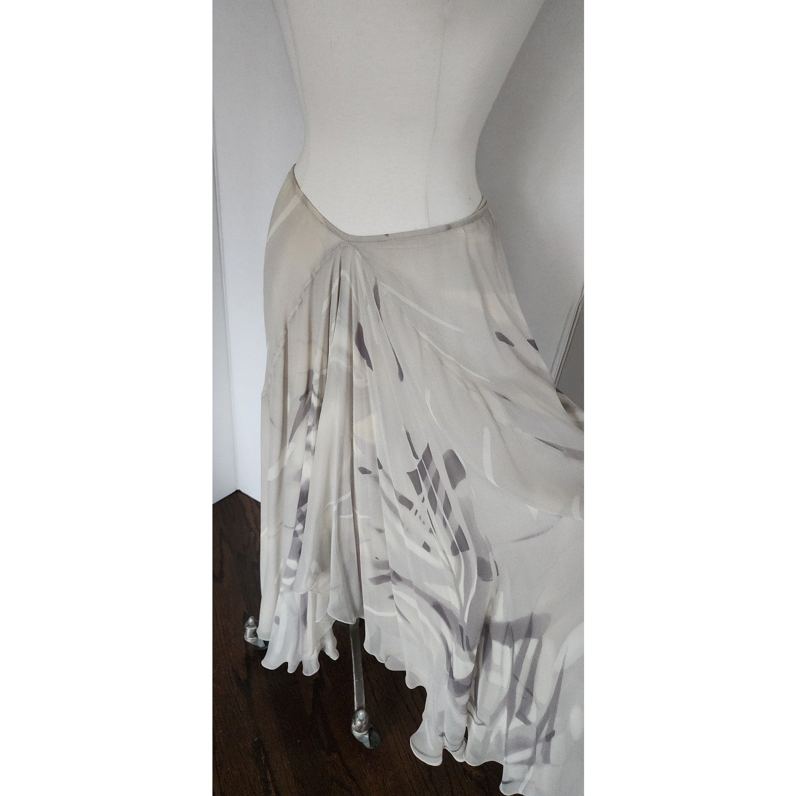 Long and flowy silk skirt with no waist band and zippered closure at the center rear, note the central front area that is gathered with a waterfall panel and shorter than the rest of the hem. The outer layer is silk chiffon and printed in abstract dark gray leafy pattern. A solid gray chiffon layer appears underneath.