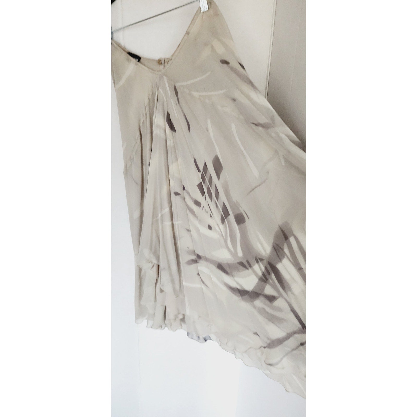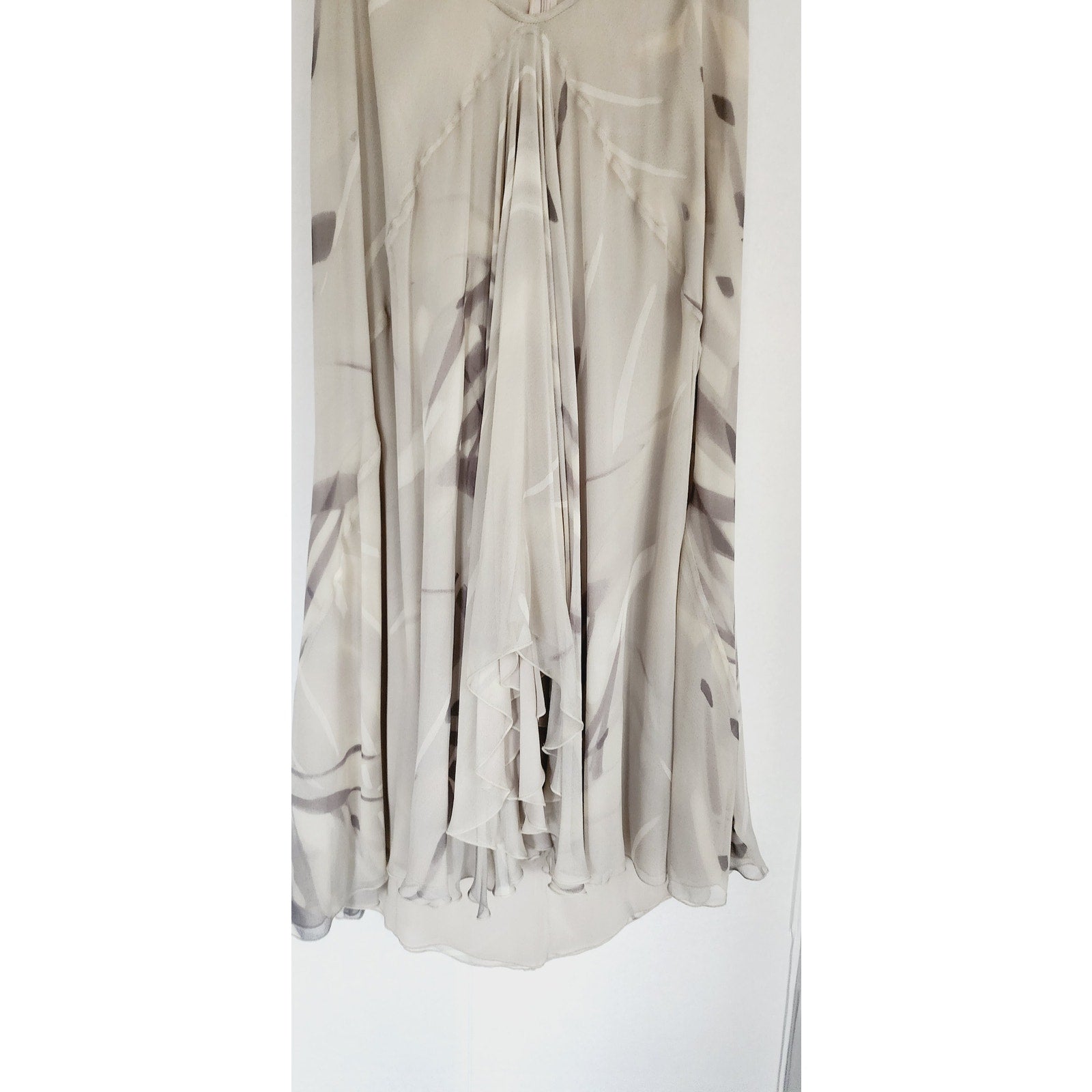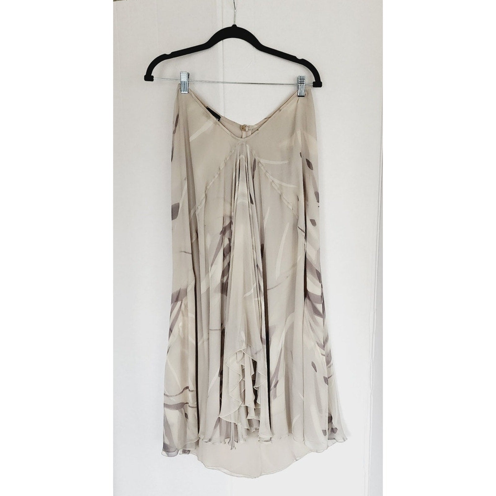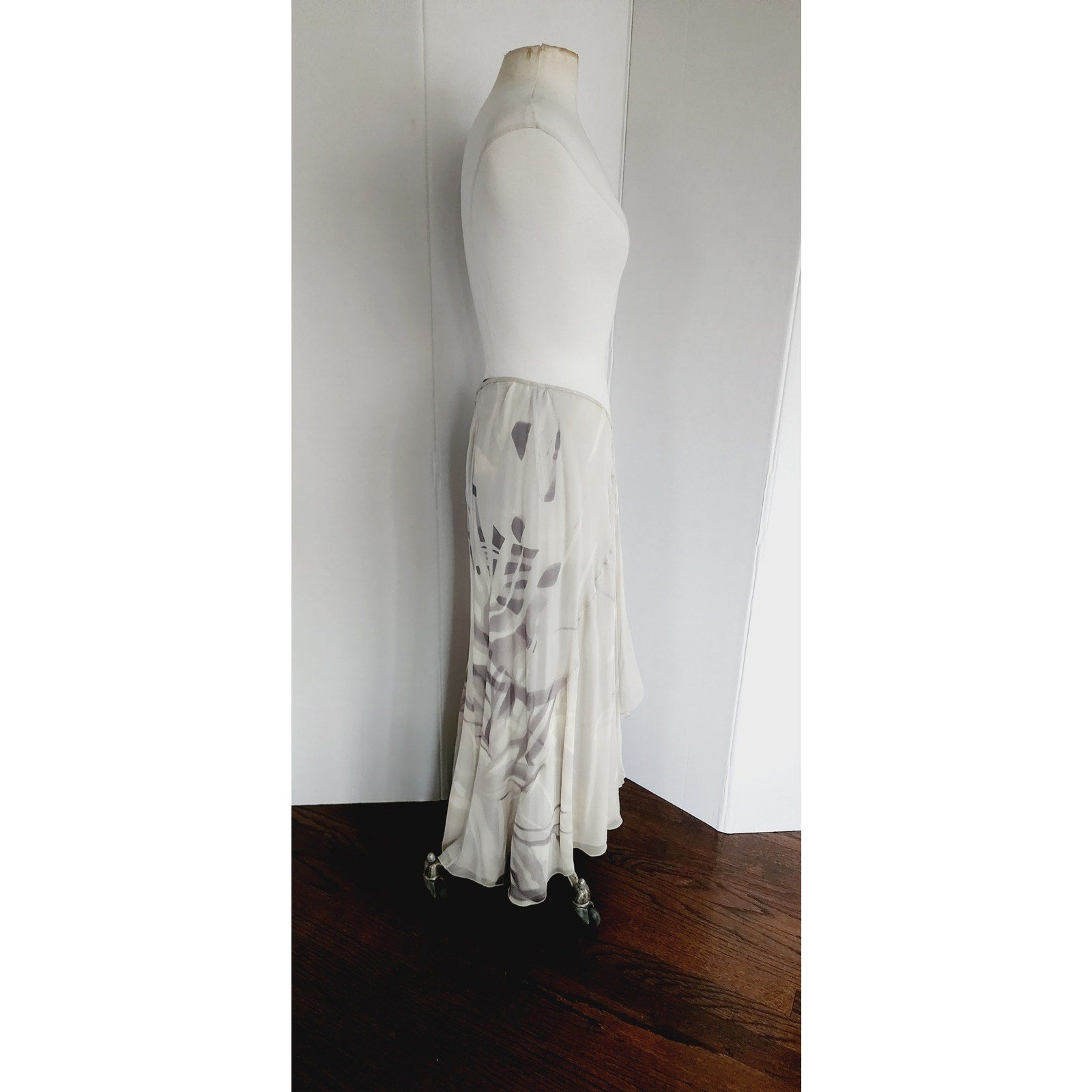 Long and flowy silk skirt with no waist band and zippered closure at the center rear, note the central front area that is gathered with a waterfall panel and shorter than the rest of the hem. The outer layer is silk chiffon and printed in abstract dark gray leafy pattern. A solid gray chiffon layer appears underneath.