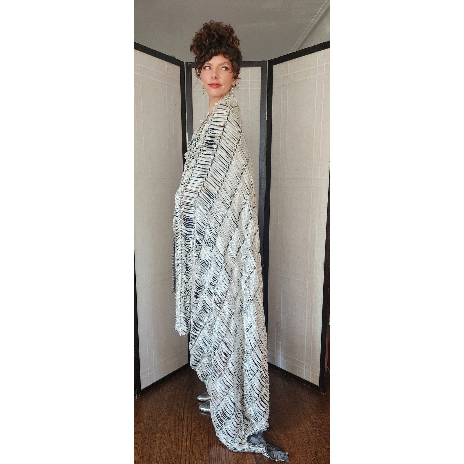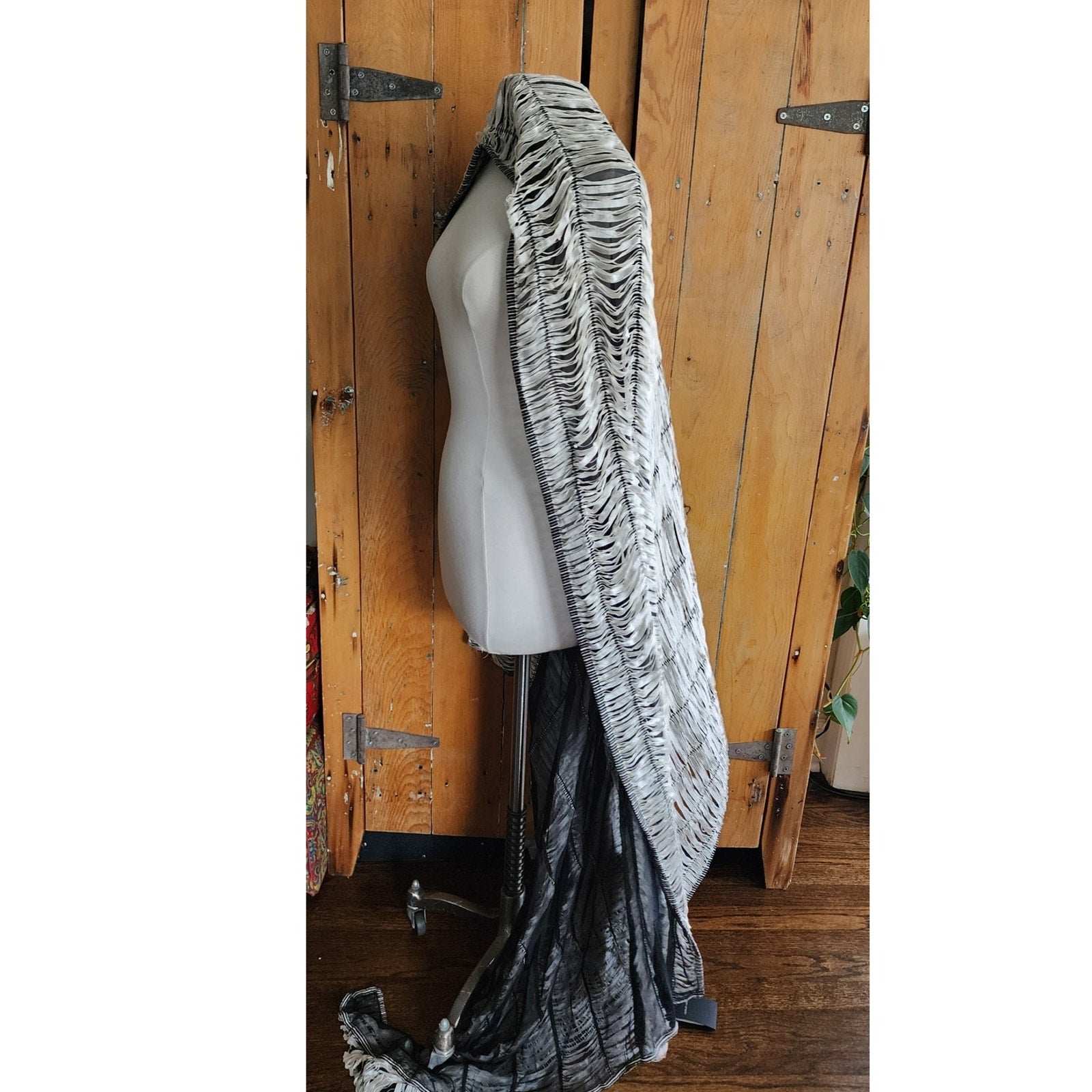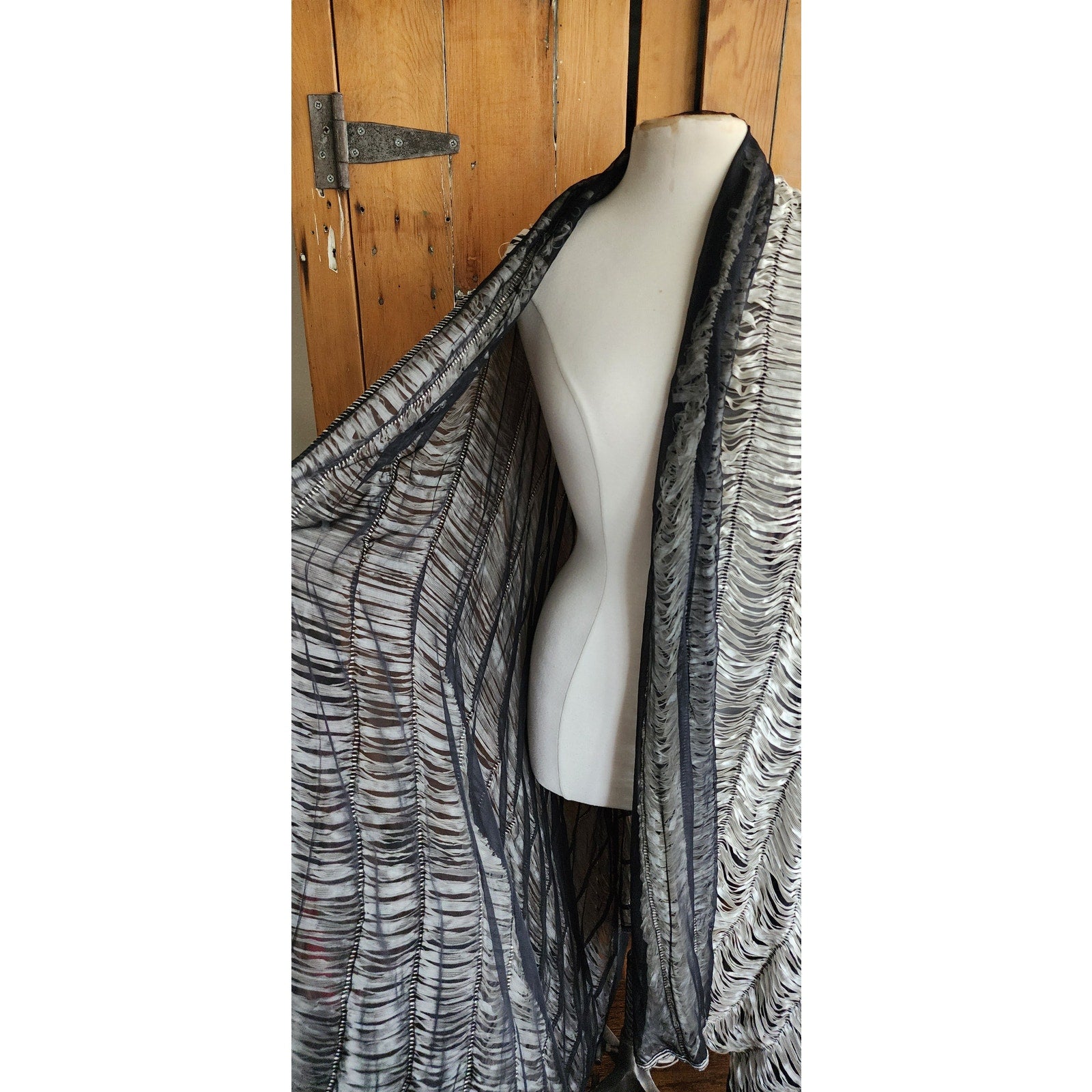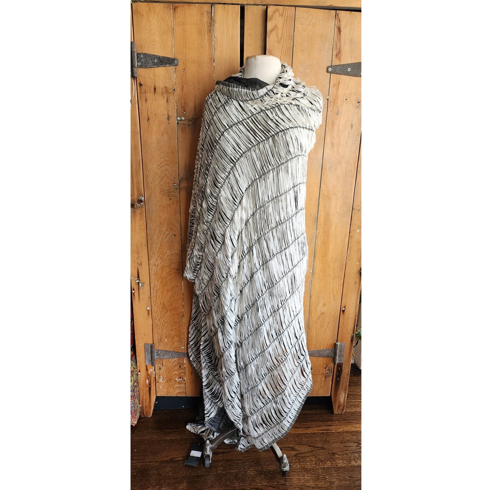 Floor length, voluminous silk wrap this beauty has a black mesh background over which white silk strands are stitched across the entire exterior in horizontal stripes. It creates a shredded aesthetic. Rectangular shape.