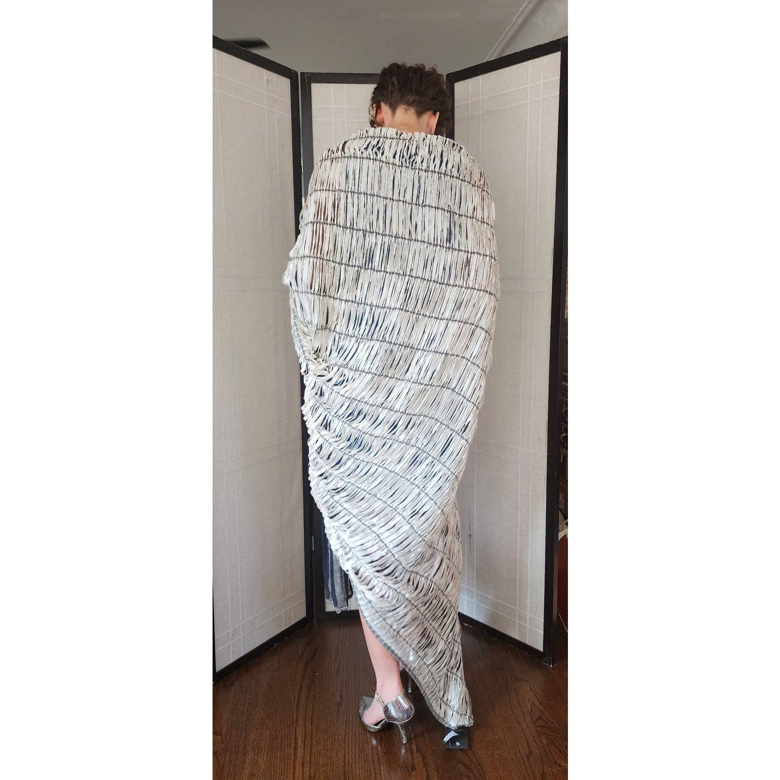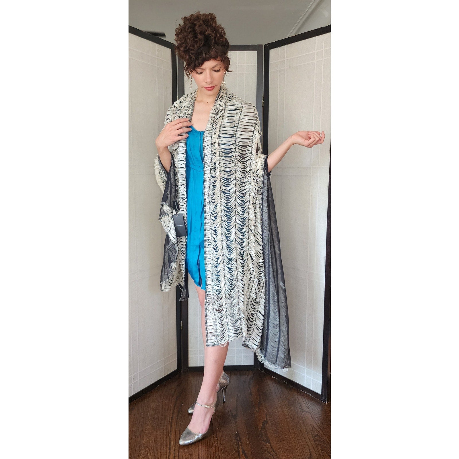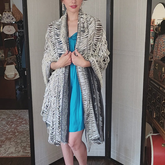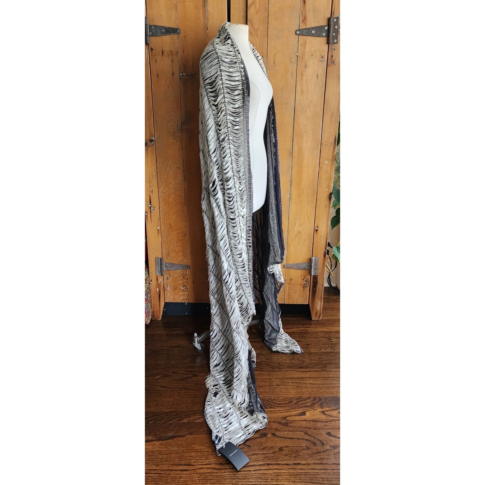 Floor length, voluminous silk wrap this beauty has a black mesh background over which white silk strands are stitched across the entire exterior in horizontal stripes. It creates a shredded aesthetic. Rectangular shape.