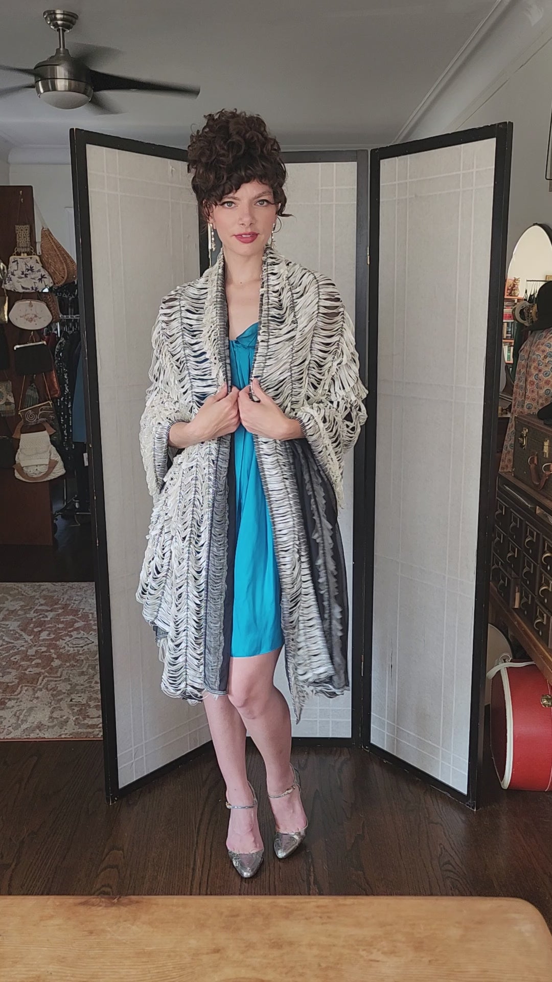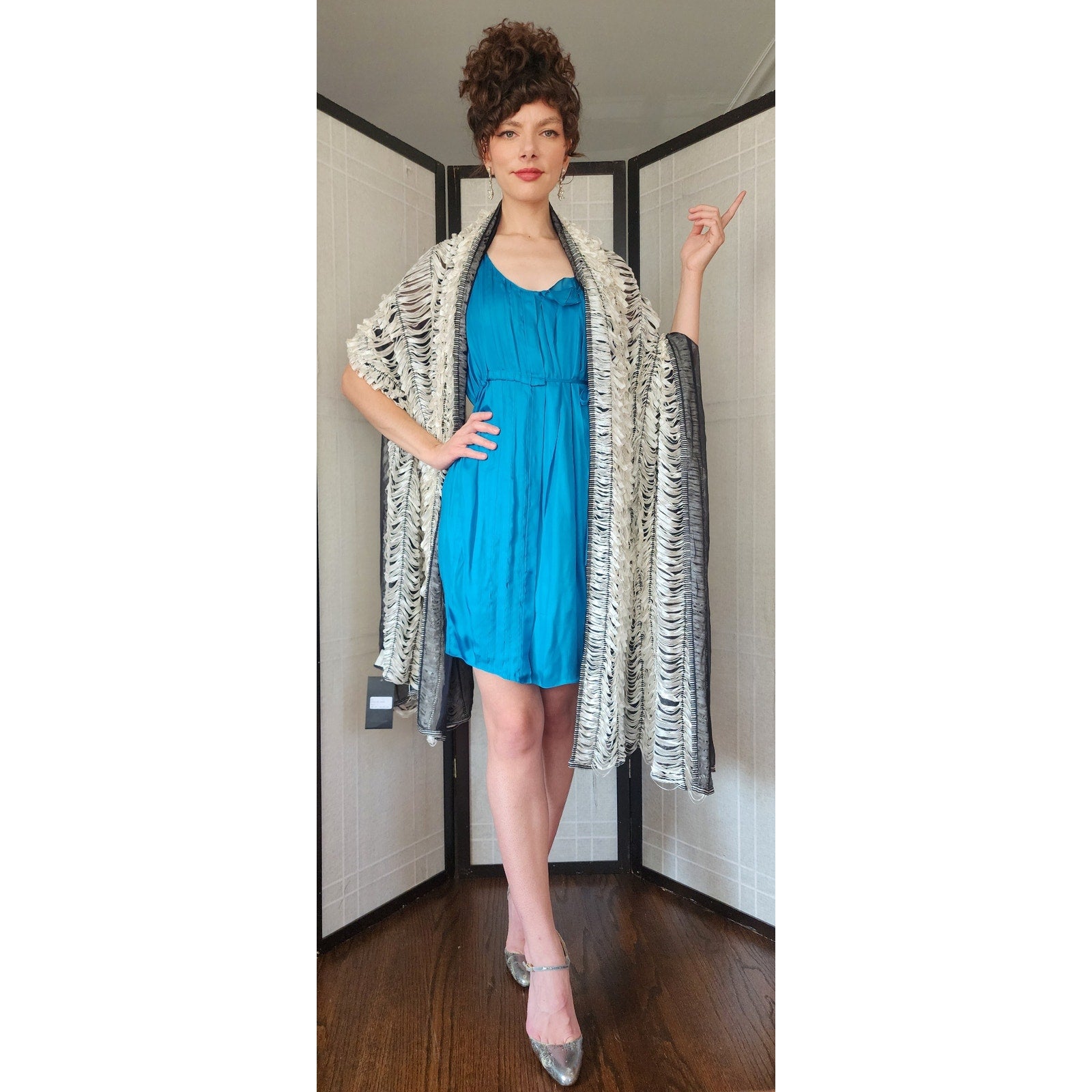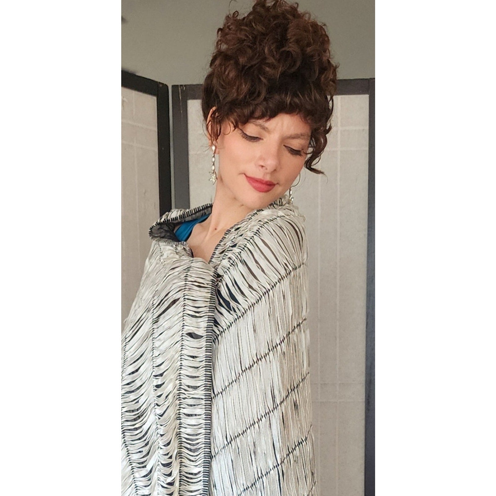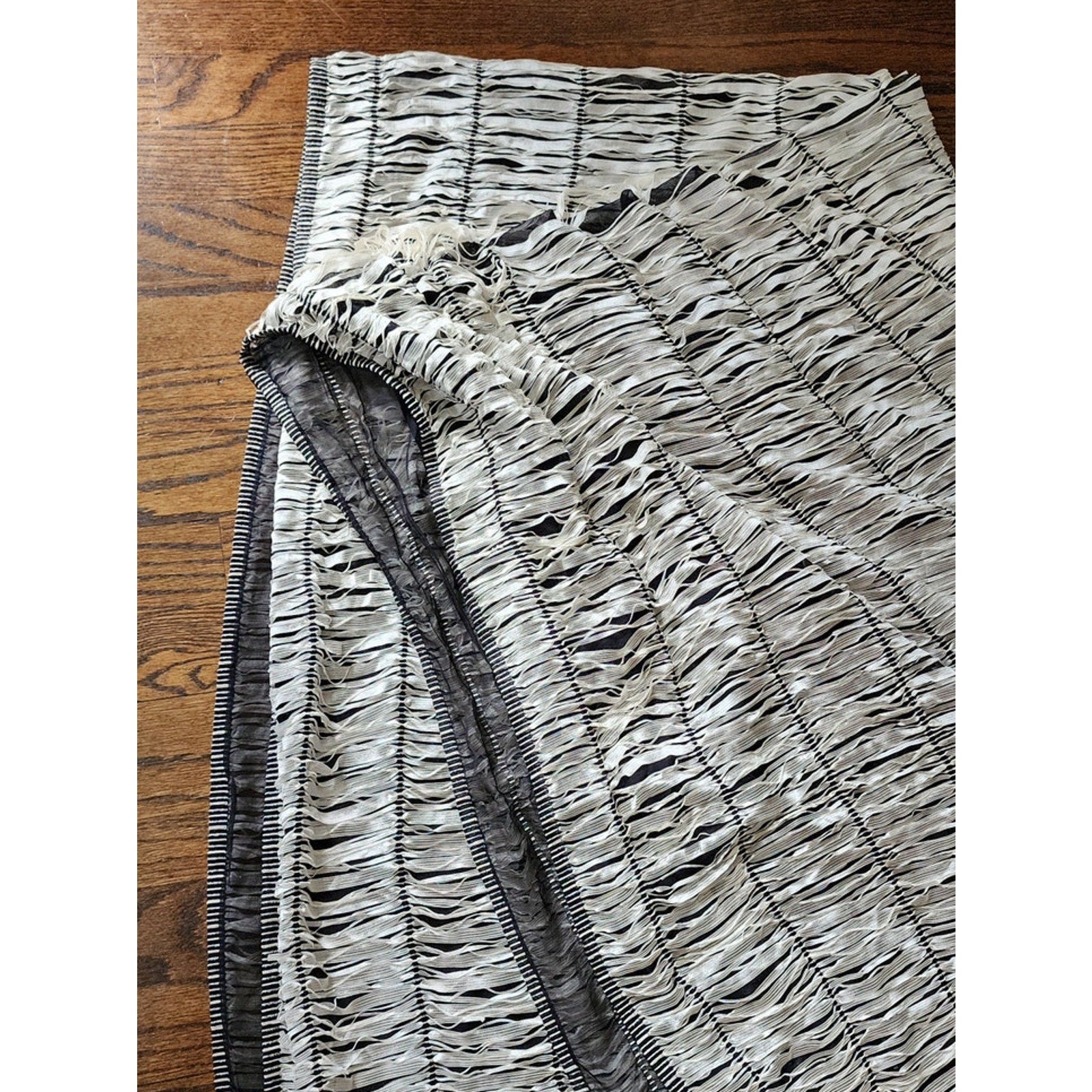 Floor length, voluminous silk wrap this beauty has a black mesh background over which white silk strands are stitched across the entire exterior in horizontal stripes. It creates a shredded aesthetic. Rectangular shape.