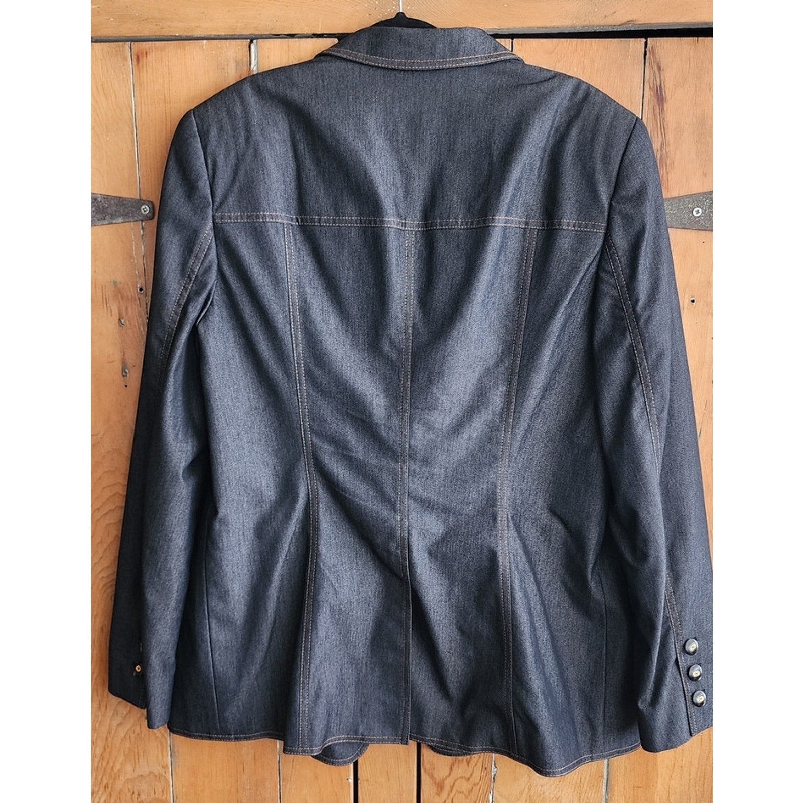 Hip length blazer and matching pants set in a very dark bluish-gray denim wash.
