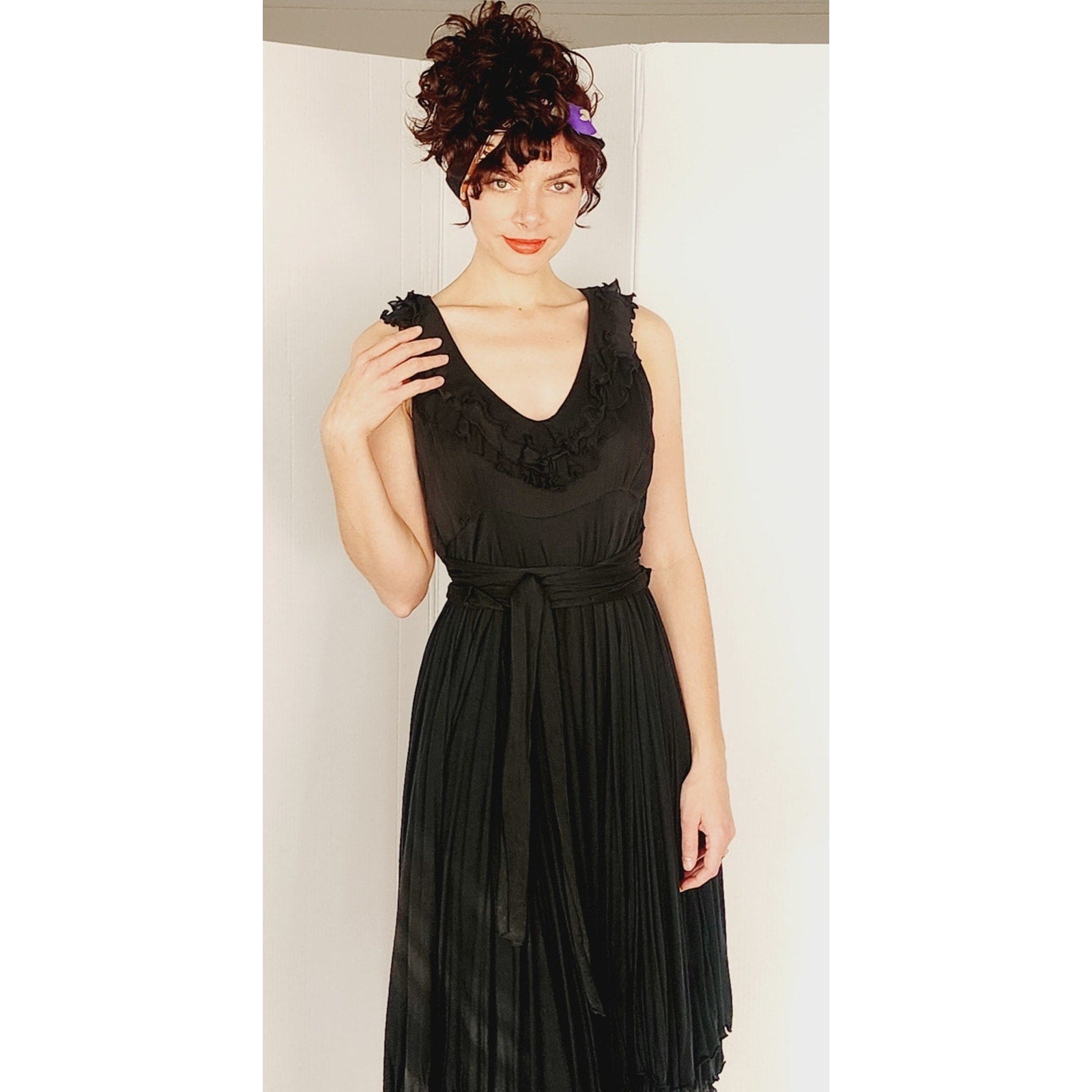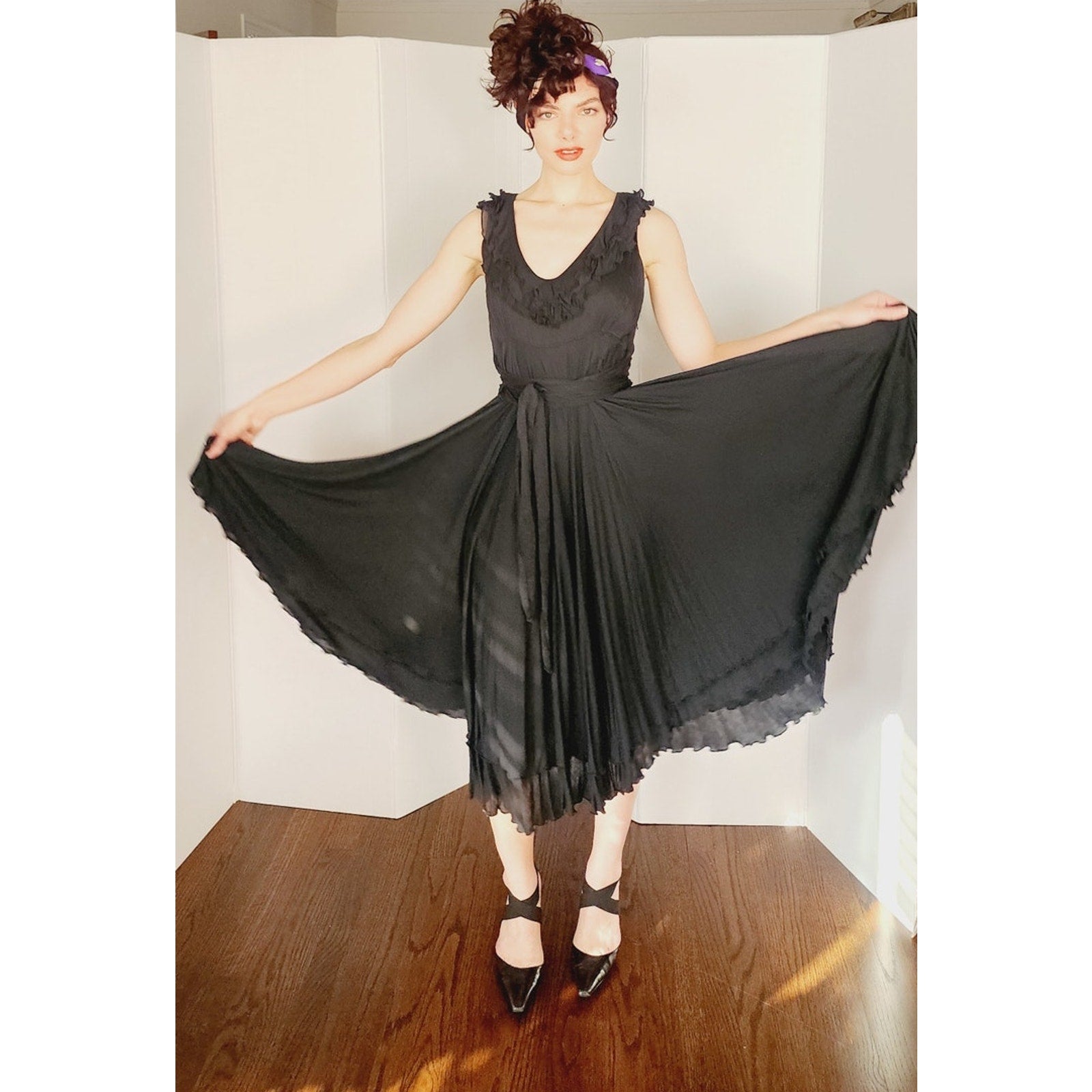 Sleeveless, scoop neck dress in a black, stretchy cotton-silk blend, it has a fitted chest, a nipped waist thanks to the voluminous, sash tie belt in silk, and two layers of a circle skirt with ruffled edges, falling asymmetrically shorter on the sides. Pulls on overhead.