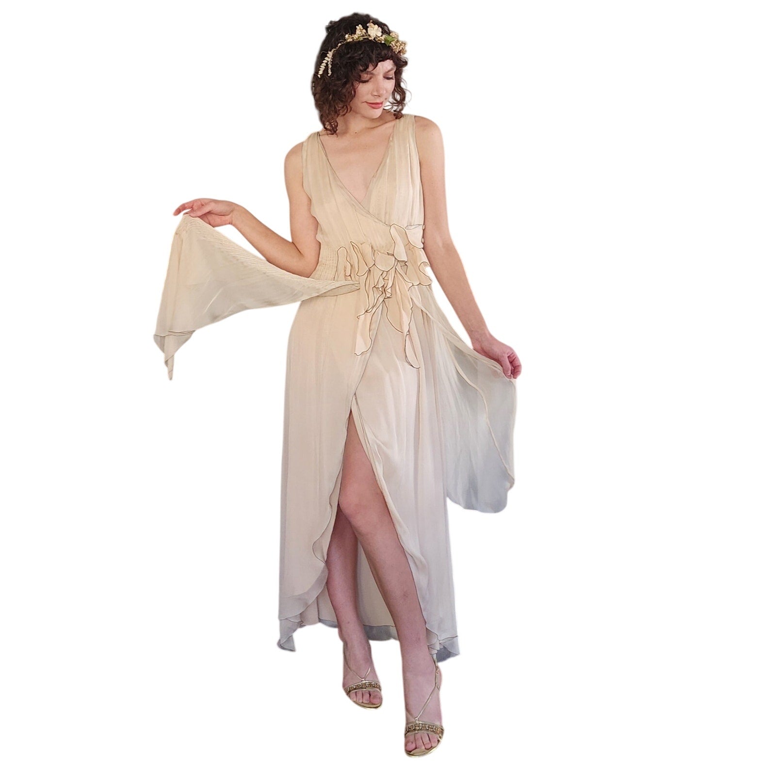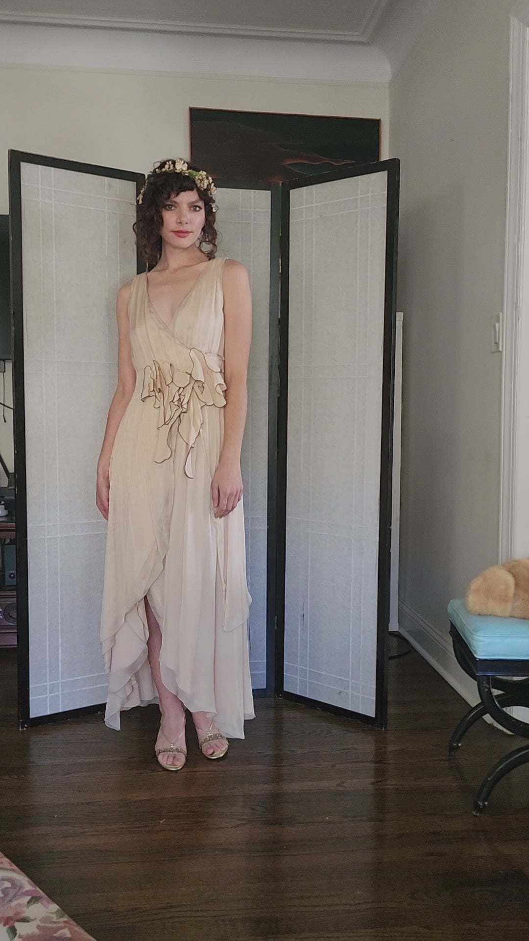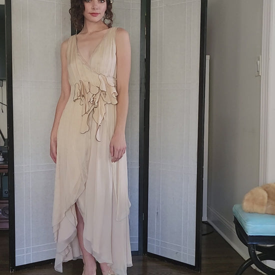Exquisite early 2000s evening dress, this strapless piece by Fendi is an elegant cascade of cream chiffon that goes in the wrap/robe style, closing at the left side waist with buttons. This creates a plunging V neckline and a large, curved, and very sensual slit at front center of the ankle length skirt. The waist line is decorated with a series of petals/leaves/ruffles, outlined in a solid black trim, on top of decorative, vertical, pleated stitches on the scarf panel on the right side.. Note the unusually asymmetrical slit at the back, upper right side. Fully lined.