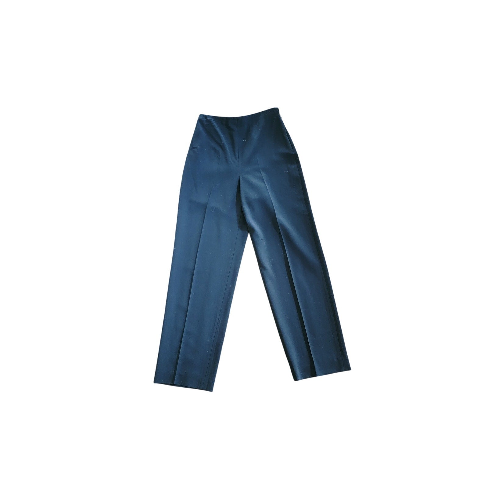 Classic, Y2K era, ladies dress pants that are high waisted and feature a flat front, and a creased leg line that tapers. Closes with a hidden side zipper. Unlined.