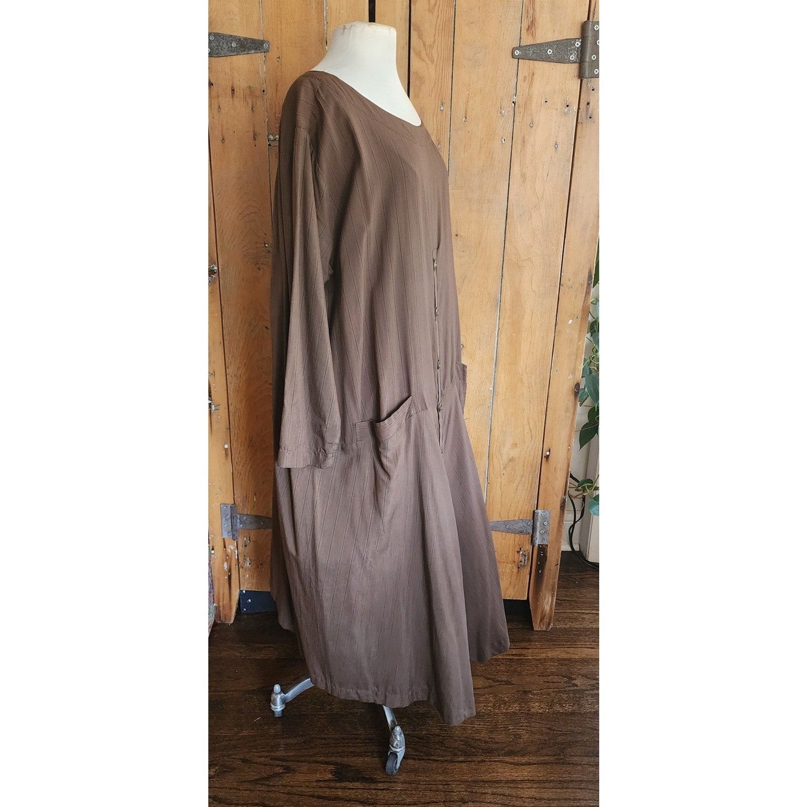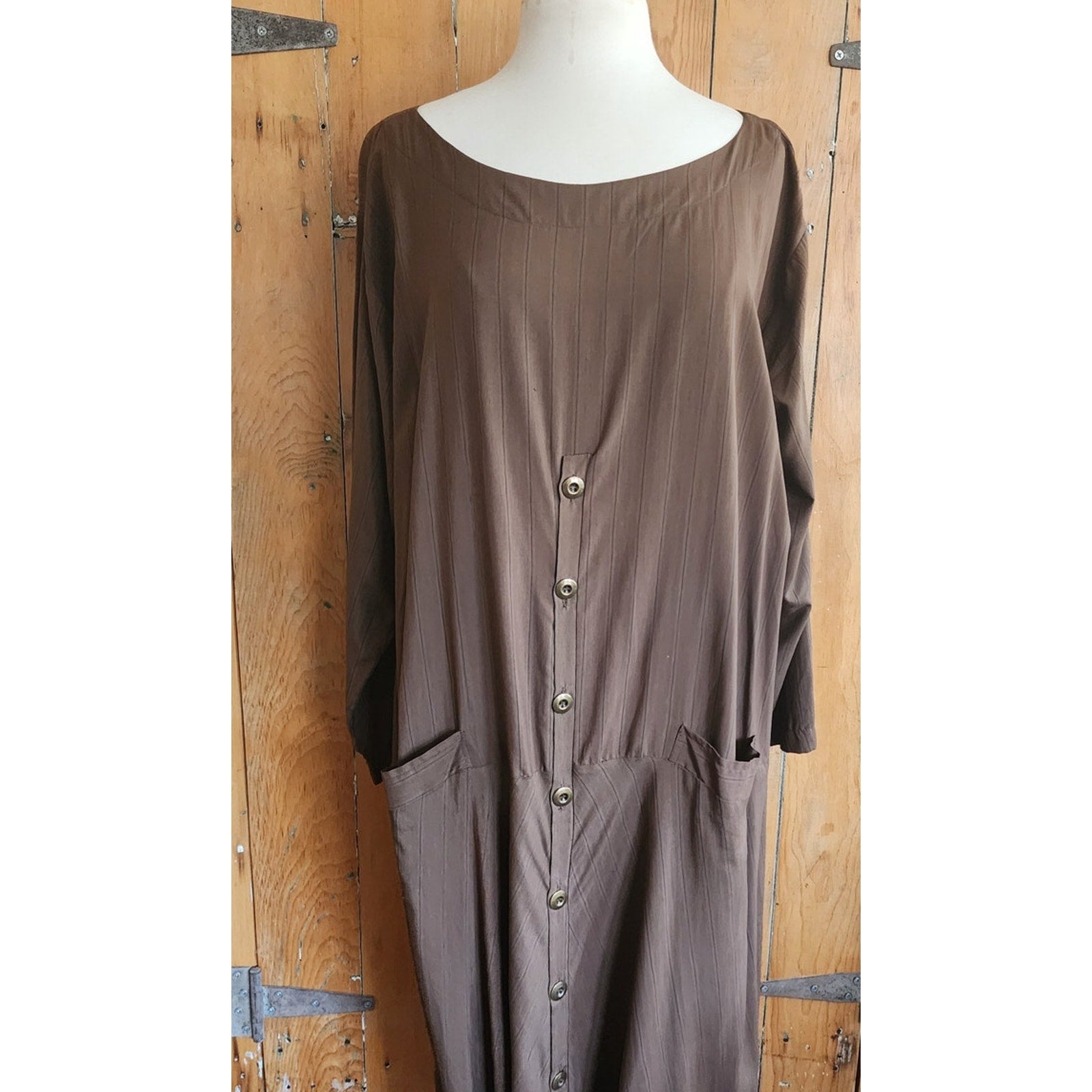 An excellent example of art clothes by the seminal designer, this is an oversized/one size fits all frock that is collarless, with long sleeves, a loose silhouette and pockets at the hip fronts. It has button down closure at center front, from the center of the torso down to the hem. The rear echoes this design but with a shorter hem. Unlined.