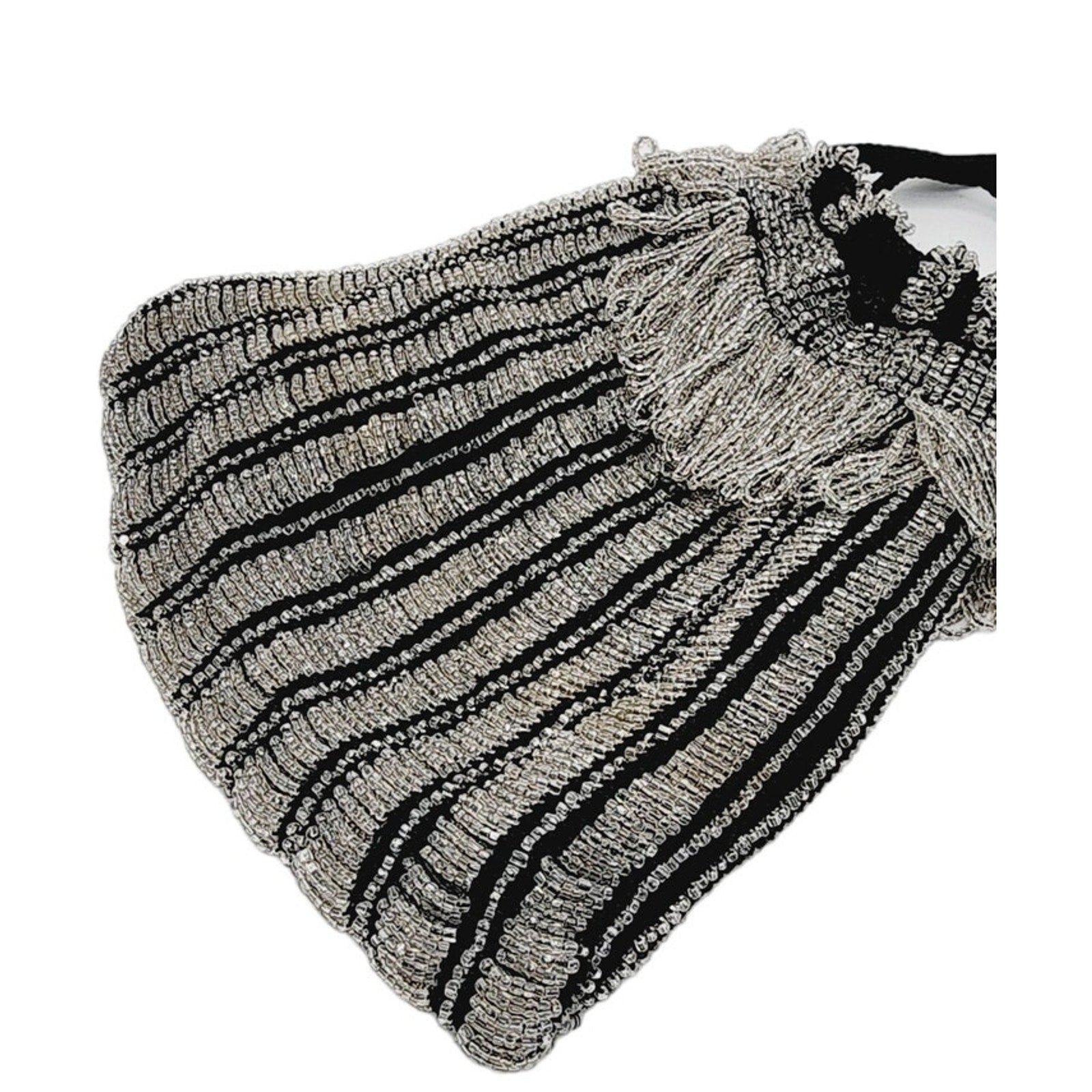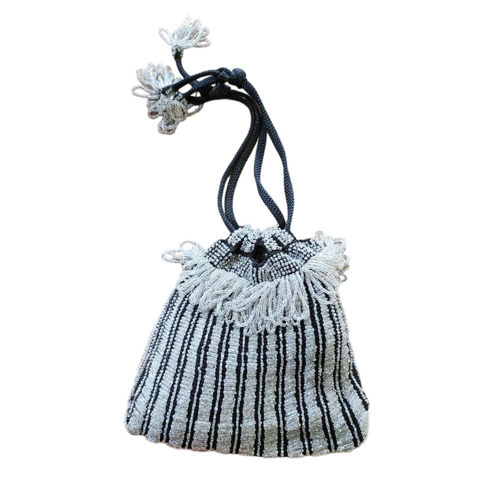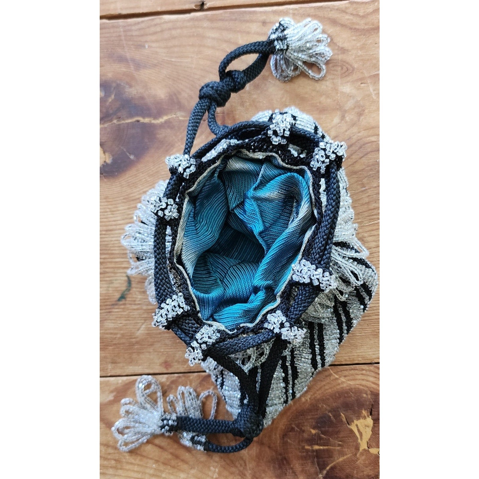 Exquisite, sack like, soft bodied bag in black crochet, covered in vertical rows of silvery, translucent beads, with a row of looped fringe around the top, and a section of horizontal beaded rows around the opening. It has drawstring closure with black, braided ribbon straps, ringed with beaded loops and ending at looped, beaded fringe. Interior is lined in blue satin. No labels.