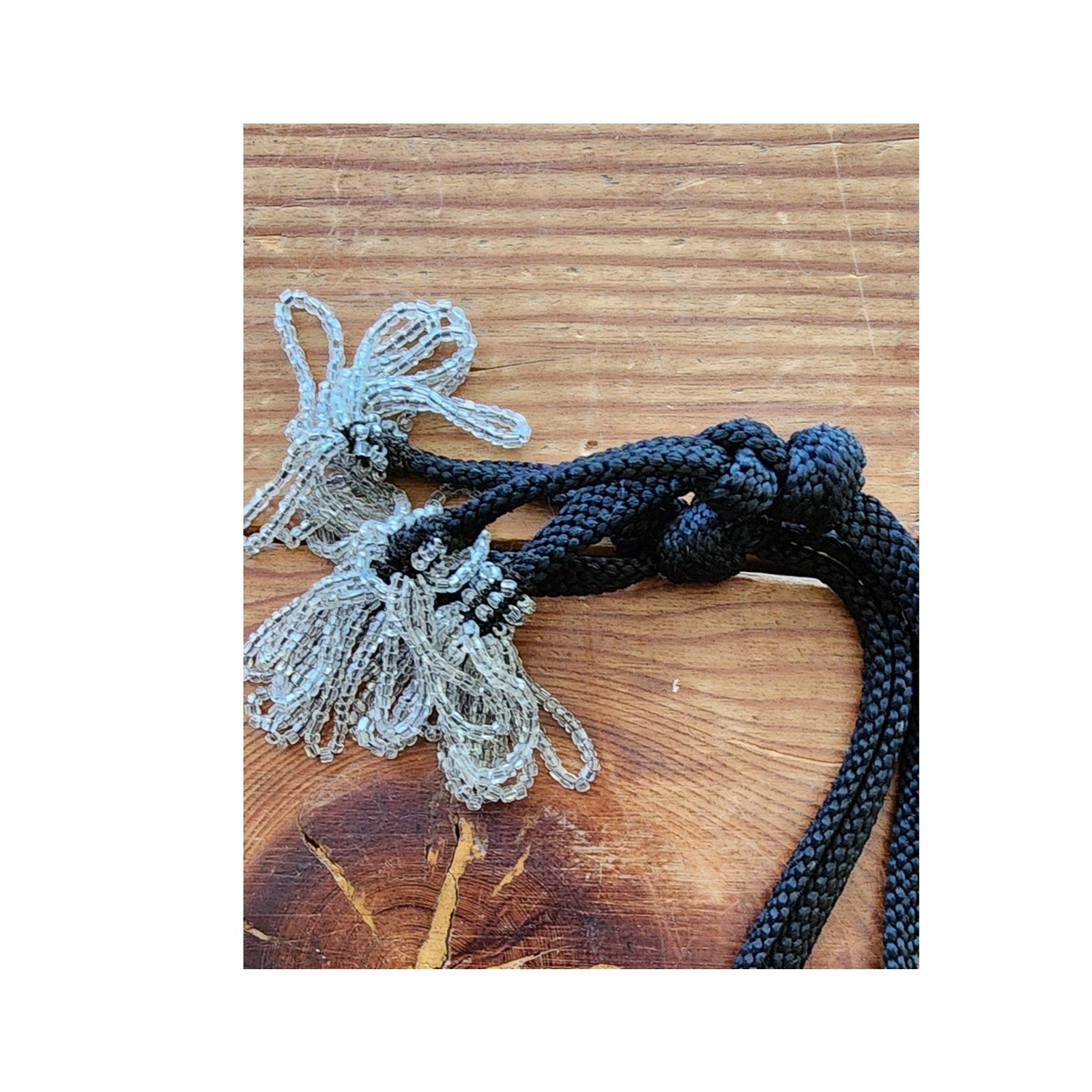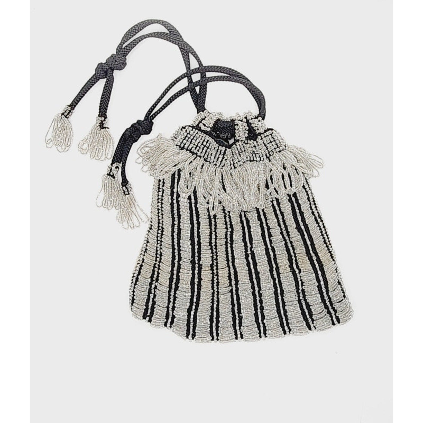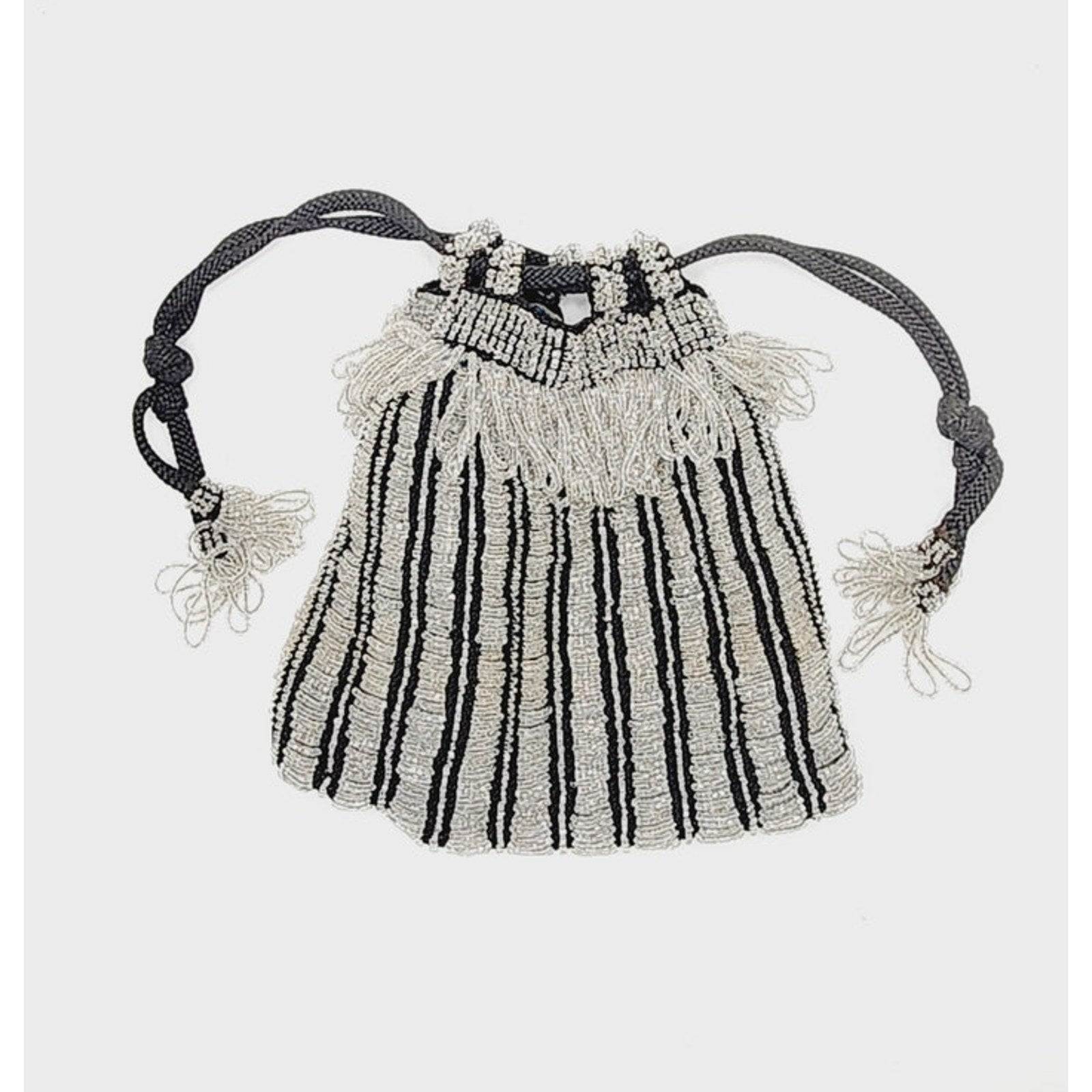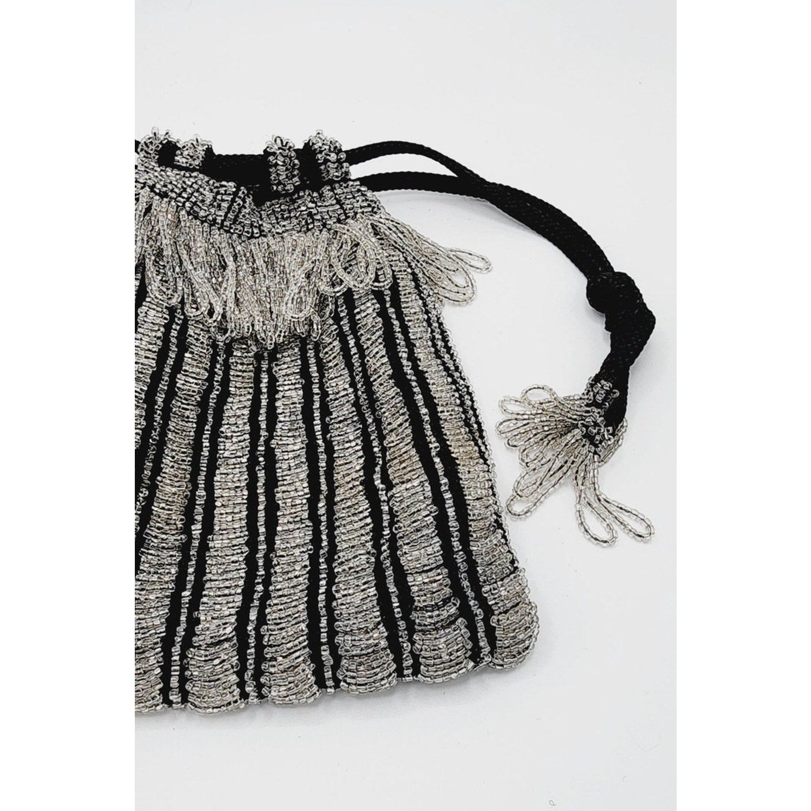 Exquisite, sack like, soft bodied bag in black crochet, covered in vertical rows of silvery, translucent beads, with a row of looped fringe around the top, and a section of horizontal beaded rows around the opening. It has drawstring closure with black, braided ribbon straps, ringed with beaded loops and ending at looped, beaded fringe. Interior is lined in blue satin. No labels.