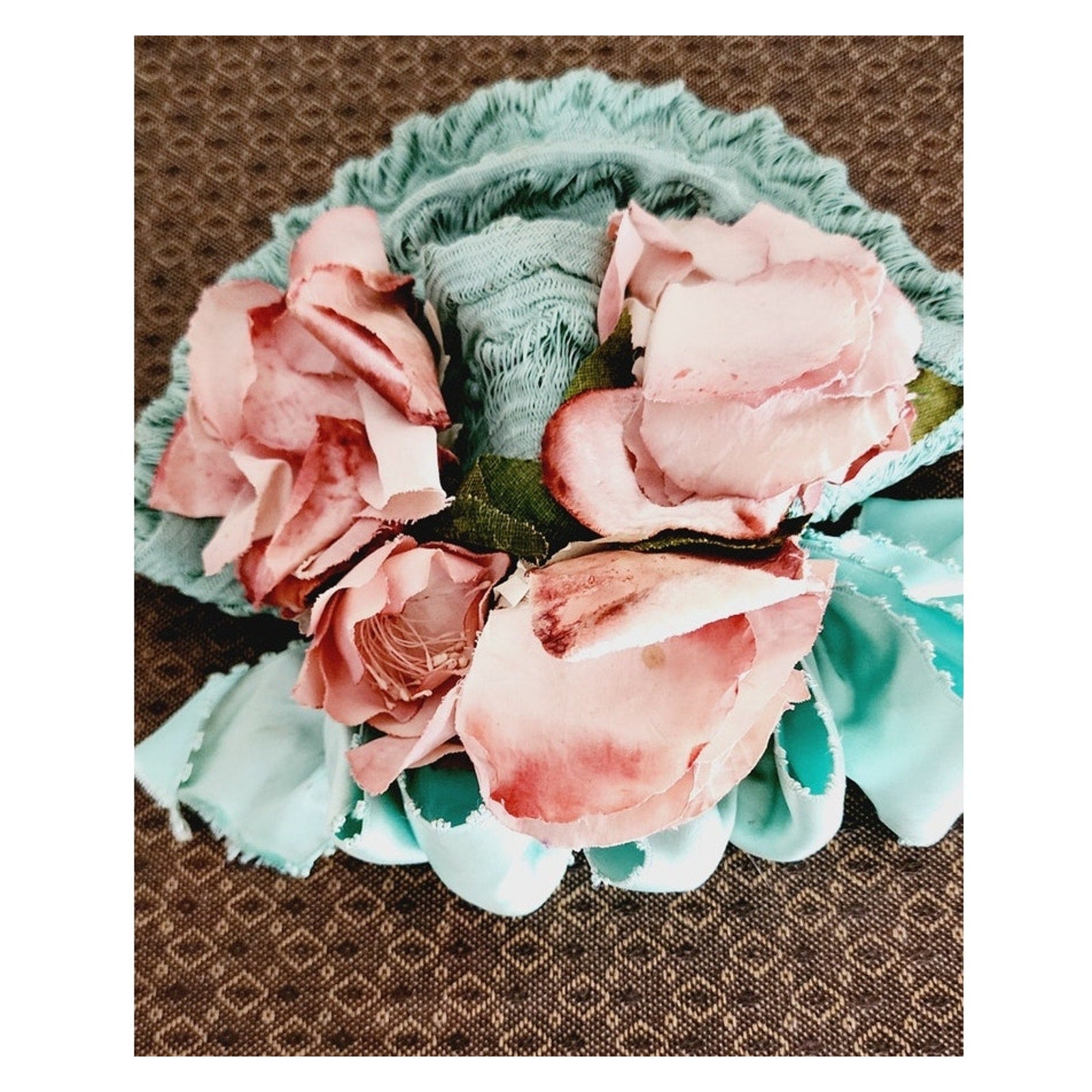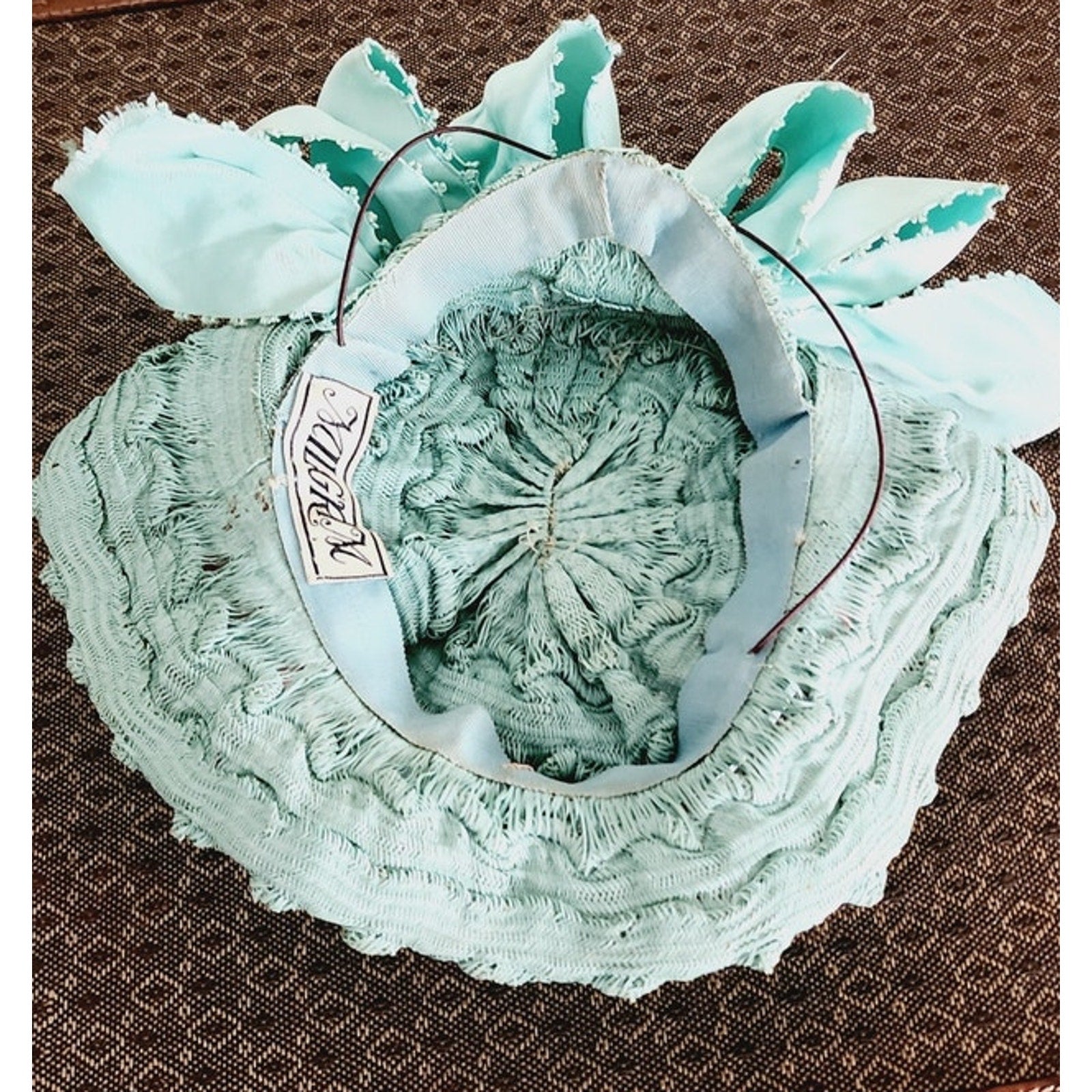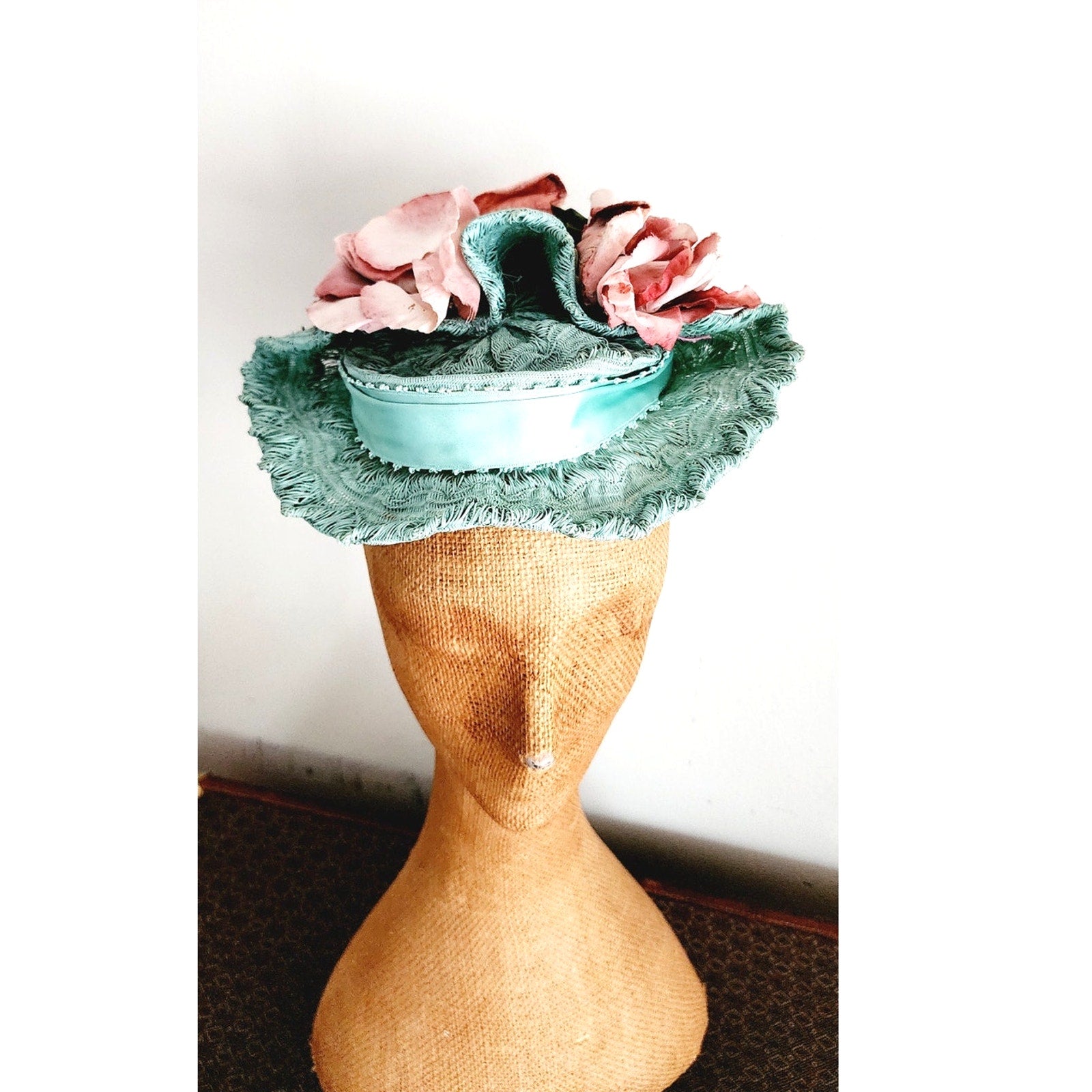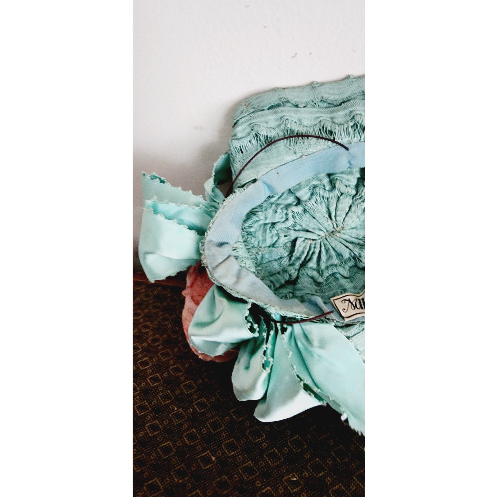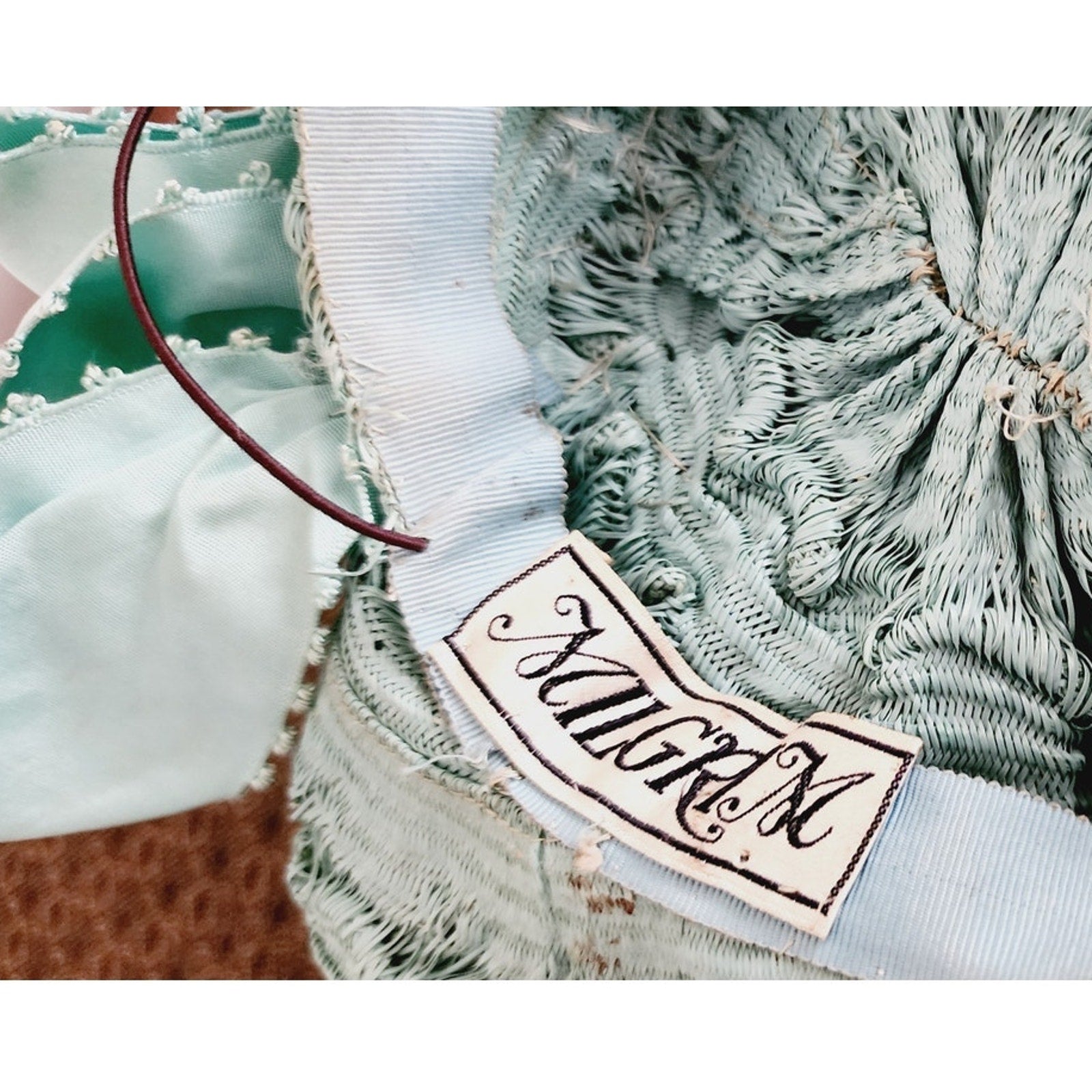 This one is in a sea foam straw trimmed in matching satin ribbon around the crown and displaying a large bow flourishing at the rear. Top of the crown is festooned with velvet and silk pink colored flowers. Interior has a petersham, an elastic strap to keep the hat in place on the head, and the Milgrim label.